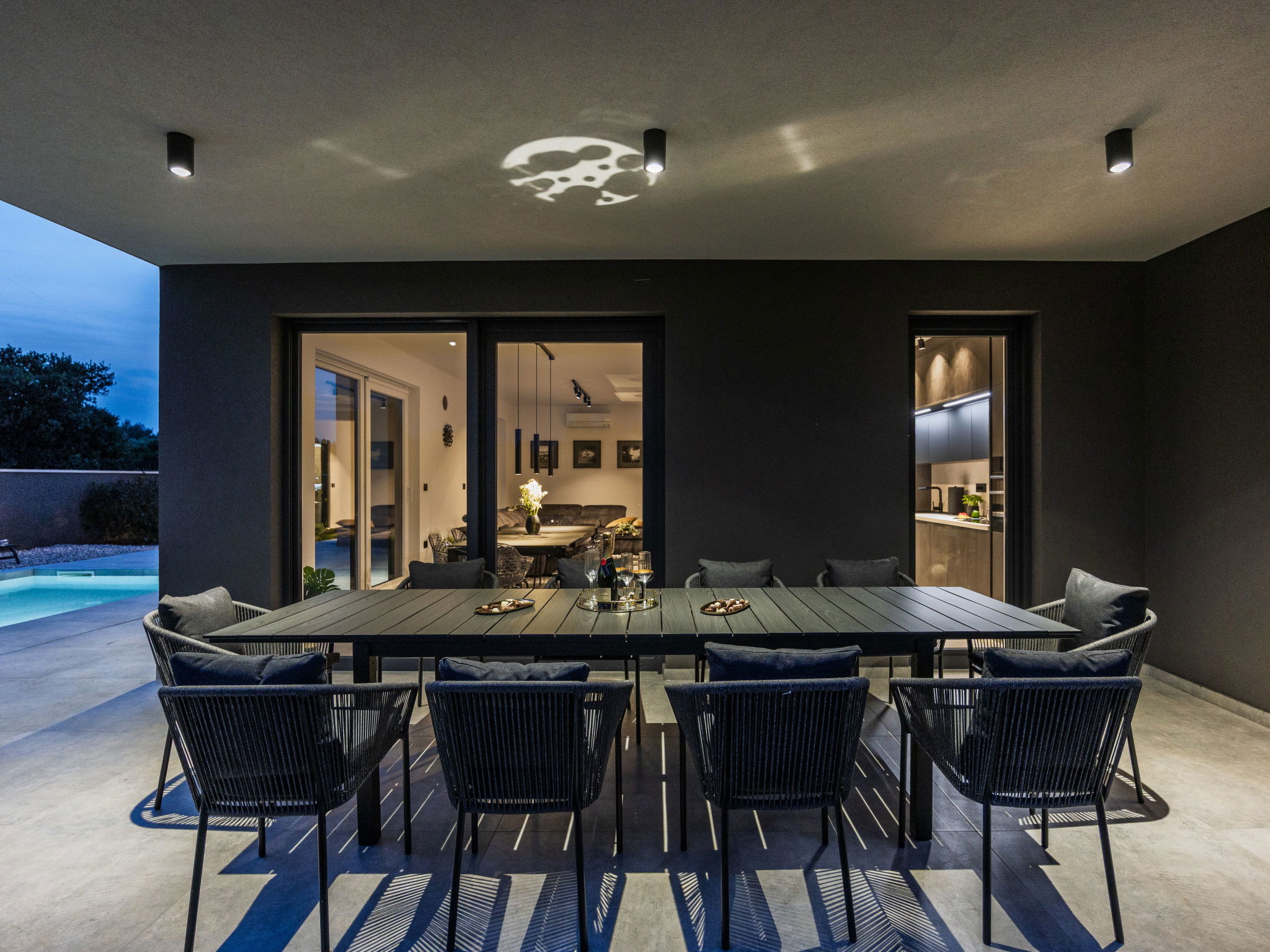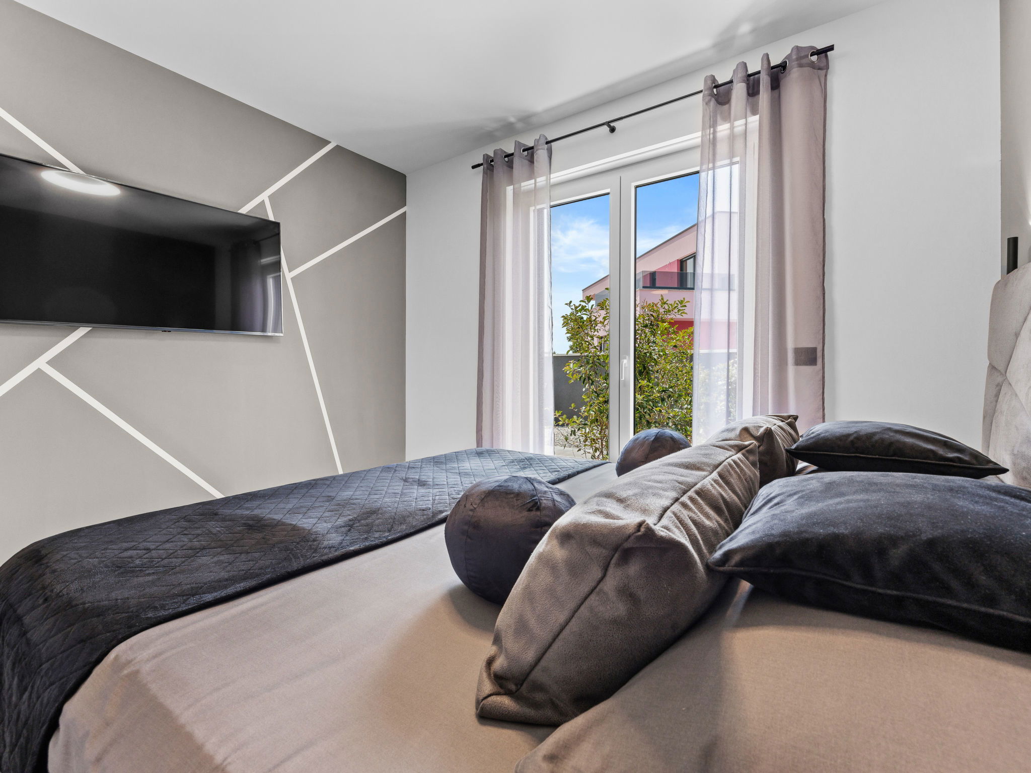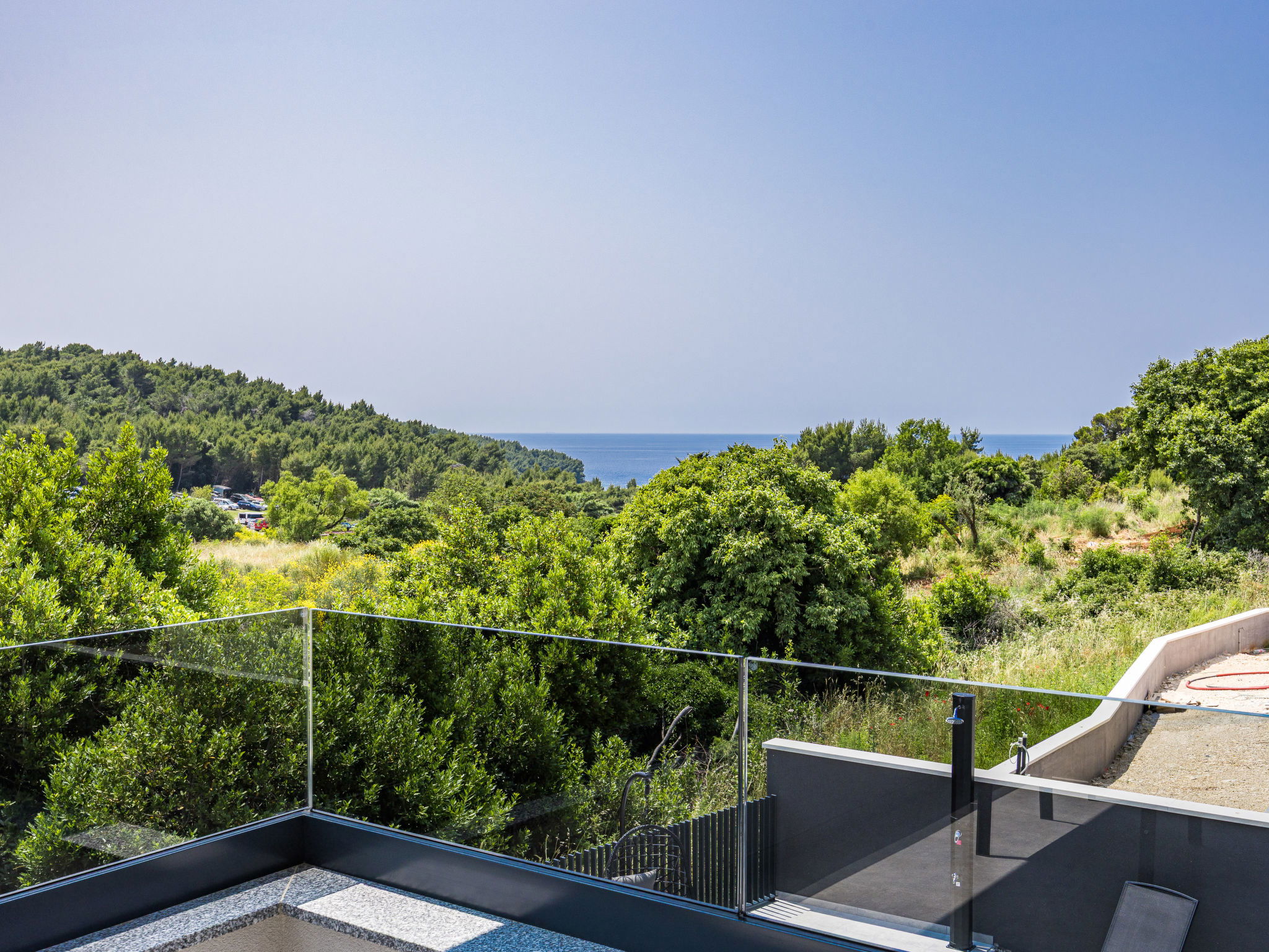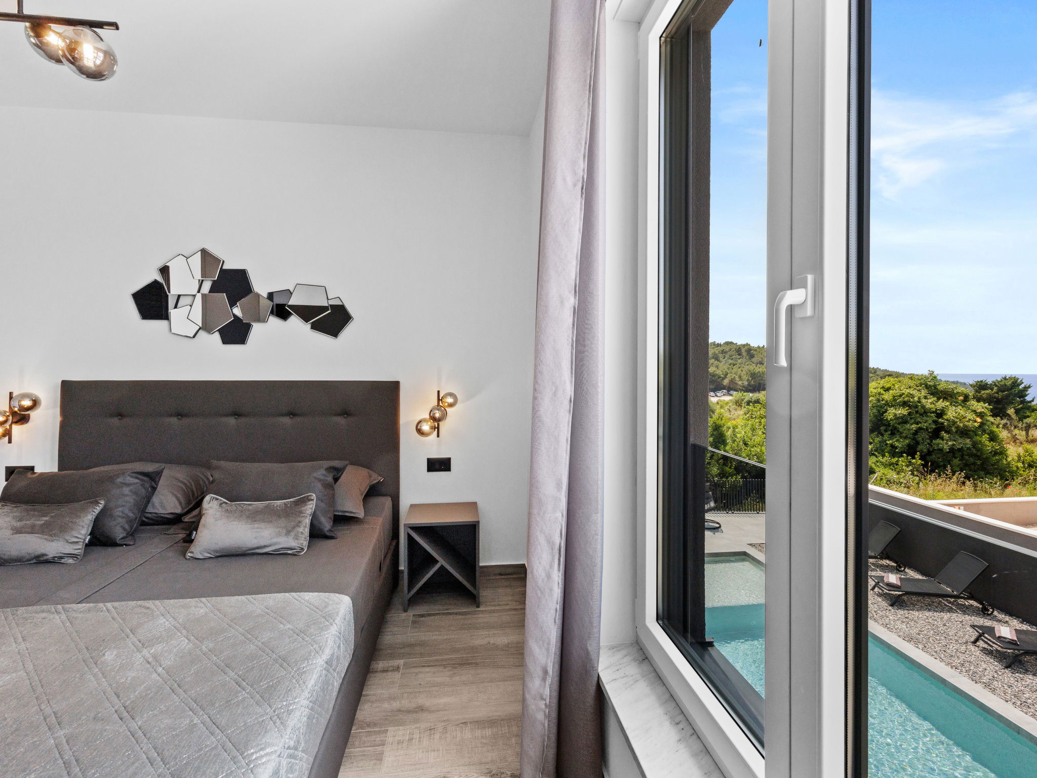 Premantura 11 km from Pula: Beautiful villa "Delecto", 2 storeys, built in 2025. 250 m from the centre of Premantura, in a sunny position, 500 m from the sea, 500 m from the beach. Private: property 600 m2 (fenced), garden with wildlife garden, swimming pool angular (8 x 4 m, depth 140 cm, seasonal availability: 04.Apr. - 10.Oct.) with internal staircase. Outdoor shower, terrace (15 m2), barbecue, pool maintenance by the owner/gardener. In the house: internet access, washing machine. Parking (for 3 cars) at the house on the premises. Shop 250 m, supermarket 4.5 km, restaurant 50 m, bus stop 220 m, pebble beach 2.5 km, rocky beach 500 m. Surf school 2.5 km, tennis 750 m, riding stable 10 km, walking paths from the house 100 m, cycle lane 150 m. Nearby attractions: Nature park Kamenjak 650 m. Groups of teenagers on request only. Neighbourhood highly sensitive to noise. Quietness and good behaviour expected. Swimming pool with hydromassage.