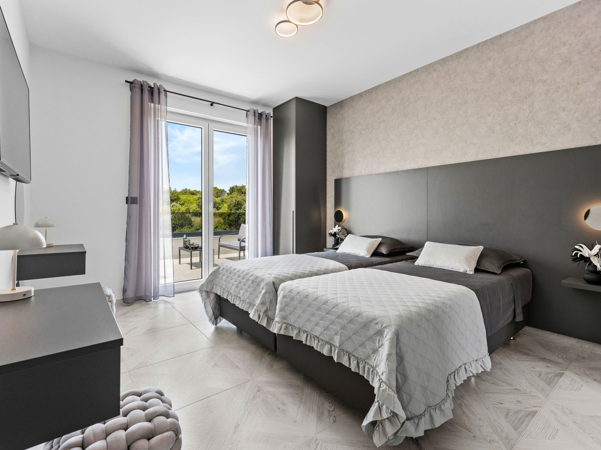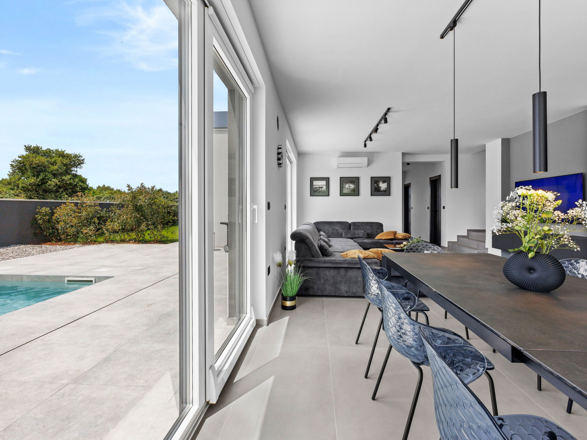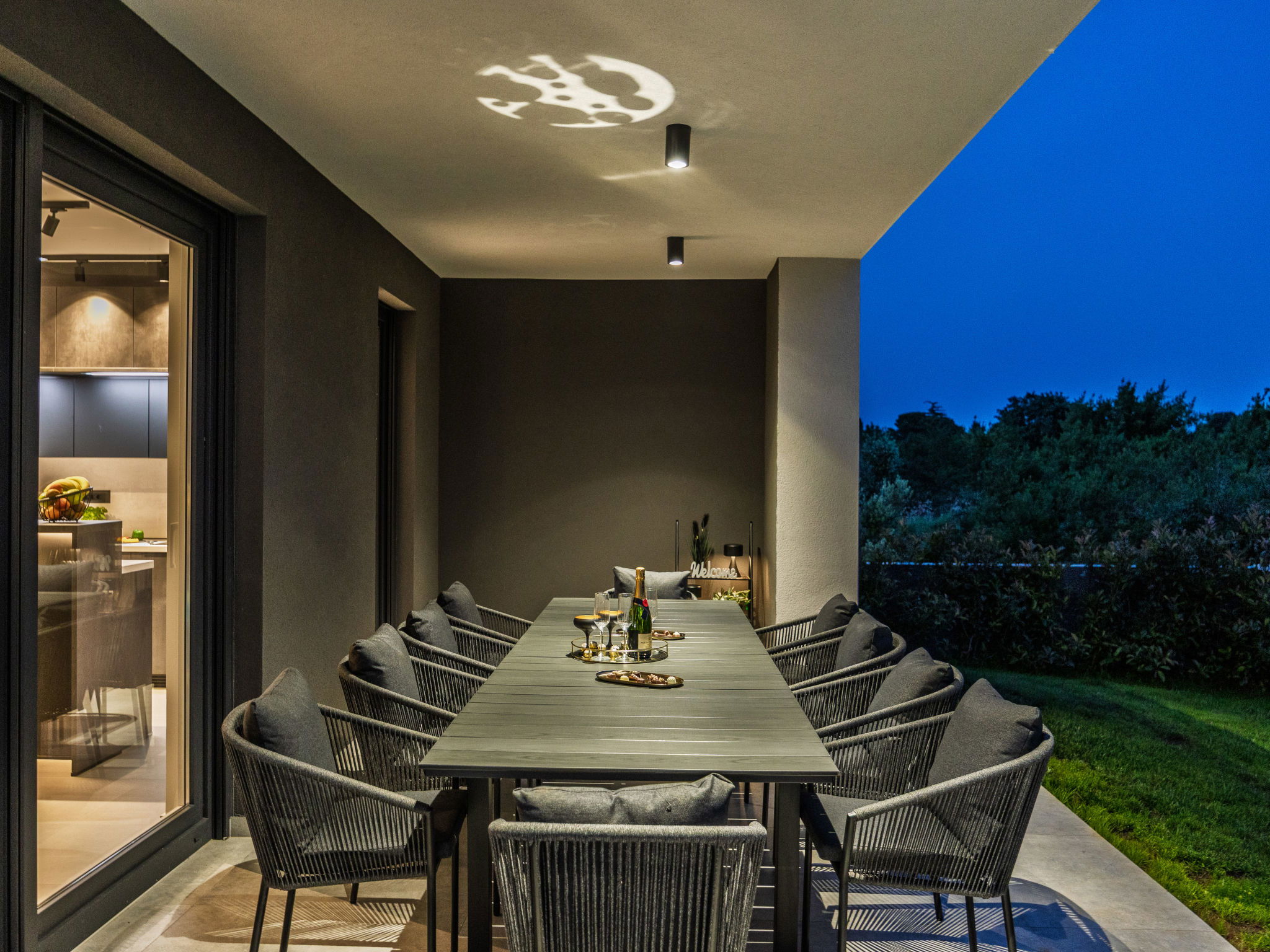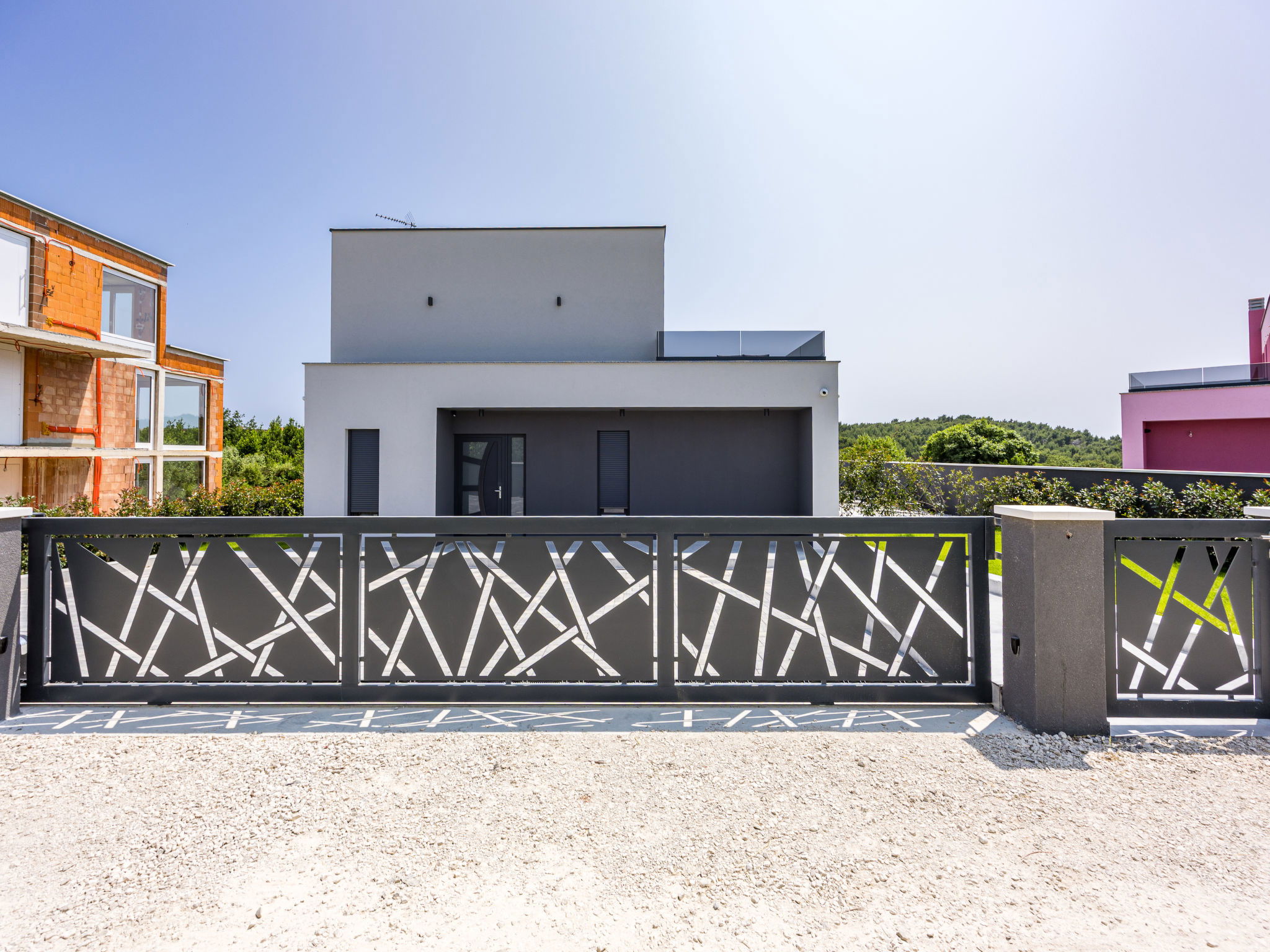 Premantura 11 km from Pula: Beautiful villa "Delecto", 2 storeys, built in 2025. 250 m from the centre of Premantura, in a sunny position, 500 m from the sea, 500 m from the beach. Private: property 600 m2 (fenced), garden with wildlife garden, swimming pool angular (8 x 4 m, depth 140 cm, seasonal availability: 04.Apr. - 10.Oct.) with internal staircase. Outdoor shower, terrace (15 m2), barbecue, pool maintenance by the owner/gardener. In the house: internet access, washing machine. Parking (for 3 cars) at the house on the premises. Shop 250 m, supermarket 4.5 km, restaurant 50 m, bus stop 220 m, pebble beach 2.5 km, rocky beach 500 m. Surf school 2.5 km, tennis 750 m, riding stable 10 km, walking paths from the house 100 m, cycle lane 150 m. Nearby attractions: Nature park Kamenjak 650 m. Groups of teenagers on request only. Neighbourhood highly sensitive to noise. Quietness and good behaviour expected. Swimming pool with hydromassage.