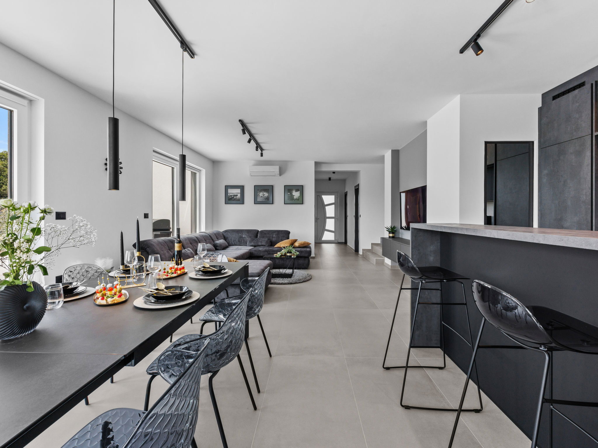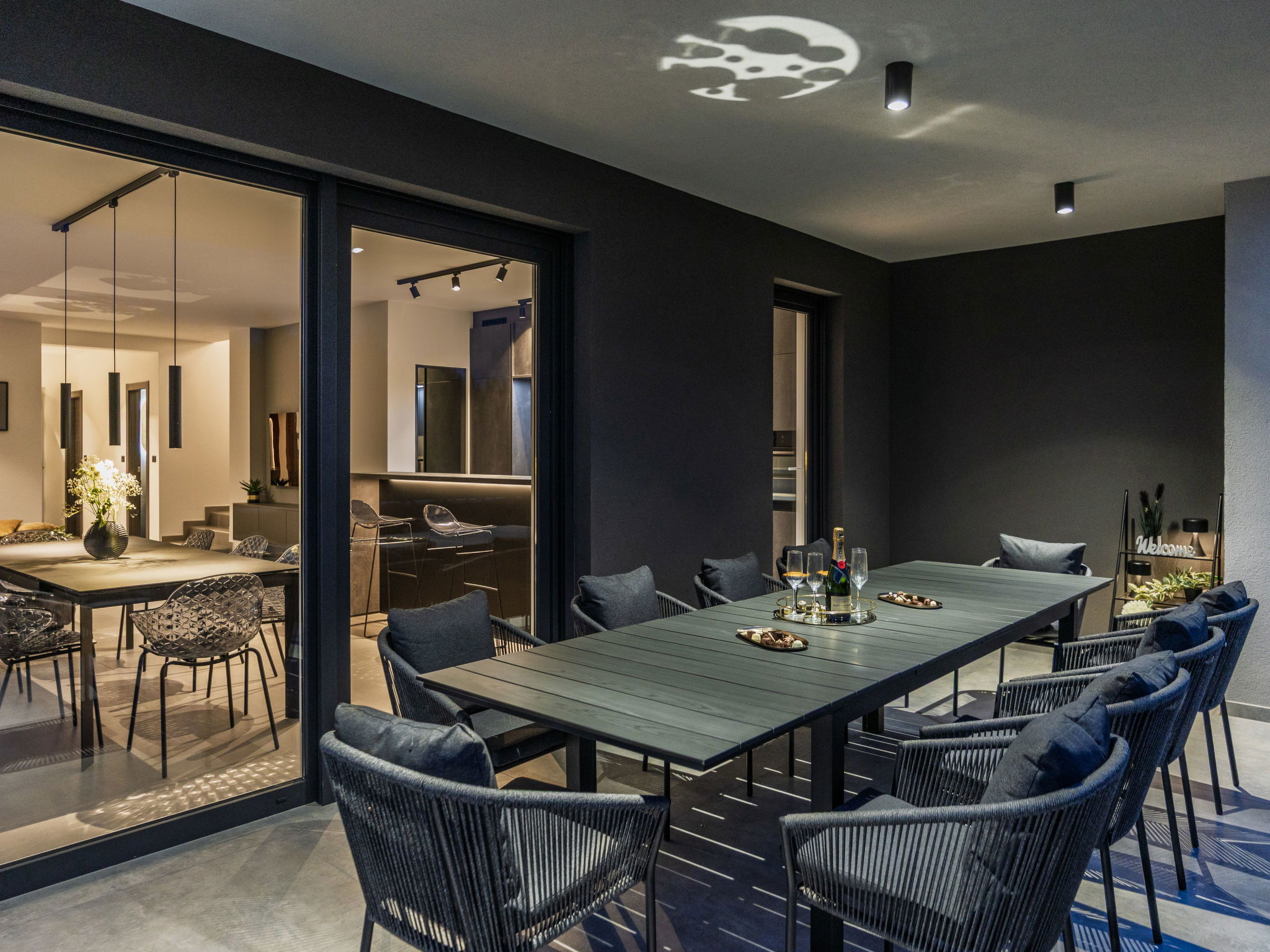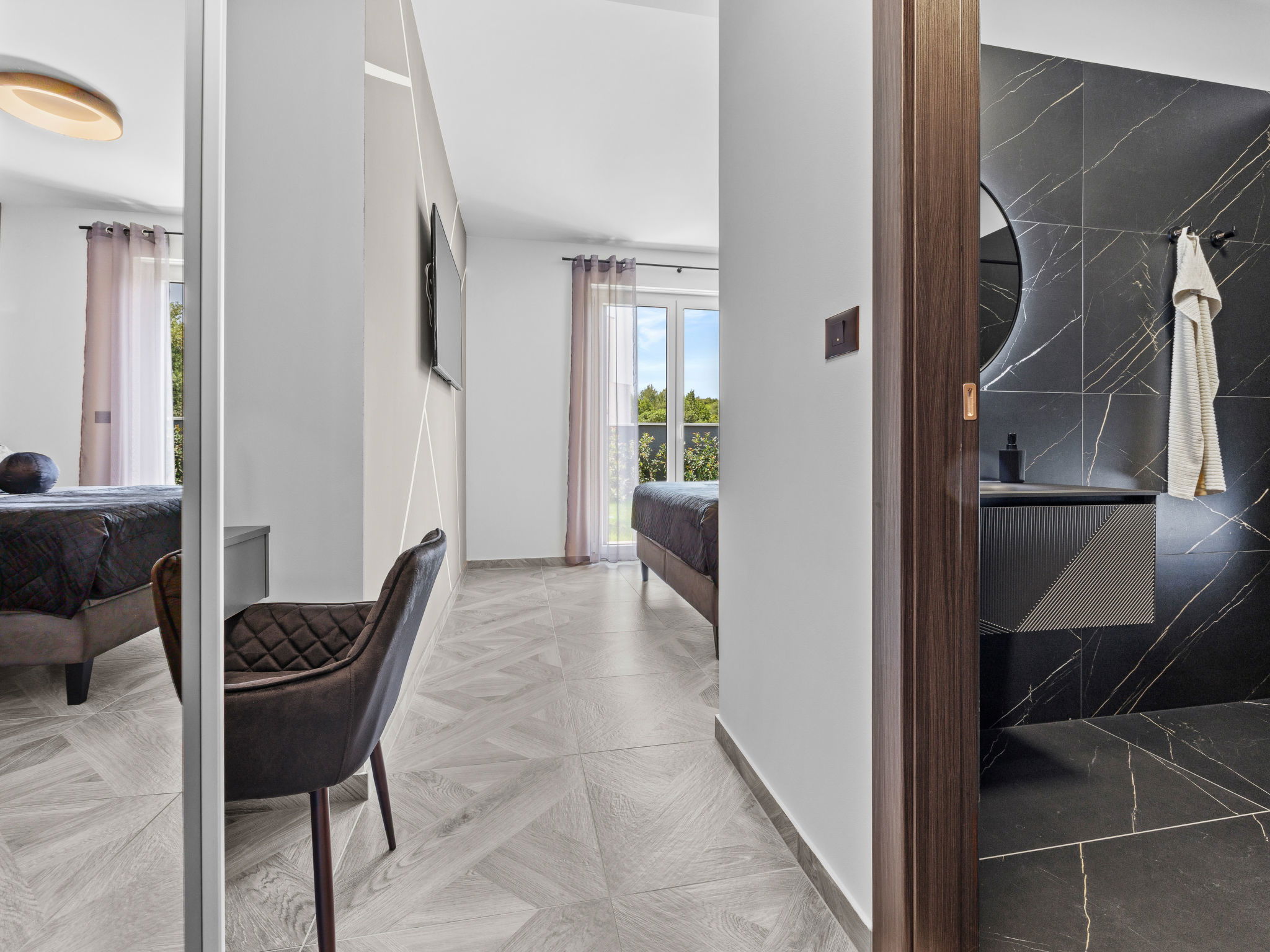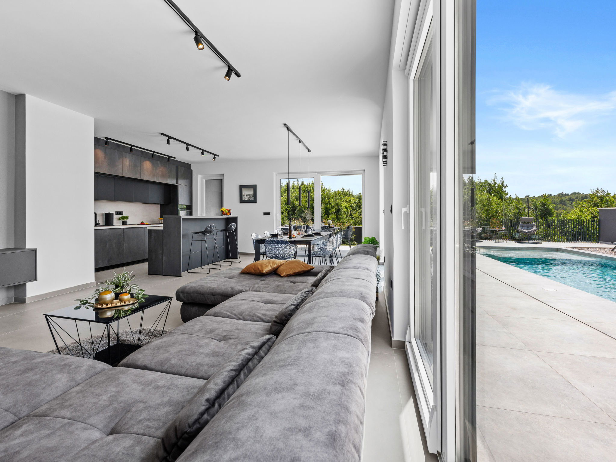 Premantura 11 km from Pula: Beautiful villa "Delecto", 2 storeys, built in 2025. 250 m from the centre of Premantura, in a sunny position, 500 m from the sea, 500 m from the beach. Private: property 600 m2 (fenced), garden with wildlife garden, swimming pool angular (8 x 4 m, depth 140 cm, seasonal availability: 04.Apr. - 10.Oct.) with internal staircase. Outdoor shower, terrace (15 m2), barbecue, pool maintenance by the owner/gardener. In the house: internet access, washing machine. Parking (for 3 cars) at the house on the premises. Shop 250 m, supermarket 4.5 km, restaurant 50 m, bus stop 220 m, pebble beach 2.5 km, rocky beach 500 m. Surf school 2.5 km, tennis 750 m, riding stable 10 km, walking paths from the house 100 m, cycle lane 150 m. Nearby attractions: Nature park Kamenjak 650 m. Groups of teenagers on request only. Neighbourhood highly sensitive to noise. Quietness and good behaviour expected. Swimming pool with hydromassage.