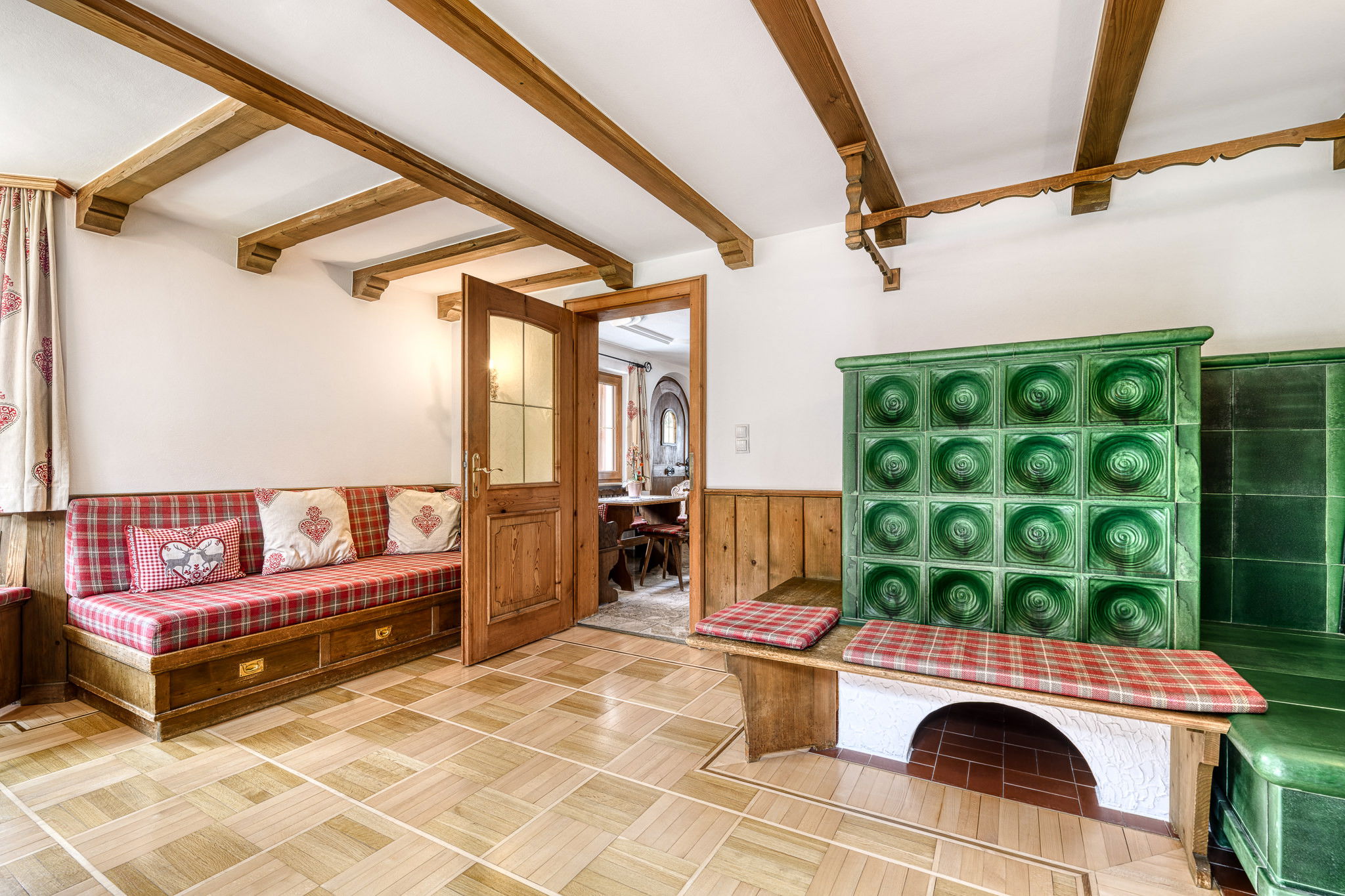 The wood-panelled parlour with a cosy seating area in the light-flooded bay window invites you to sociable evenings. In the separate kitchen with high-quality equipment and a large dining table, cooking together becomes an experience. After an active day, you can relax in the house's own sauna in the basement.