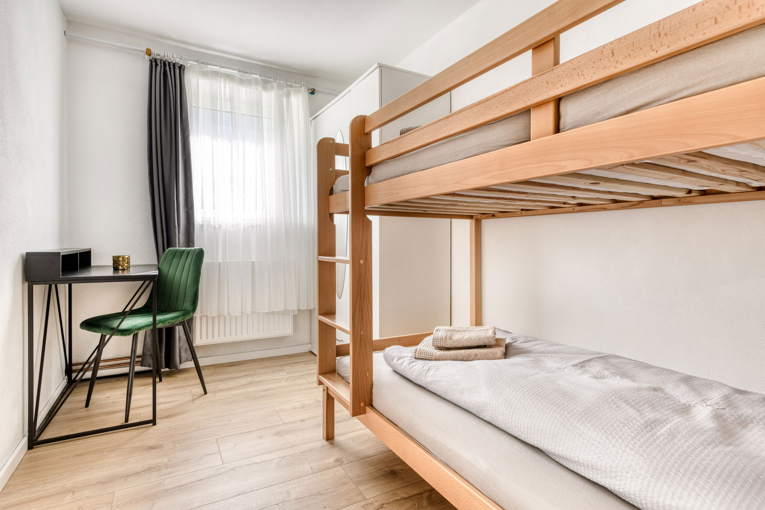 You can expect a spacious temporary home with two cosy bedrooms, a bright living room with a sofa bed and a kitchen with a dining area. In the bathroom, you will find both a shower and a bathtub. Garden loungers and a parasol in the outdoor area invite you to relax.