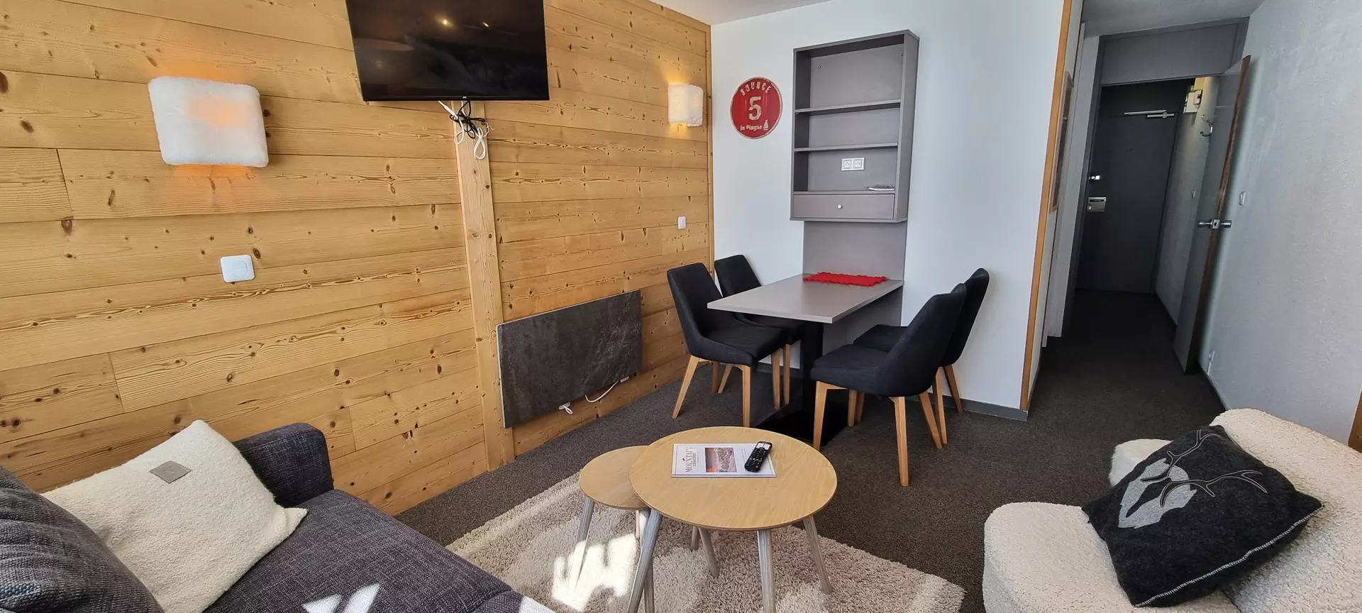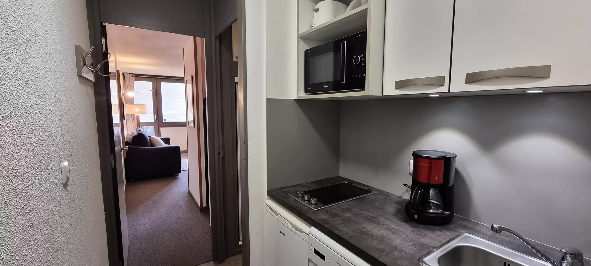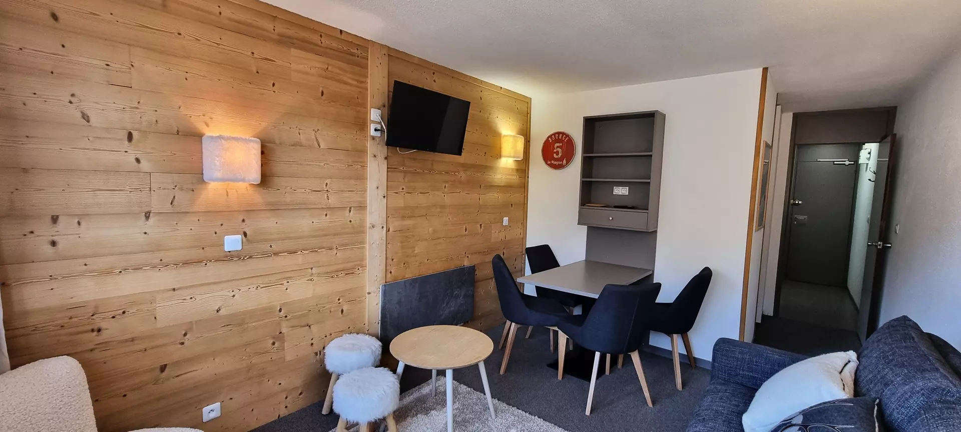 This studio is located on the "L" level of the Paquebot des Neiges and is accessible by the "Chamois" elevator. It consists of a living room, a separate kitchen, and a bathroom with WC. Its south-facing balcony offers a lovely view of the Aime 2000 slopes.