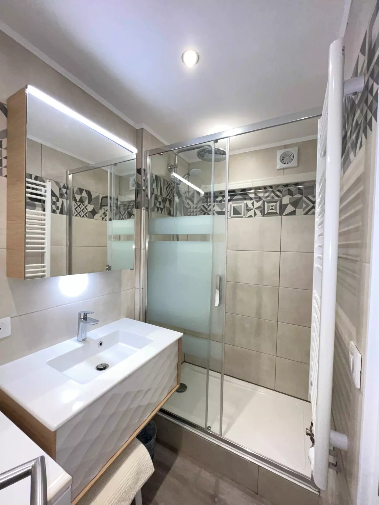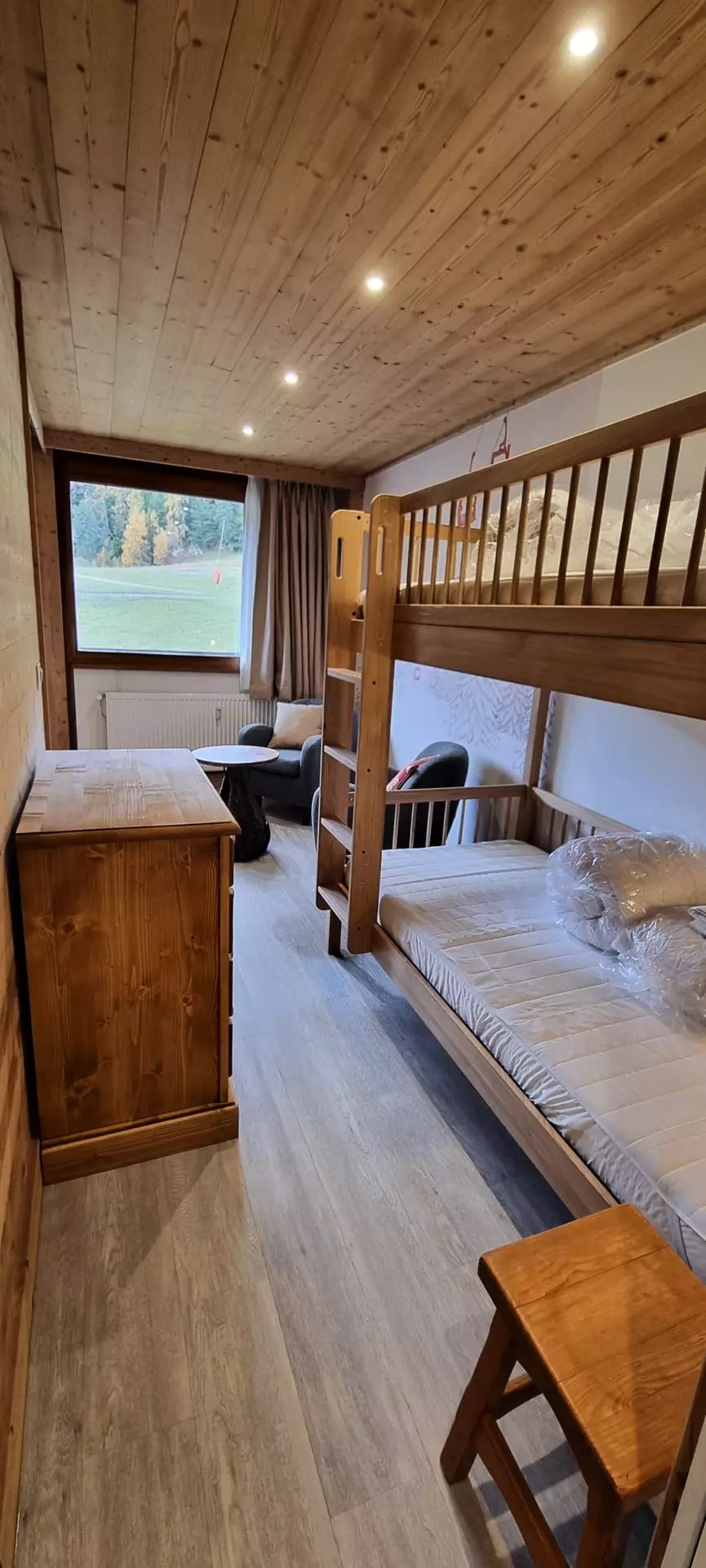 It consists of a living room divisible by an extendable partition with a trundle bed for 2 people, 2 bunk beds and a flat screen TV.
