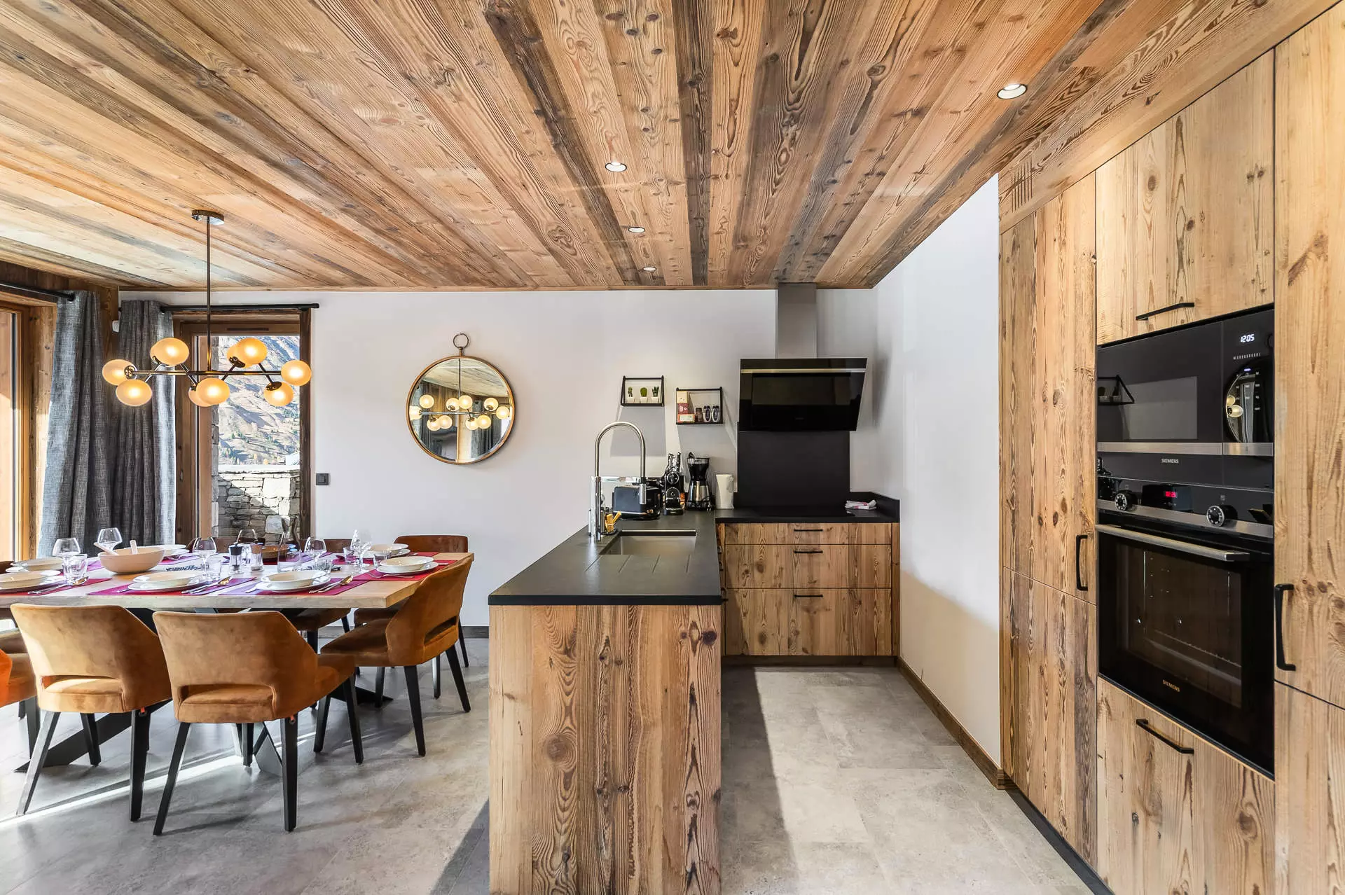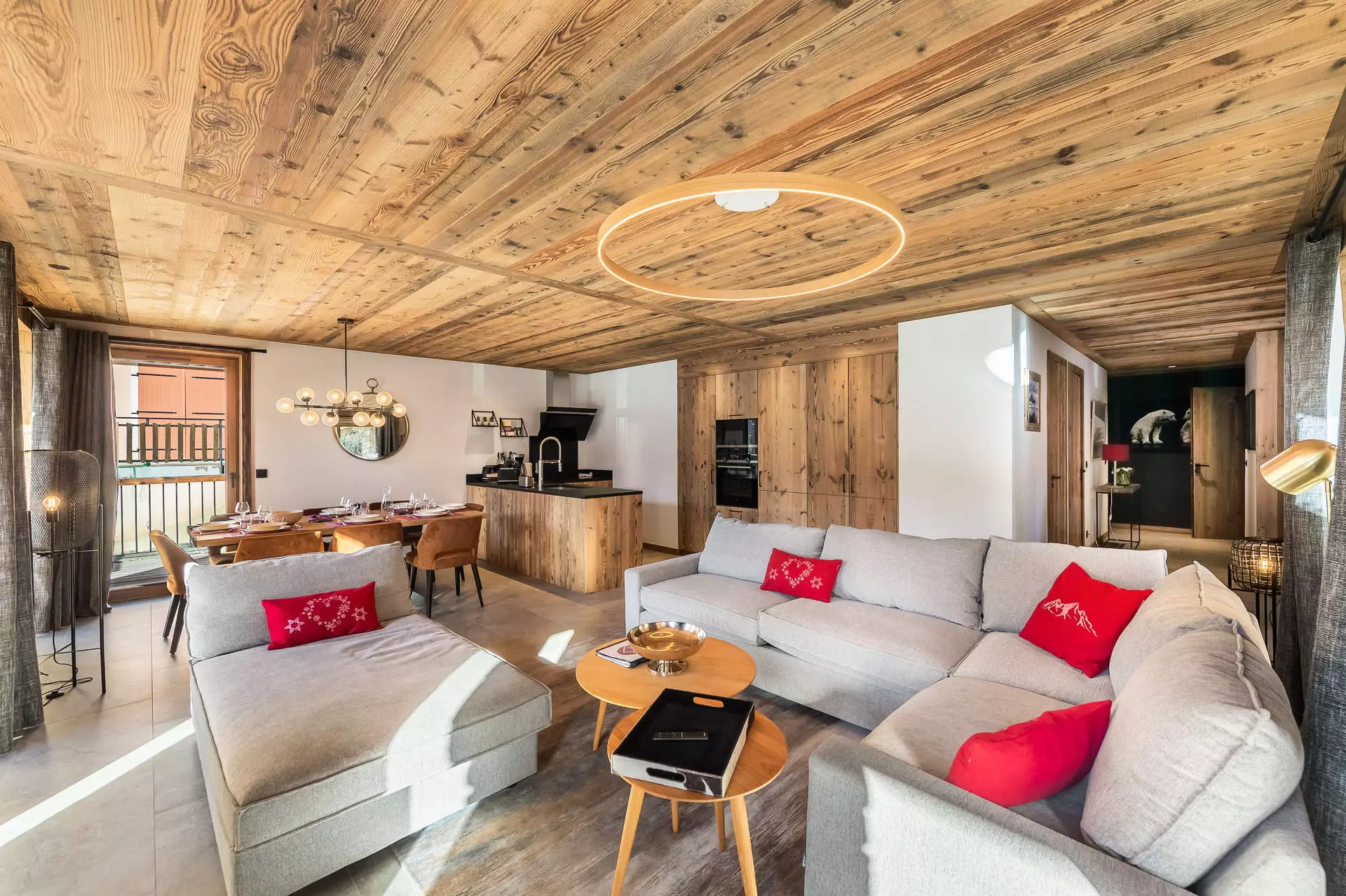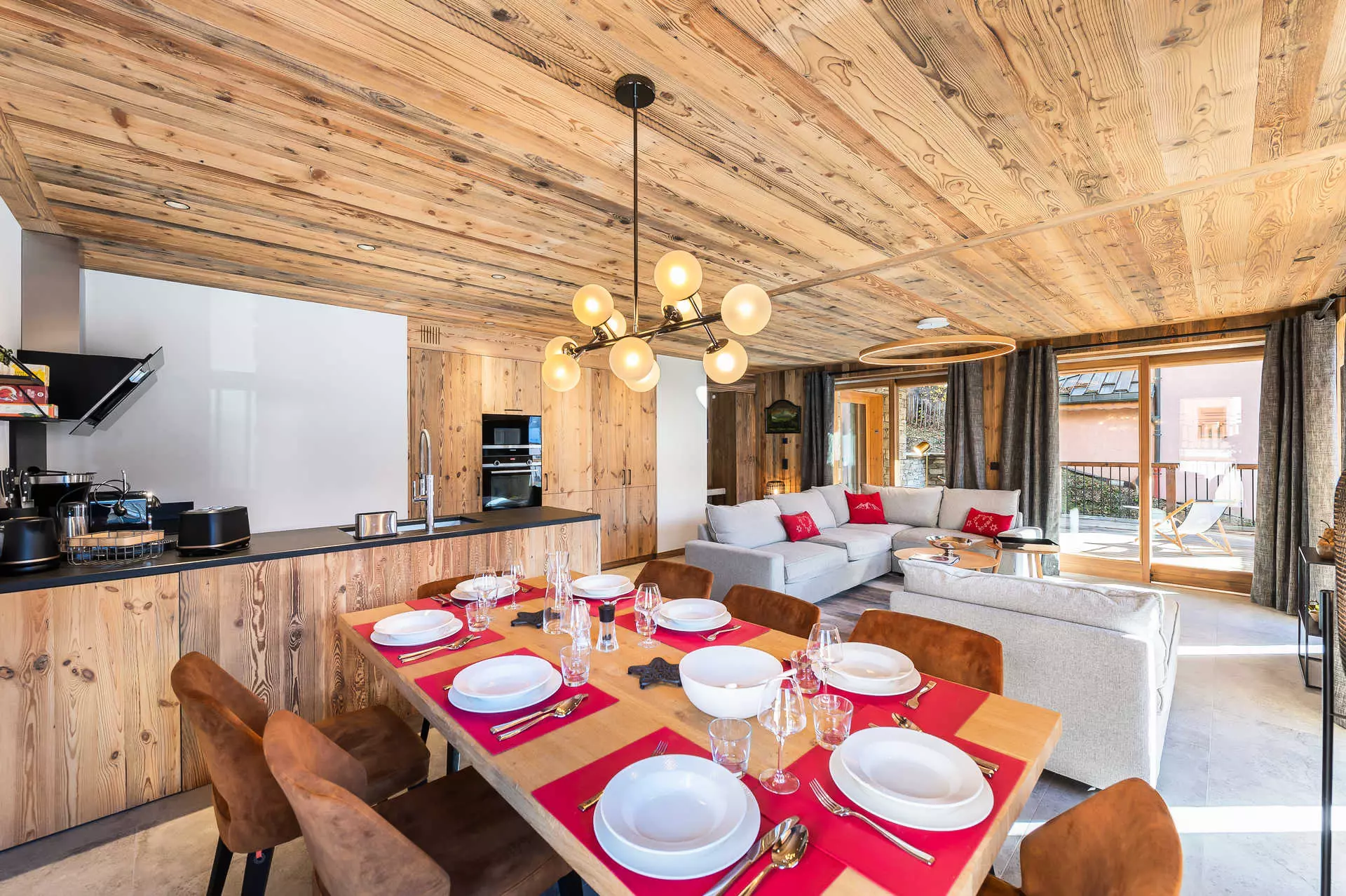 Kitchen open to the living room: 4 induction hobs, microwave, oven, extractor hood, refrigerator, dishwasher, capsule coffee maker, filter coffee maker, kettle, citrus press, toaster, mincer