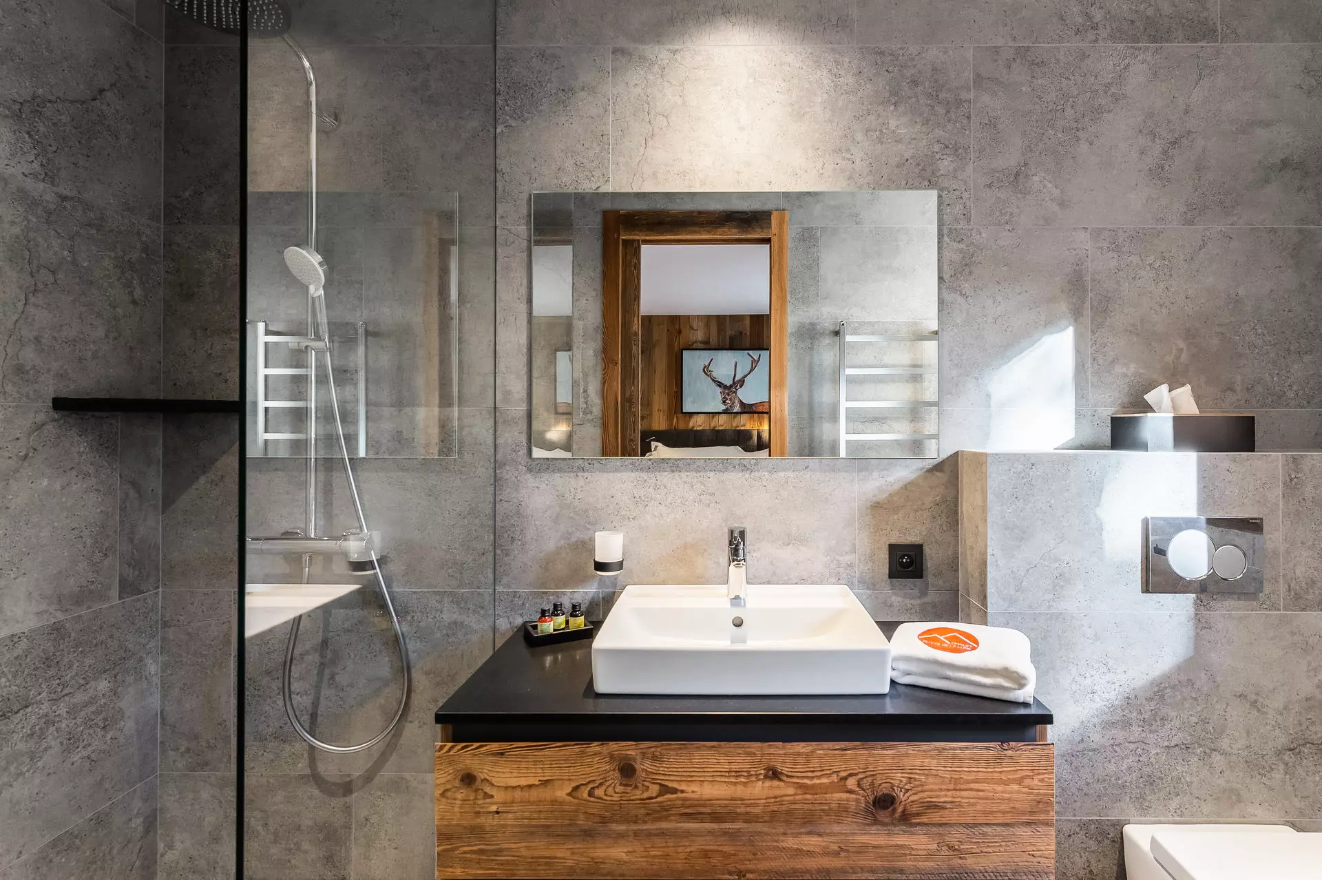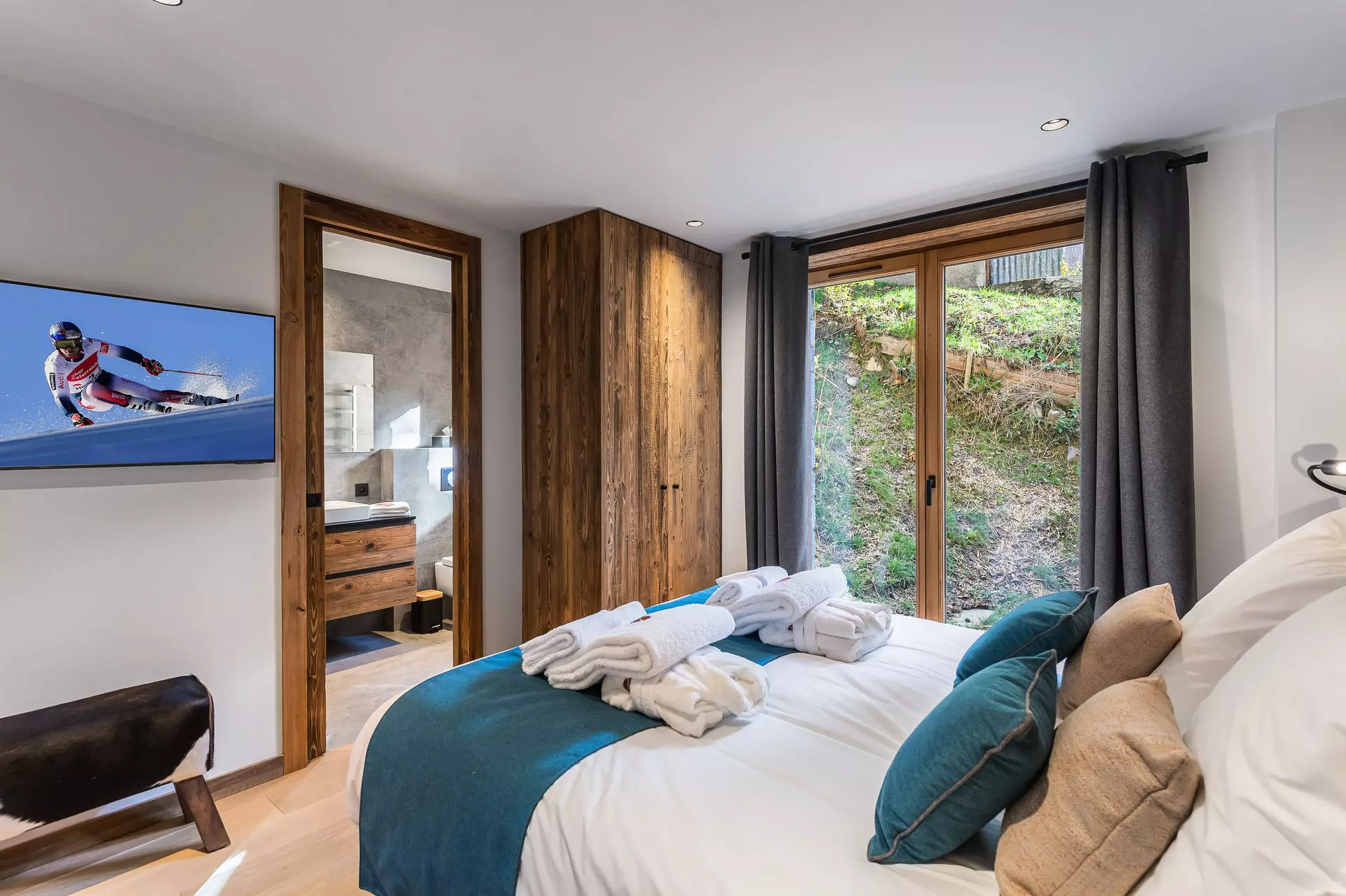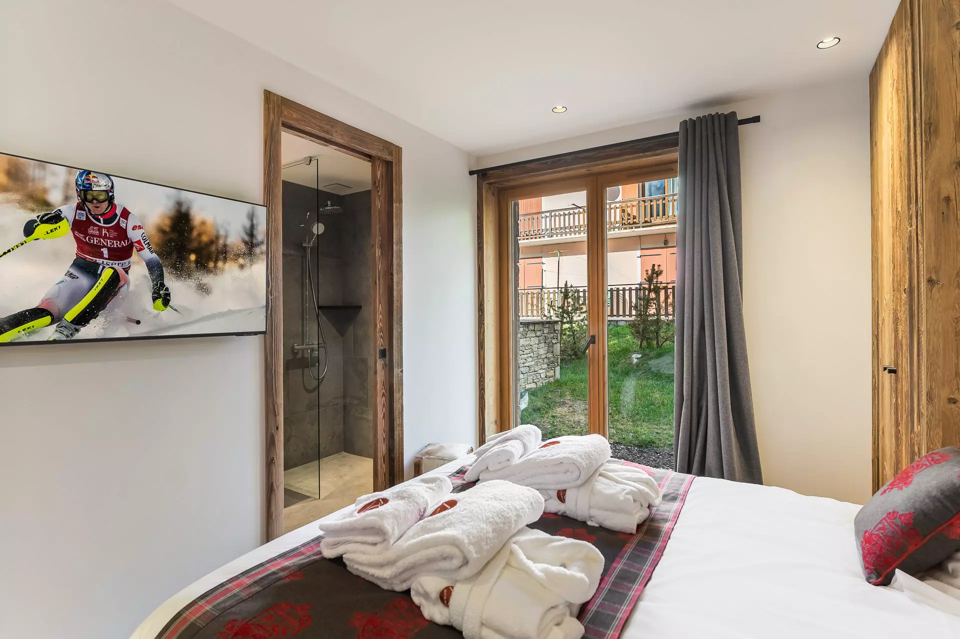 Bedroom 2: 1 double bed (140x200cm), 1 bunk bed (2x 90x200cm), adjoining bathroom (sink, shower, towel dryer), television