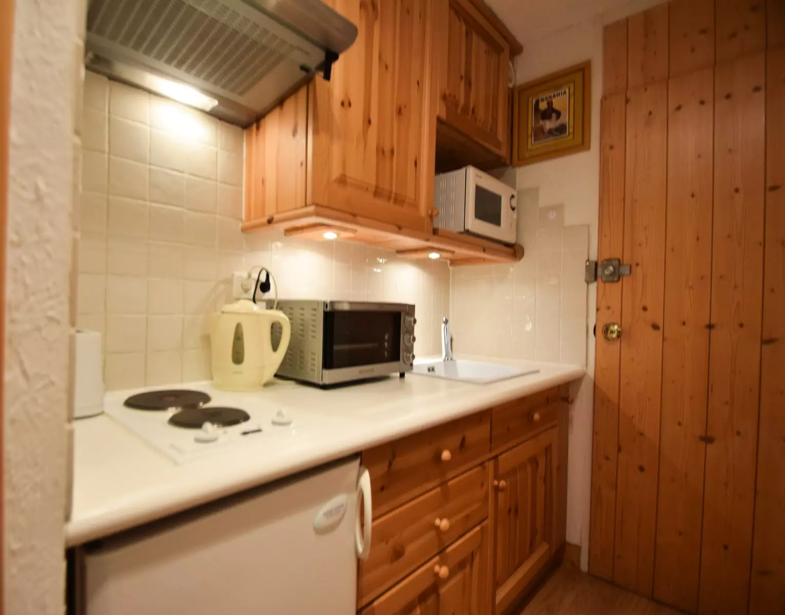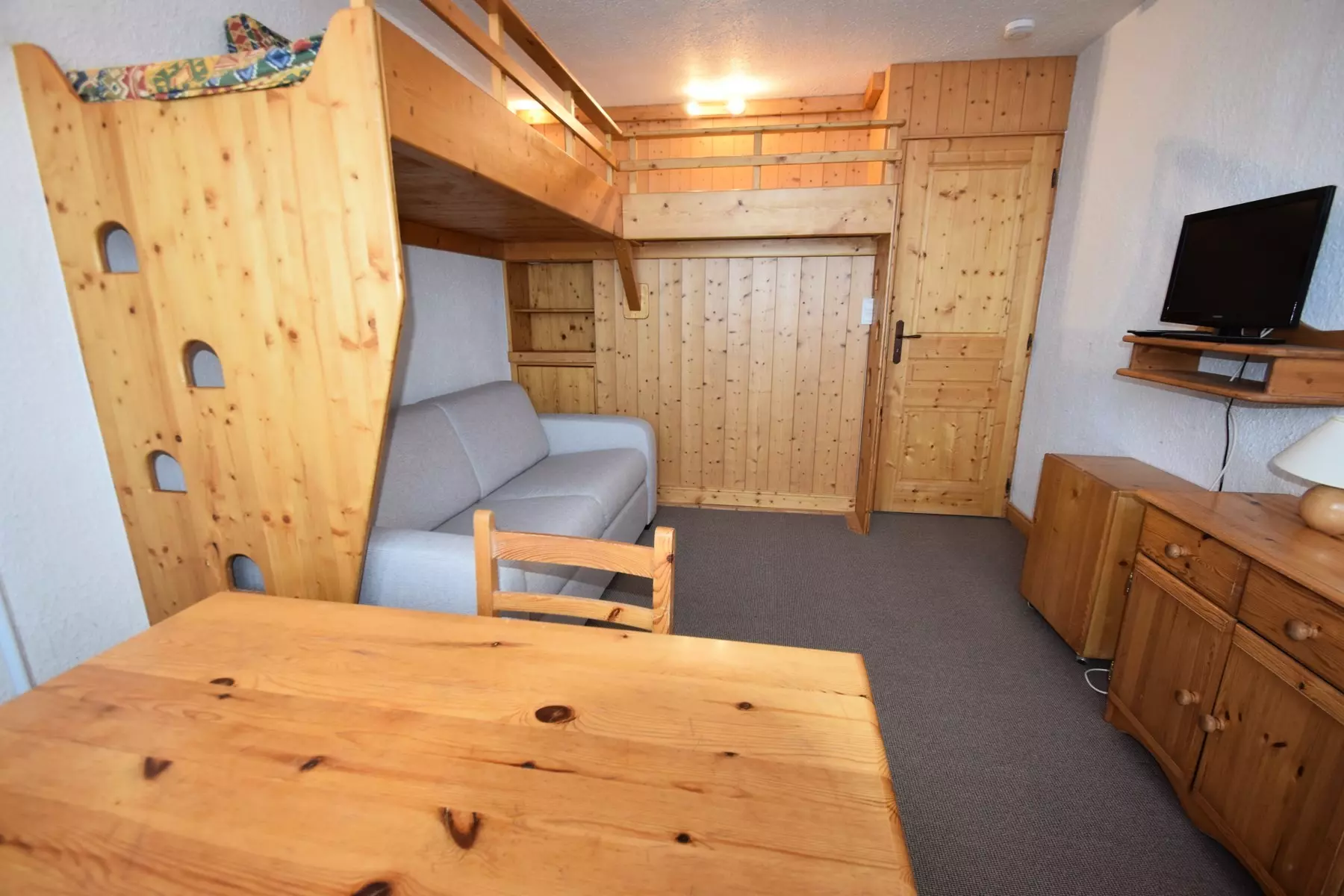 Kitchen: in the hallway/entrance: 2 electric hotplates, refrigerator, microwave. Living room: 1 double sofa bed, 1 single mezzanine bed, dining area, television. Bathroom: bathtub, WC included. Bedding: duvets. Studio with a beautiful view of the valley and Mont Blanc. Ski locker n°953 on the ground floor, slope exit level on the UCPA side. PETS NOT ALLOWED and NON-SMOKING APPT - End-of-stay cleaning, sheets, towels and ski passes are optional.