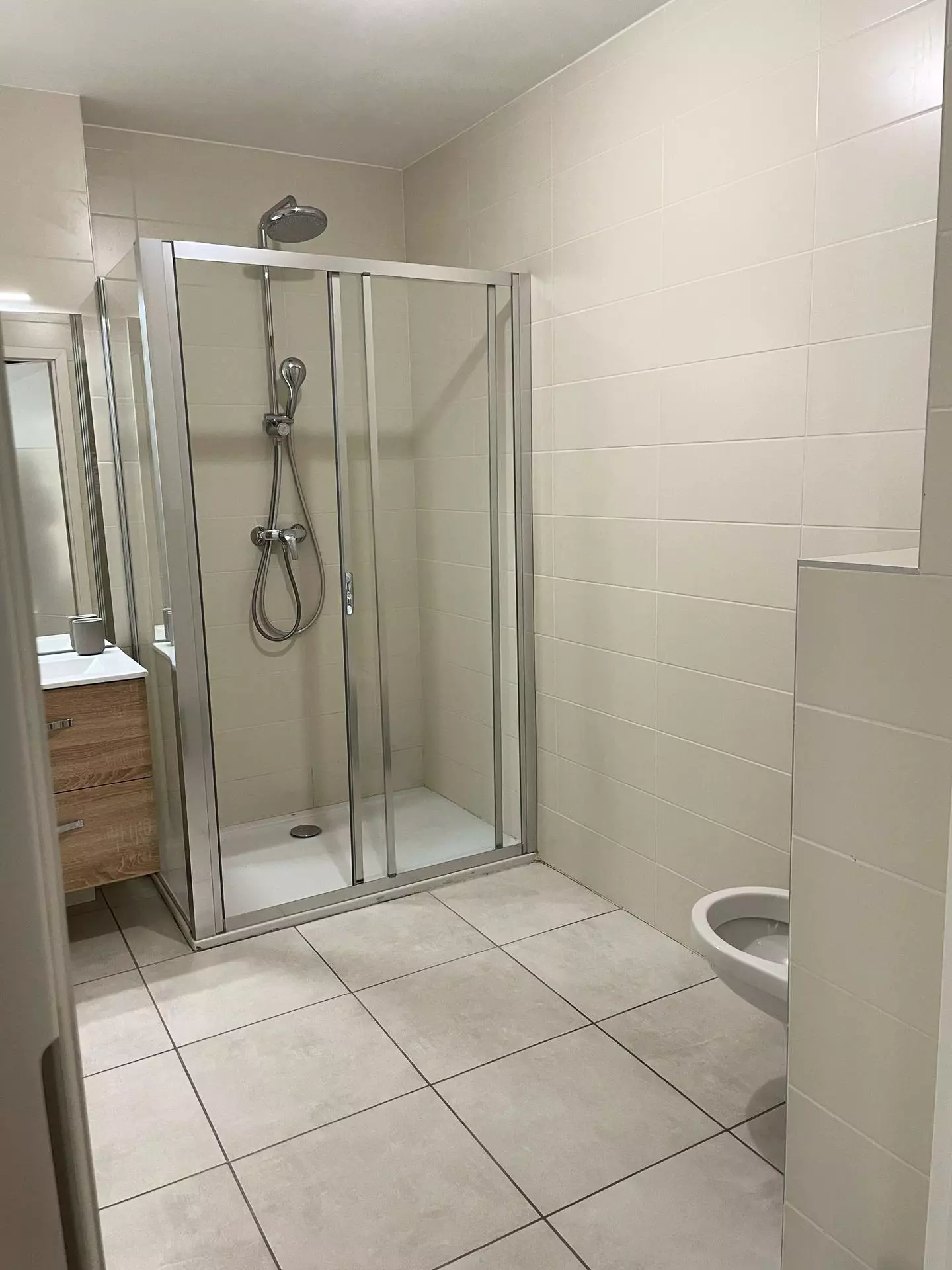 a large shower and a toilet.