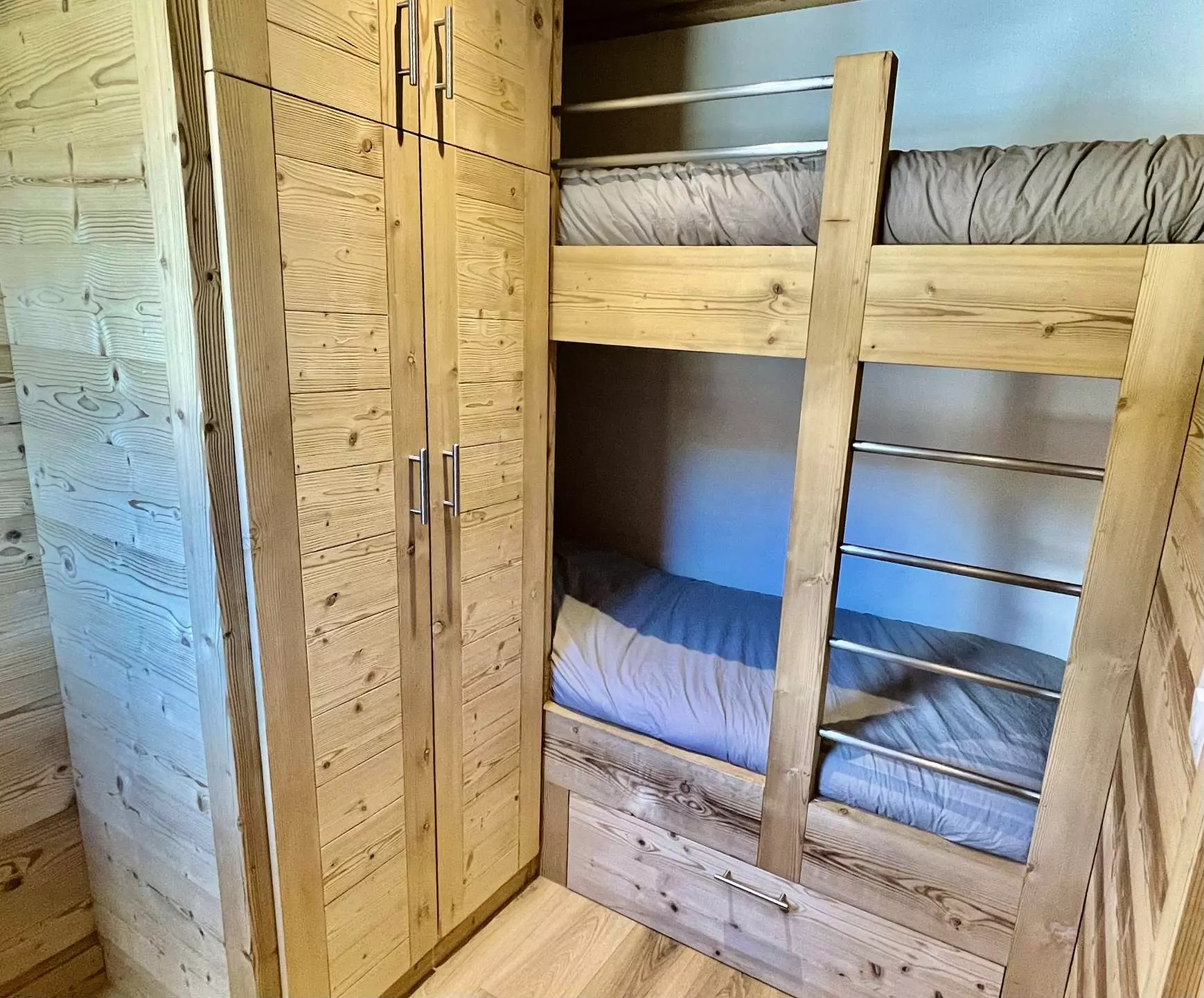 The bedroom has a double bed and the second has bunk beds. All beds have duvets.