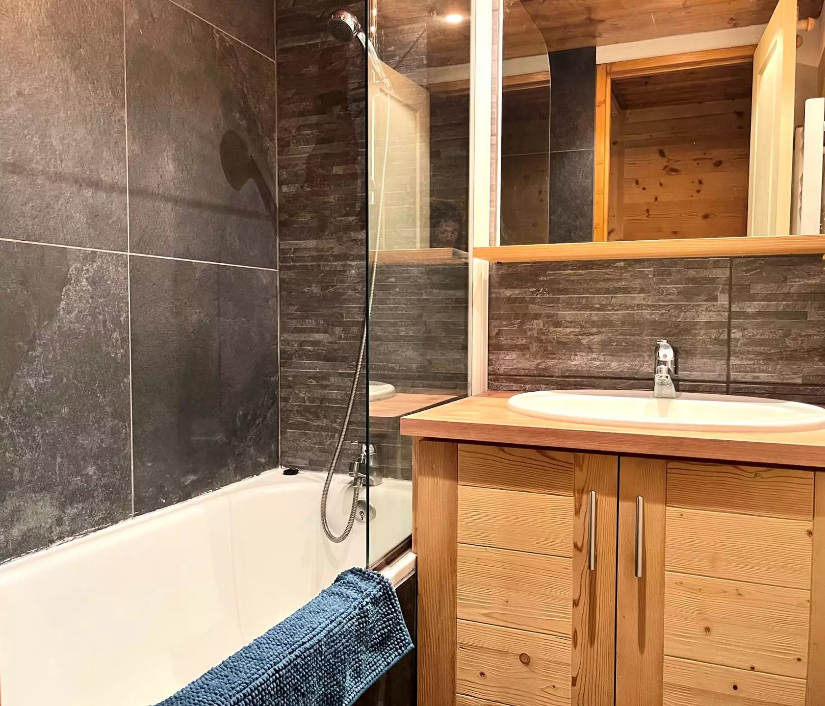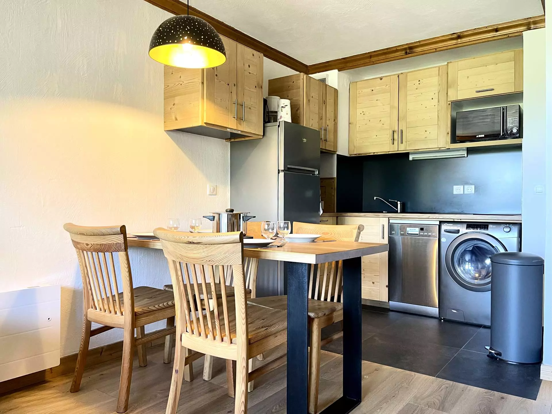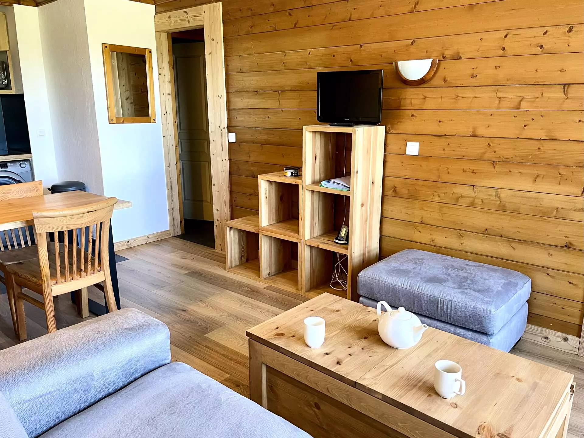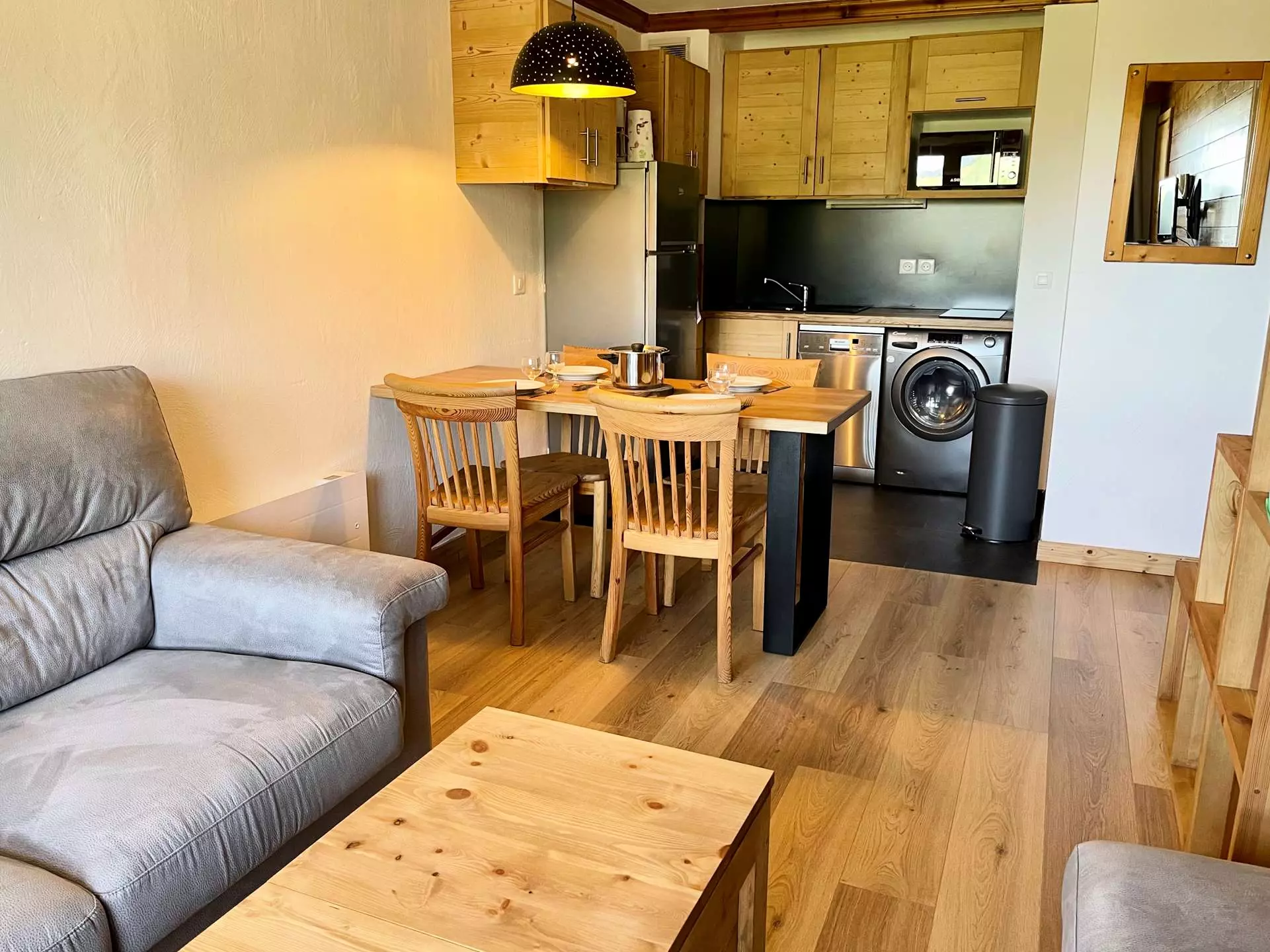 It is located 5 minutes from the ESF lessons and the Piou-Piou club, 3 minutes from the shops and 2 minutes from the slopes.