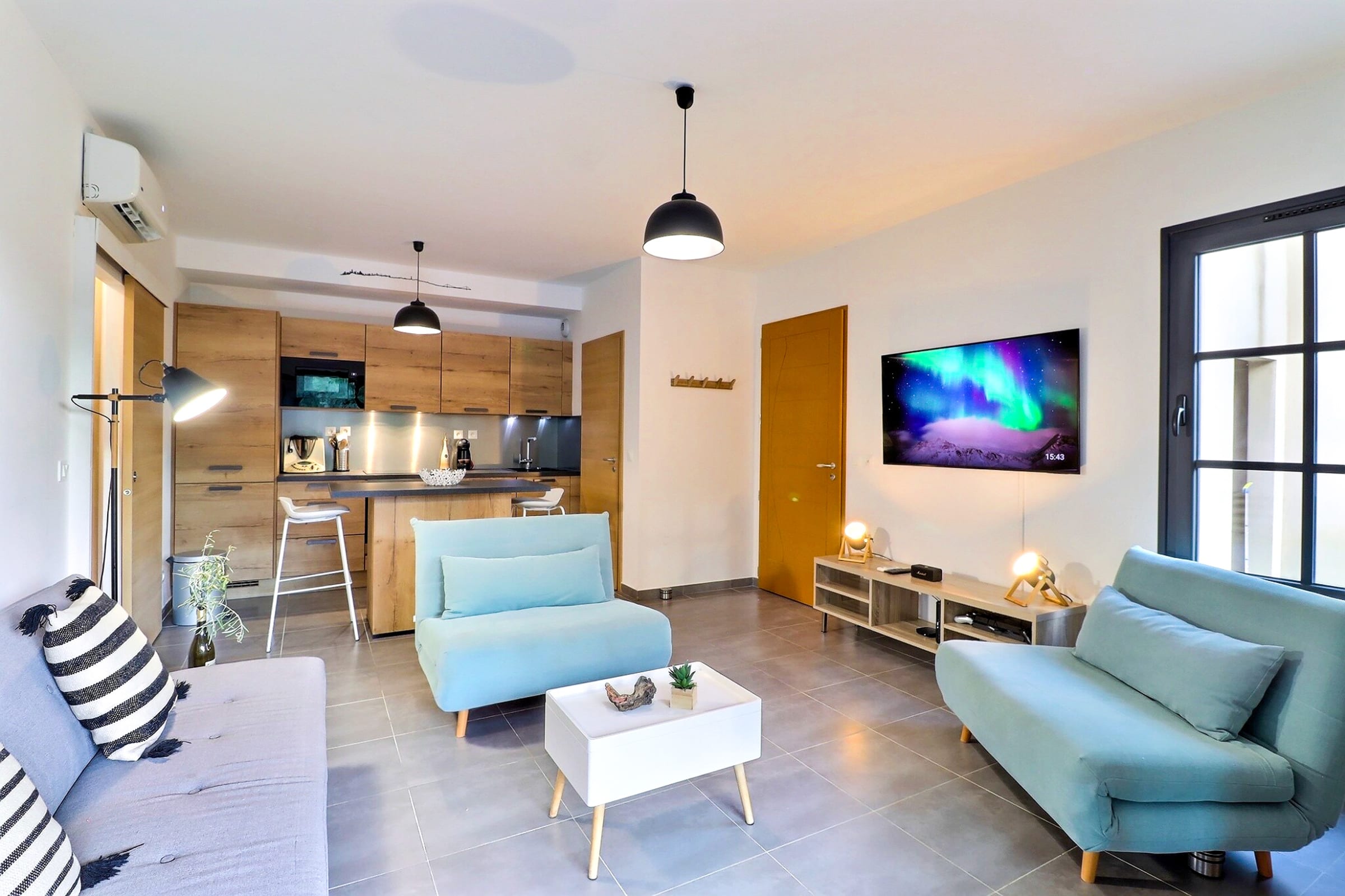 From the moment you step inside, natural light fills the spacious living area. Large windows open onto a wooden and stone terrace, an inviting space for al fresco dining or evenings spent gazing at the surrounding hills. The living room, equipped with air conditioning and a smart TV, promises comfort and relaxation, while the fully equipped modern kitchen is ideal for creating and sharing meals.