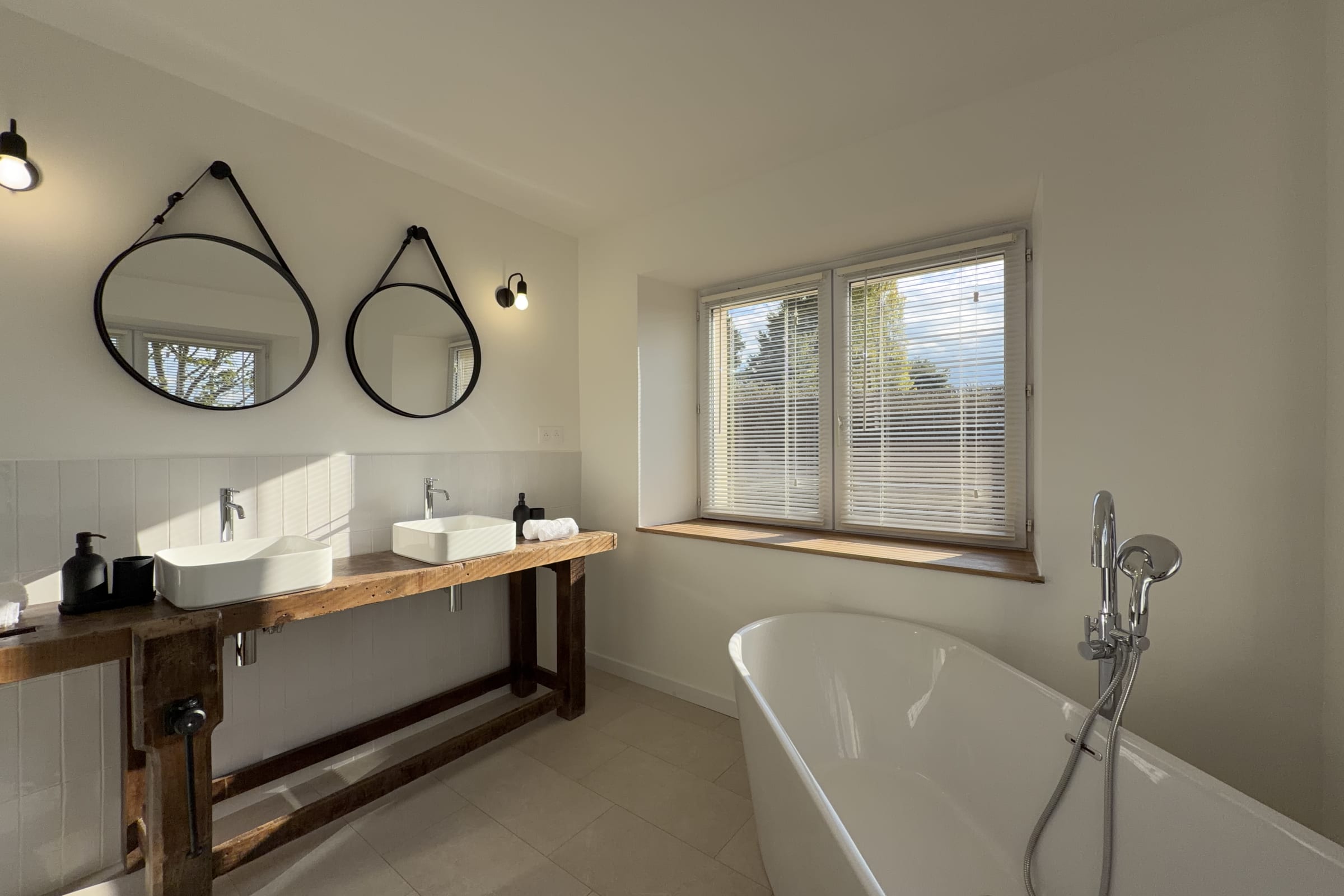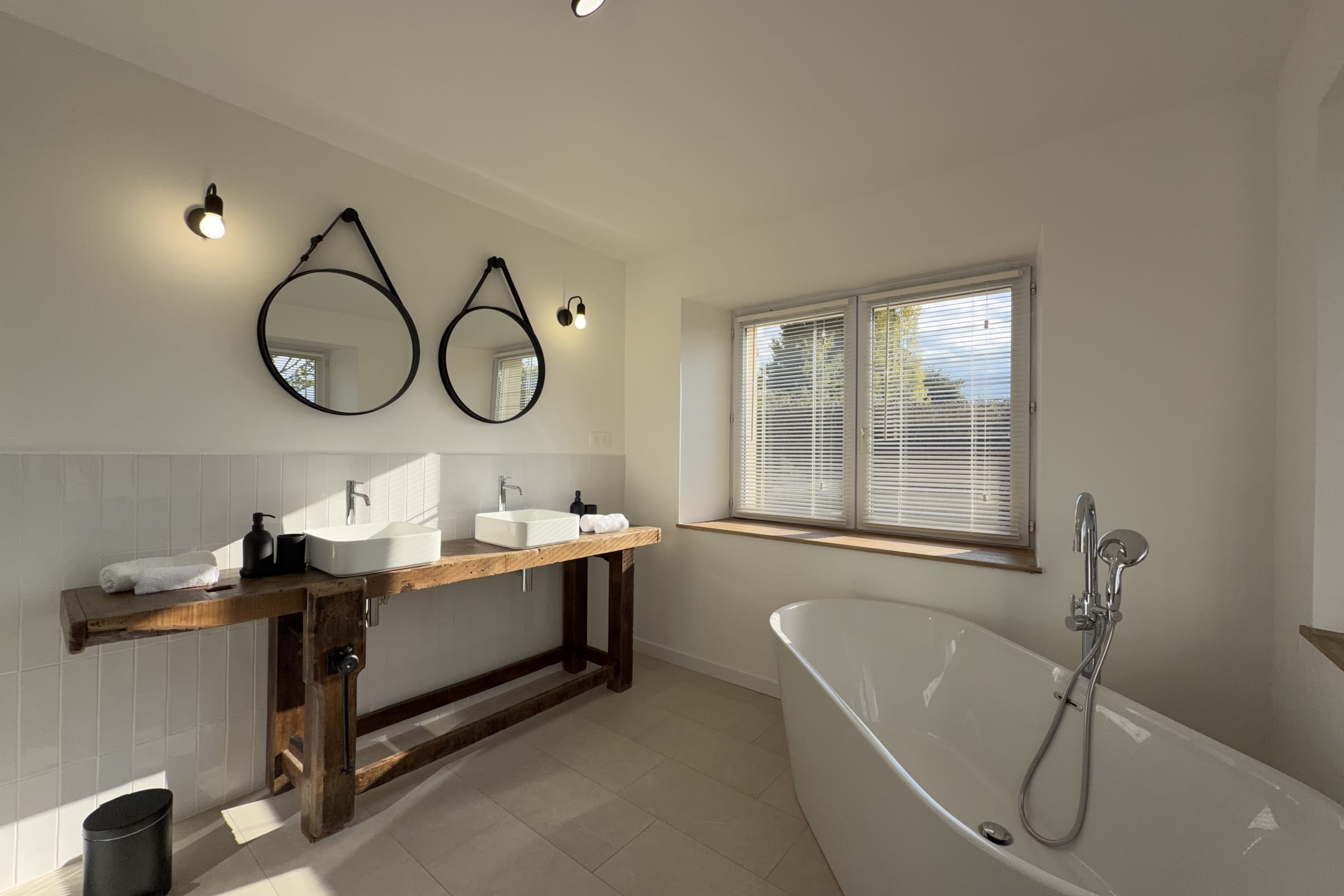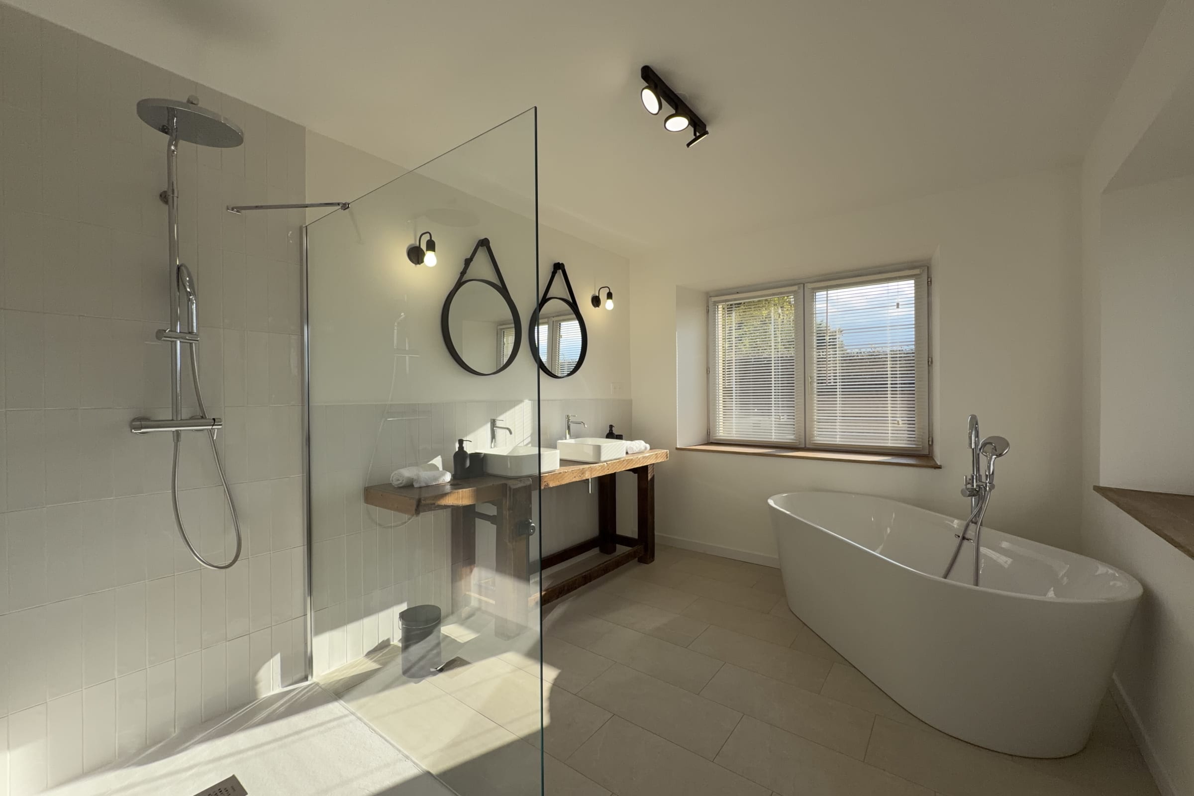1 large separate bathroom with walk-in shower, freestanding bath and double basin