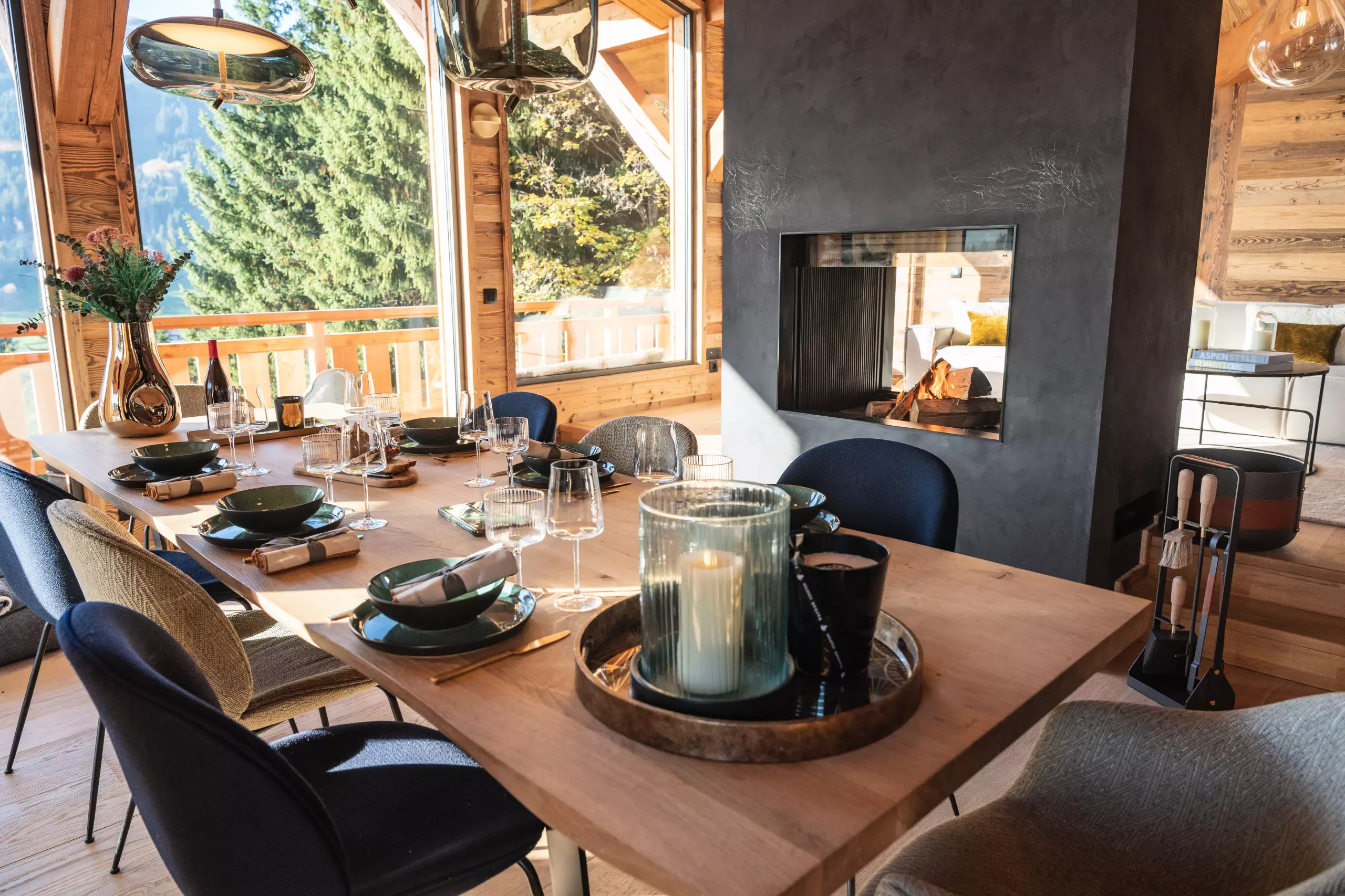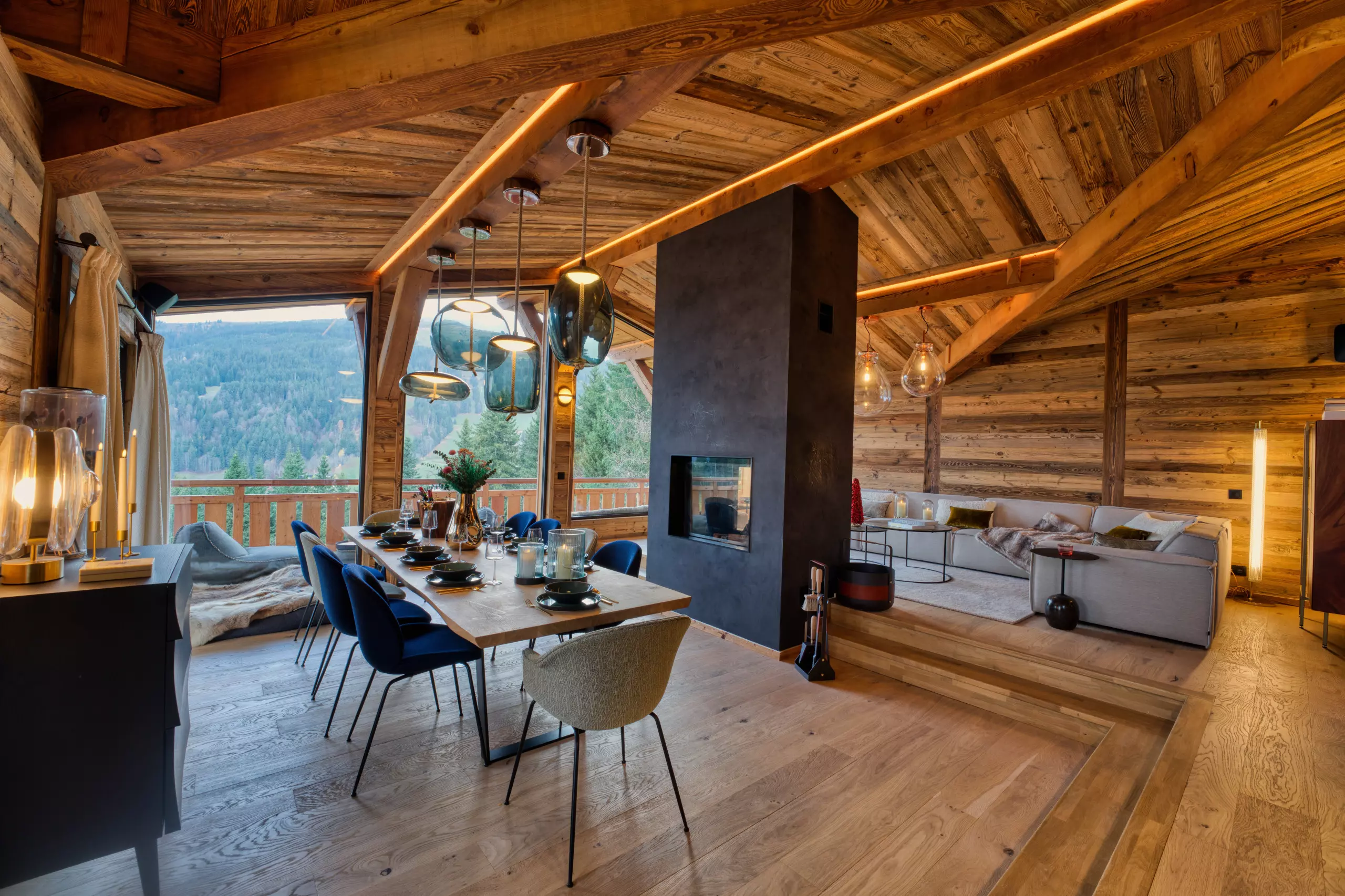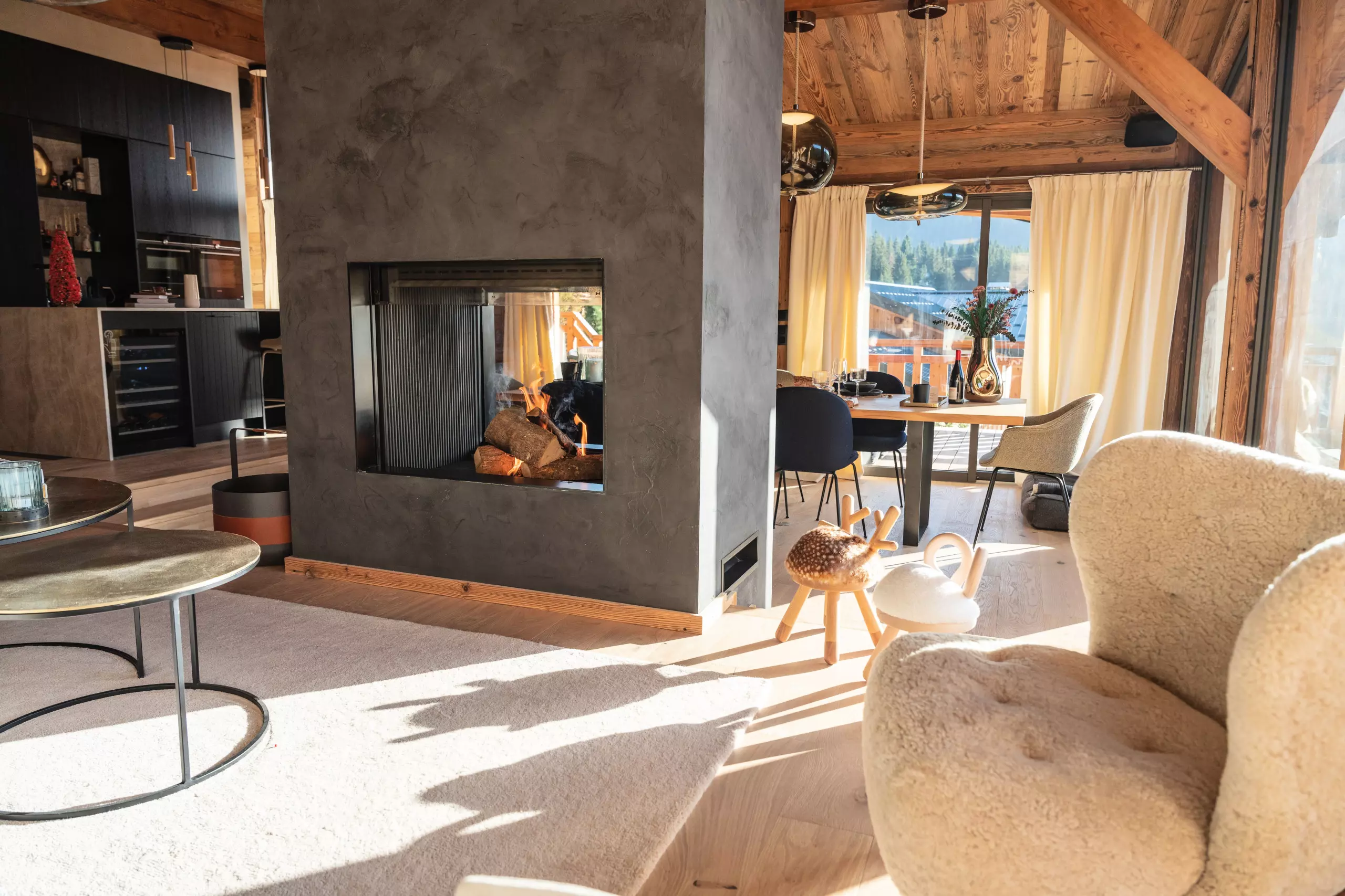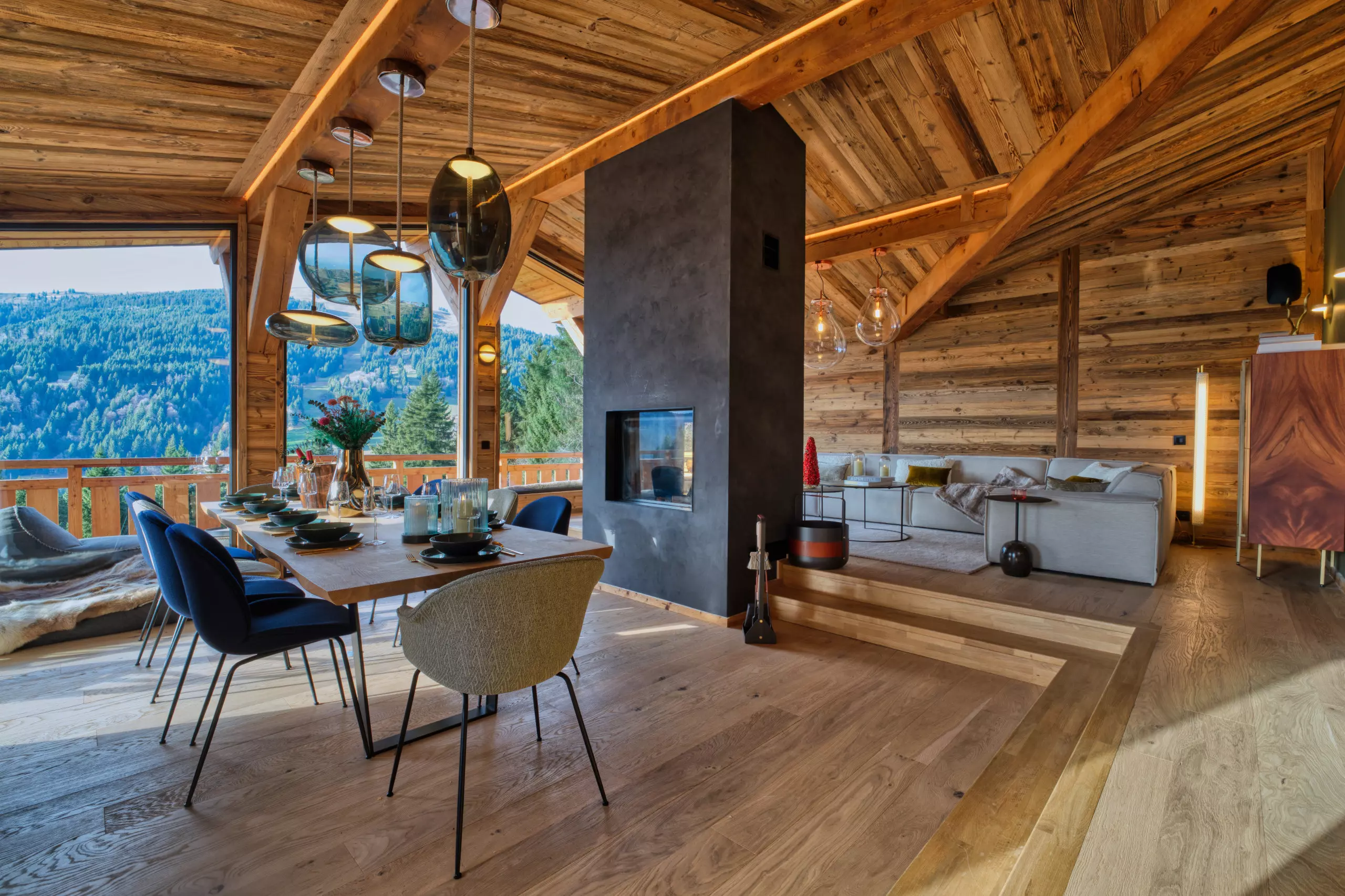 After a day on the slopes, relax in the outdoor hot tub or enjoy an aperitif on the sunny terrace, furnished with custom-made garden furniture, an outdoor fireplace, and a sound system. The chalet also features a ski room with boot warmers, a fully equipped open-plan kitchen, and a spacious living room with a large table for 10 guests and a central fireplace.