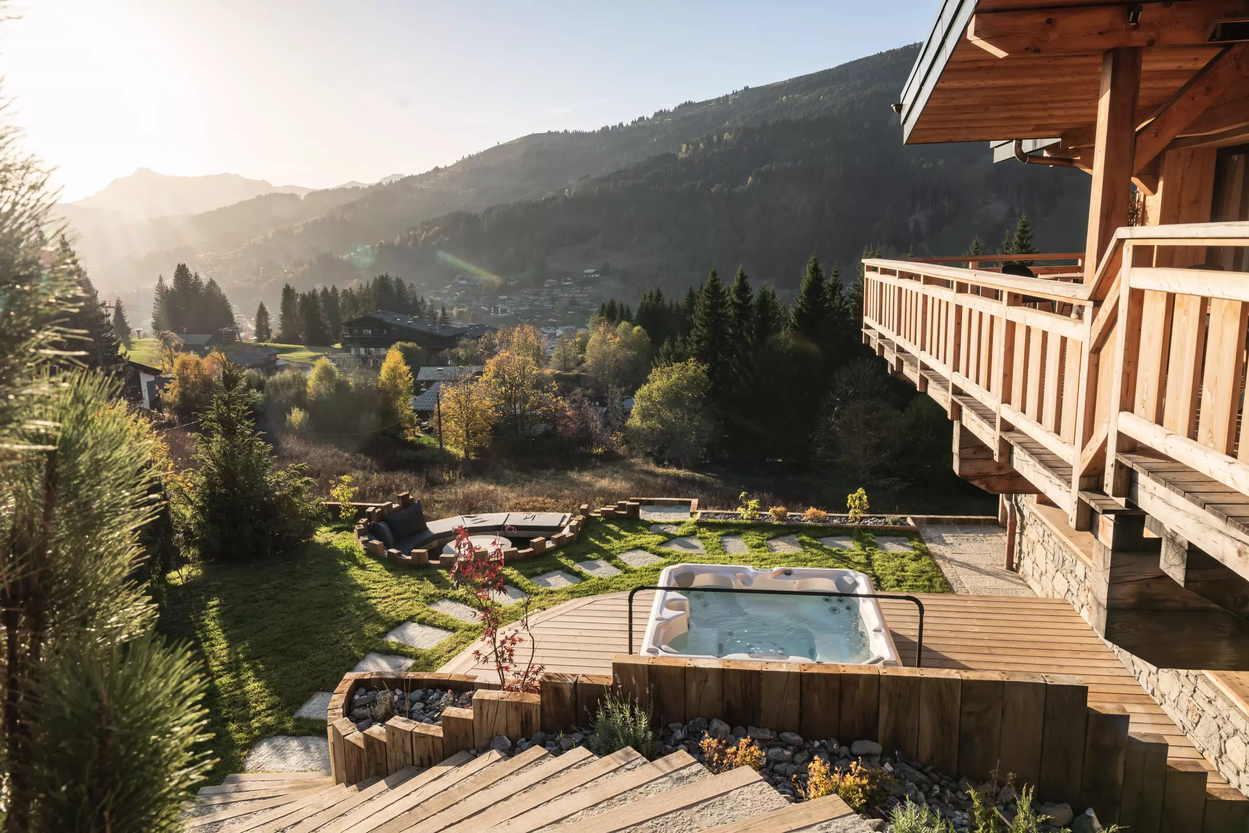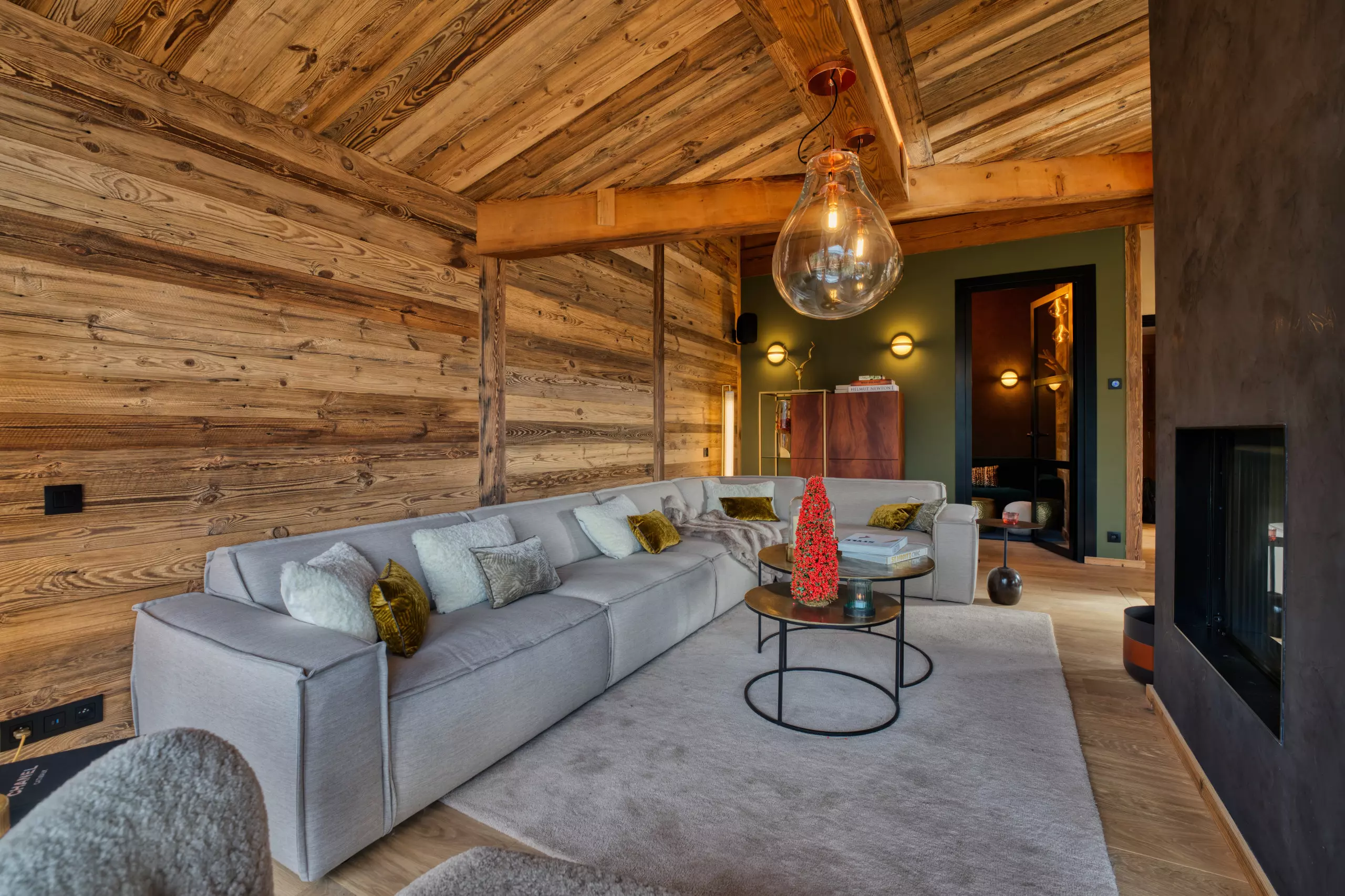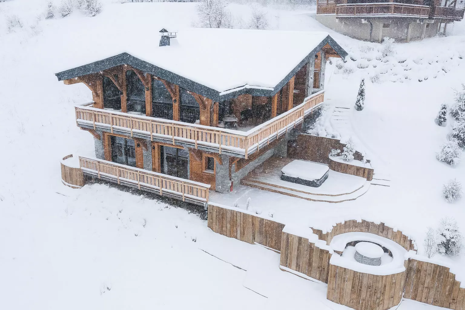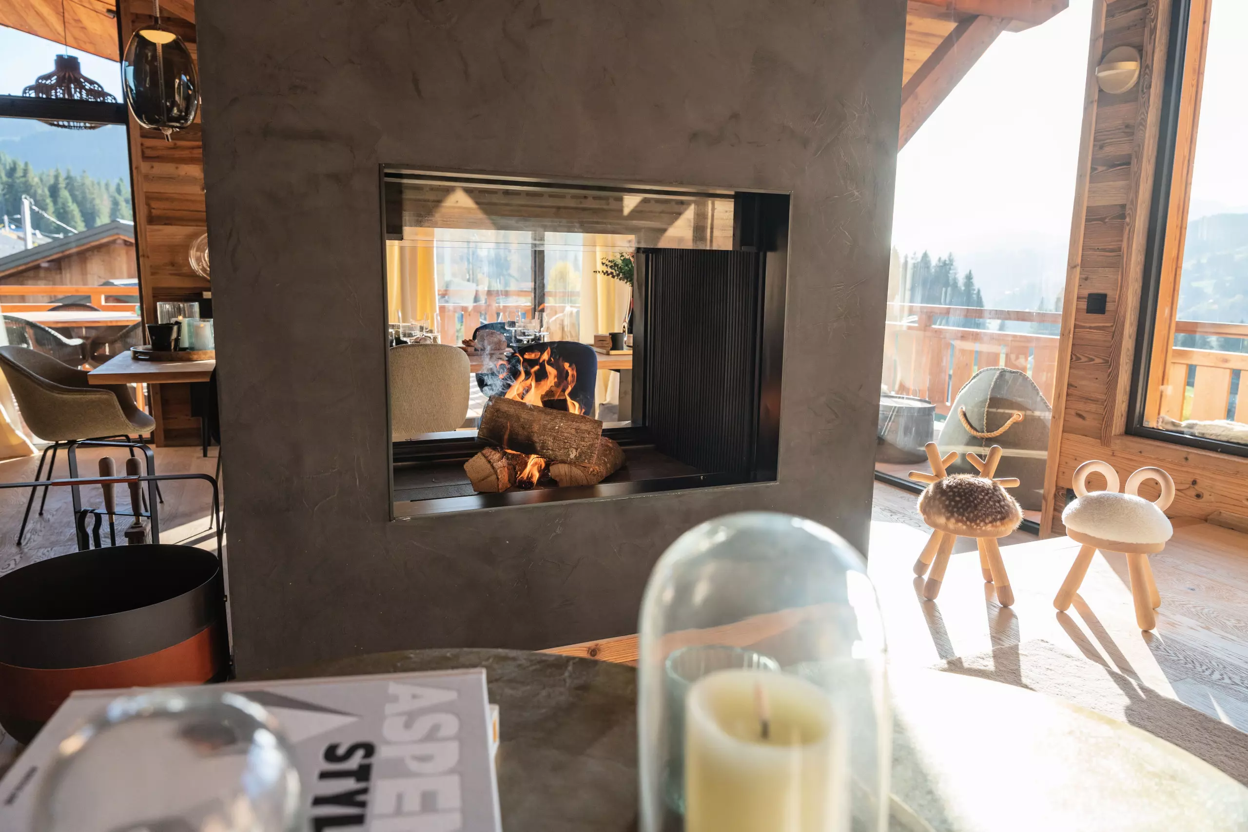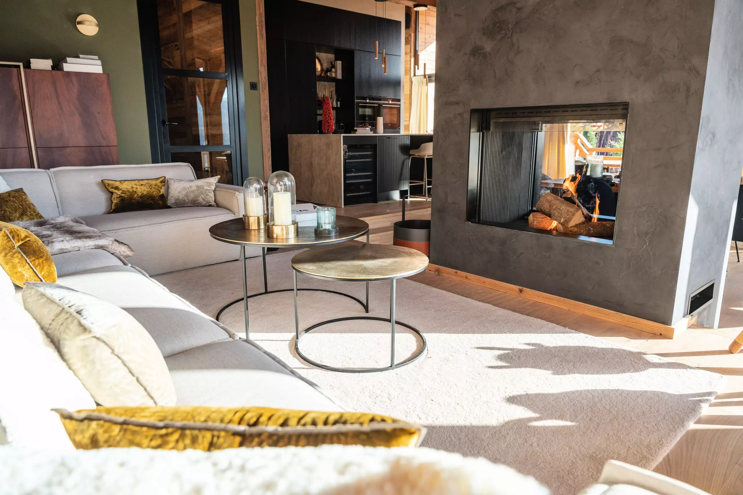 After a day on the slopes, relax in the outdoor hot tub or enjoy an aperitif on the sunny terrace, furnished with custom-made garden furniture, an outdoor fireplace, and a sound system. The chalet also features a ski room with boot warmers, a fully equipped open-plan kitchen, and a spacious living room with a large table for 10 guests and a central fireplace.