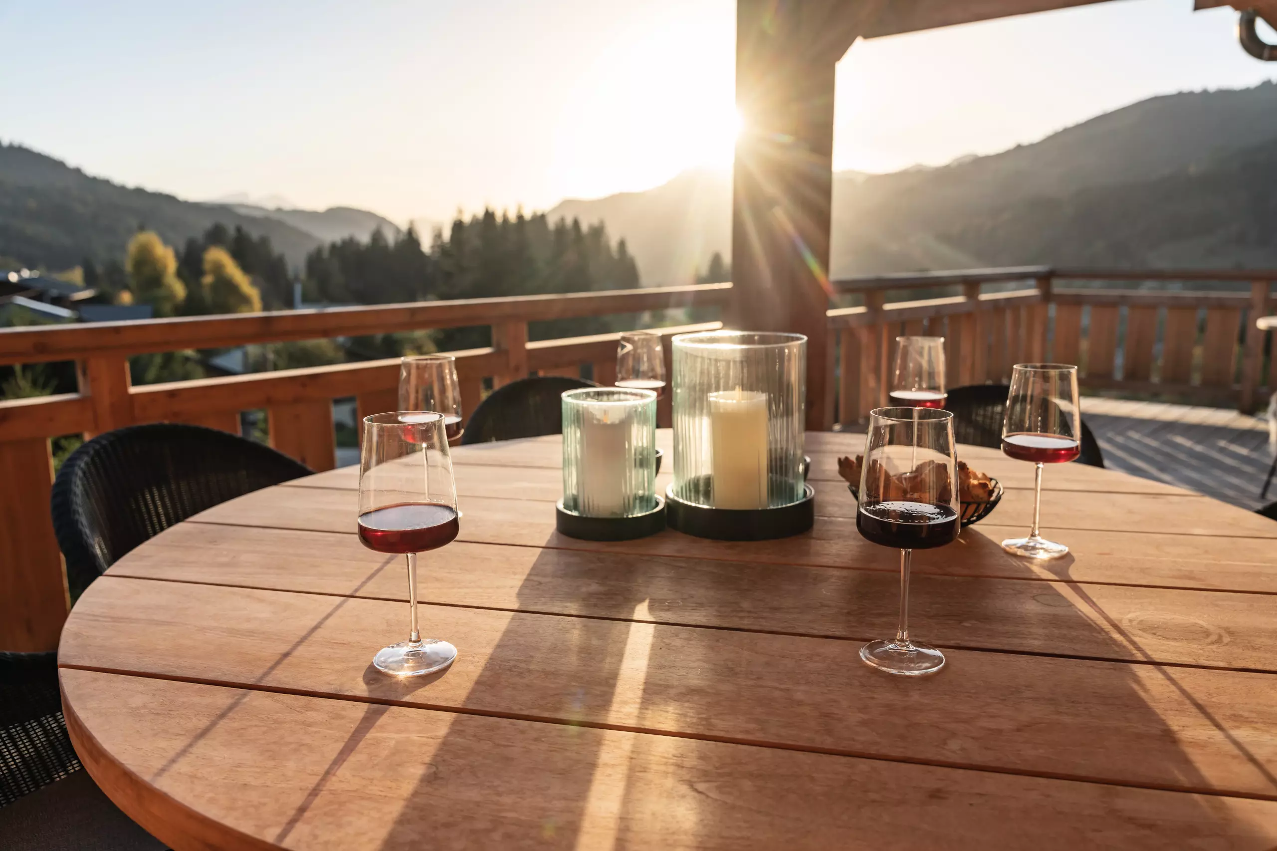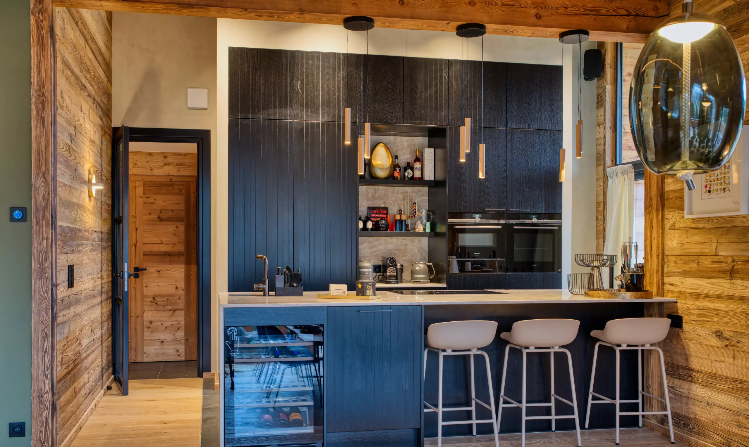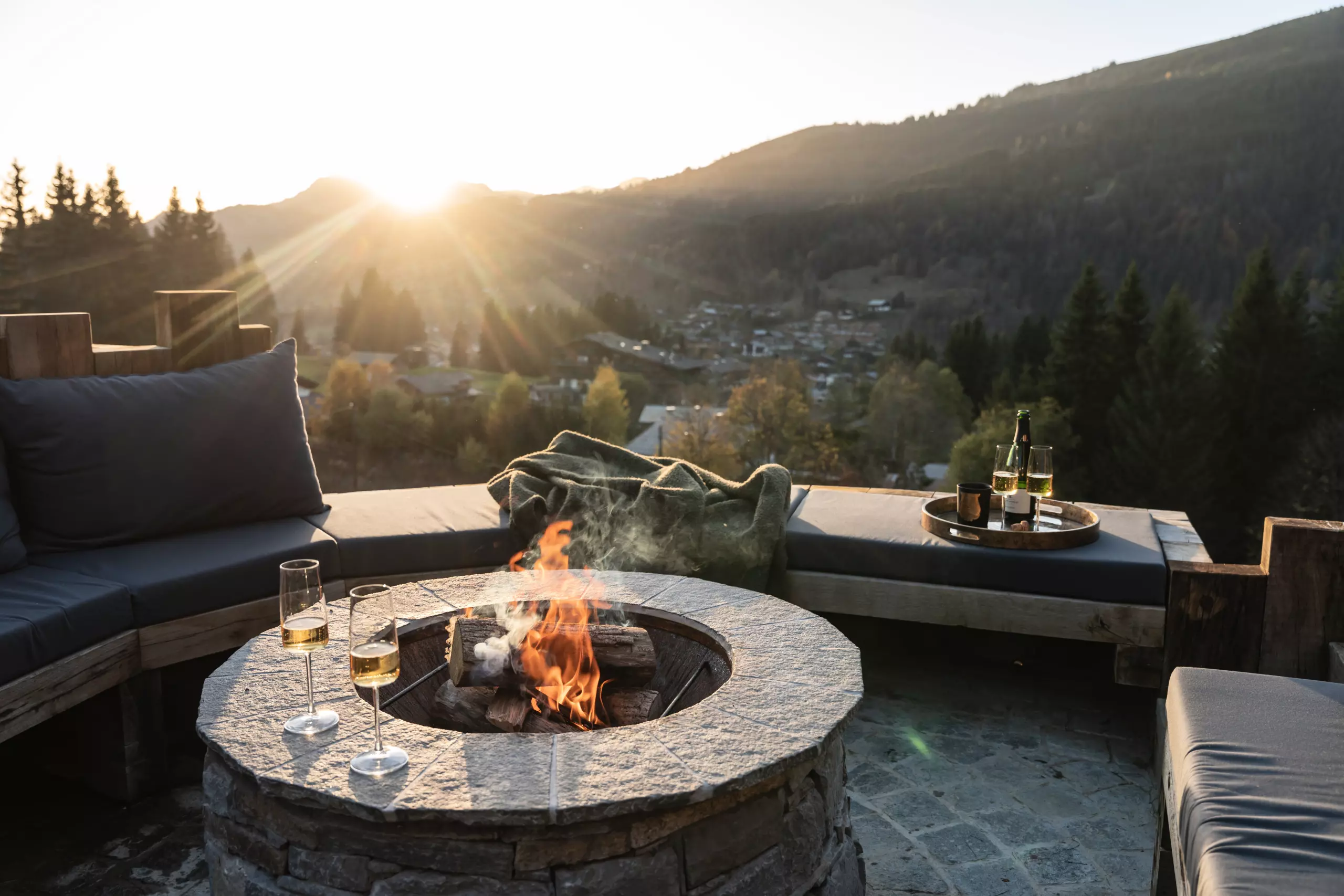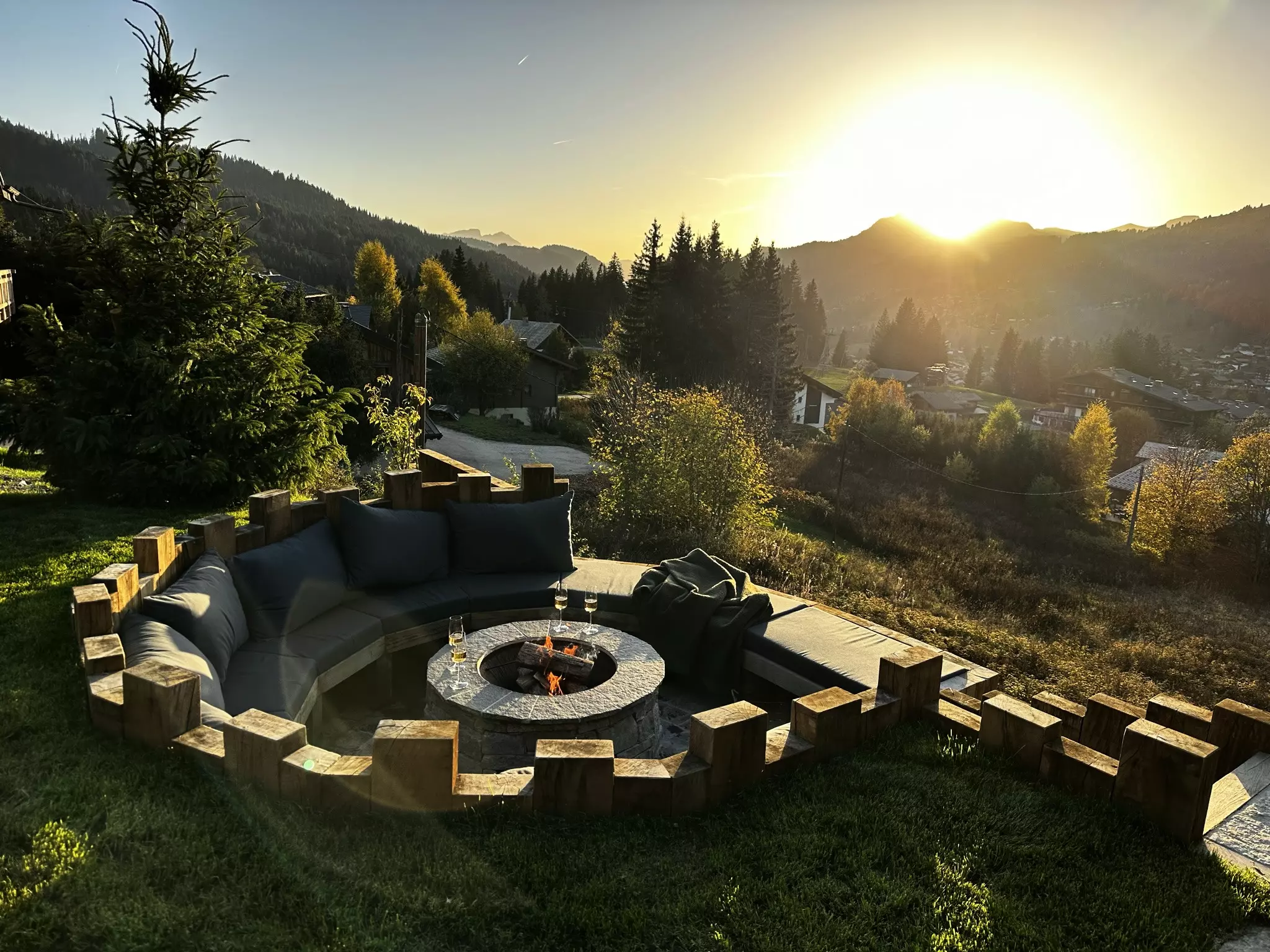 After a day on the slopes, relax in the outdoor hot tub or enjoy an aperitif on the sunny terrace, furnished with custom-made garden furniture, an outdoor fireplace, and a sound system. The chalet also features a ski room with boot warmers, a fully equipped open-plan kitchen, and a spacious living room with a large table for 10 guests and a central fireplace.