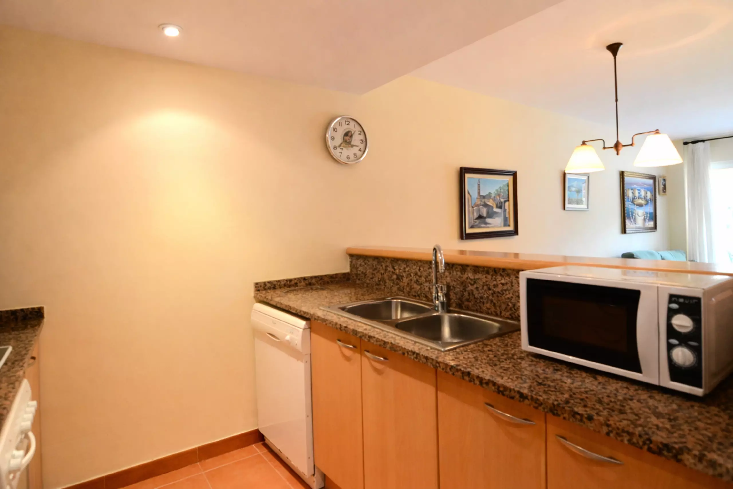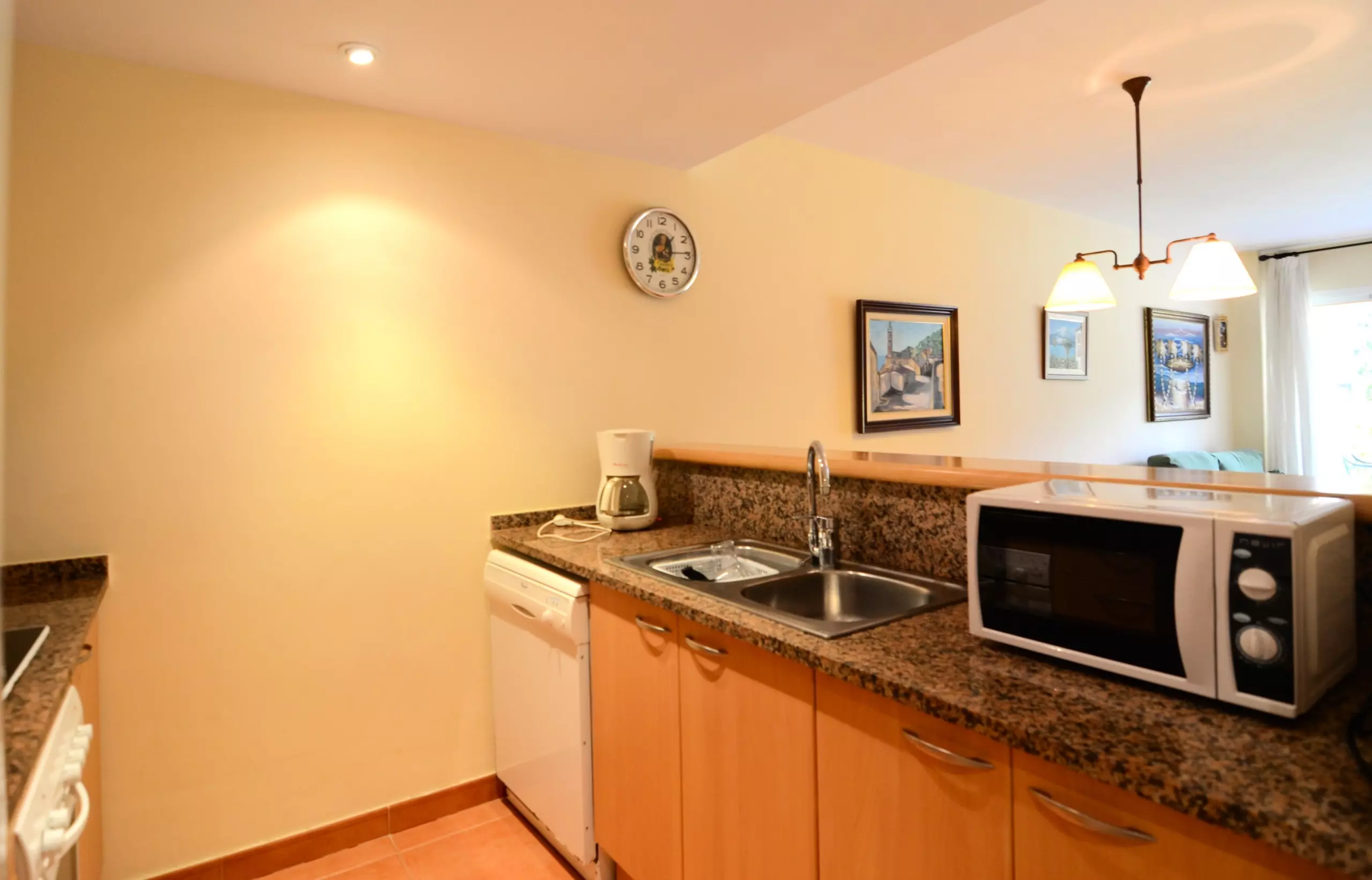 The open-plan kitchen, with ceramic hob, is equipped with a refrigerator, microwave, oven, freezer, washing machine, dishwasher, dishes/cutlery, kitchen utensils, coffee maker and toaster.