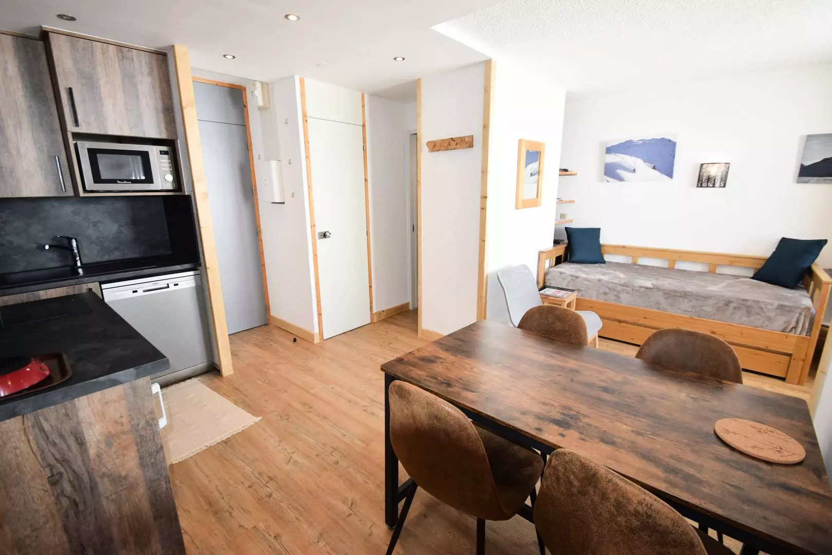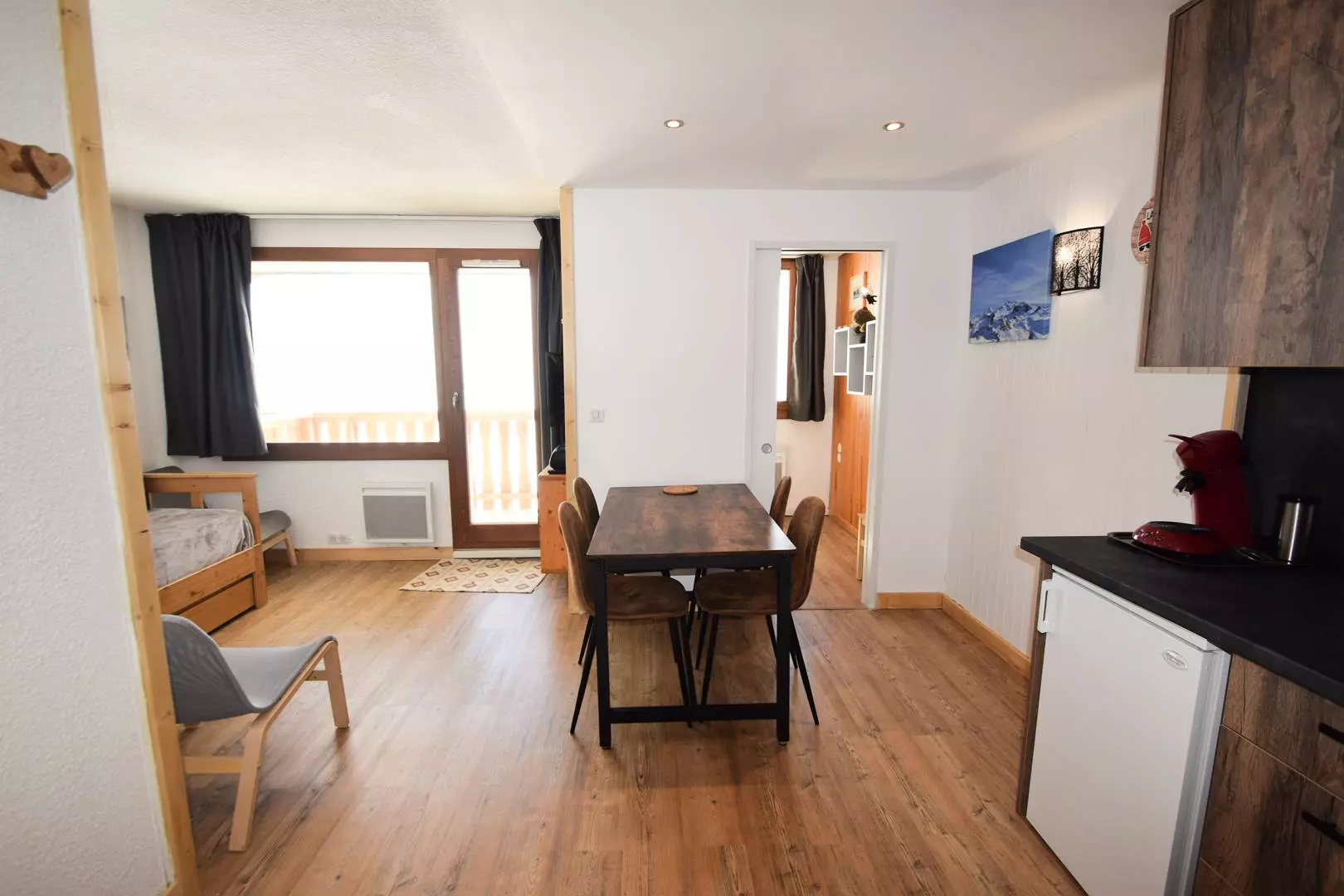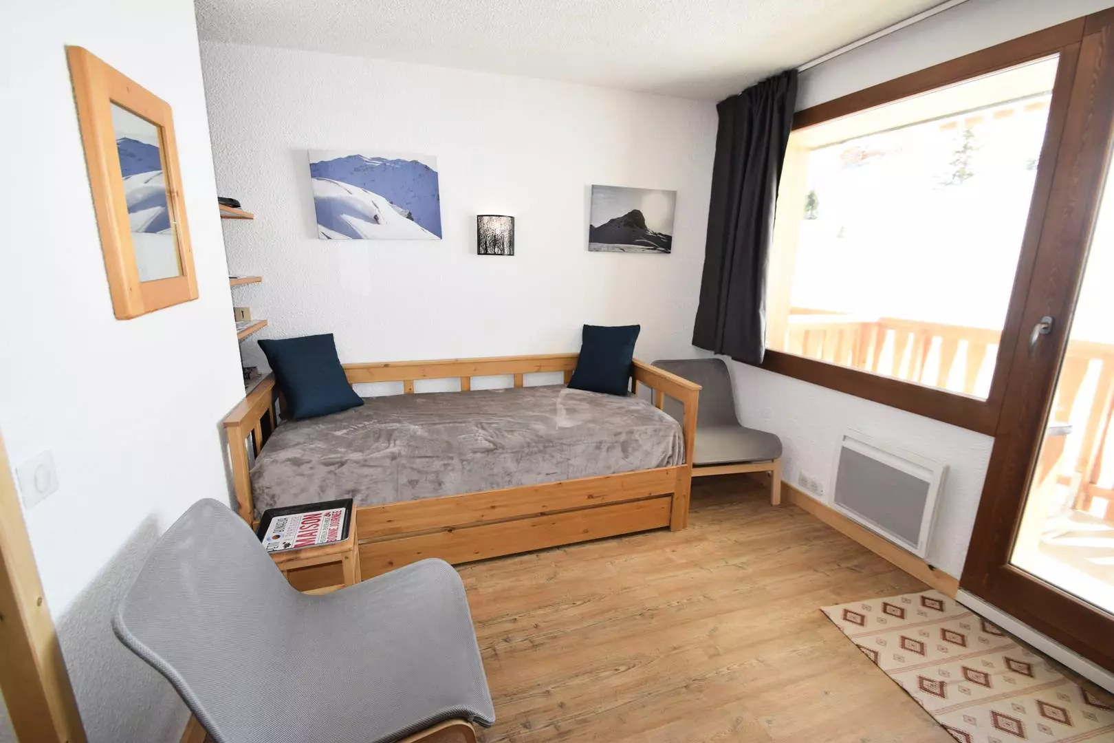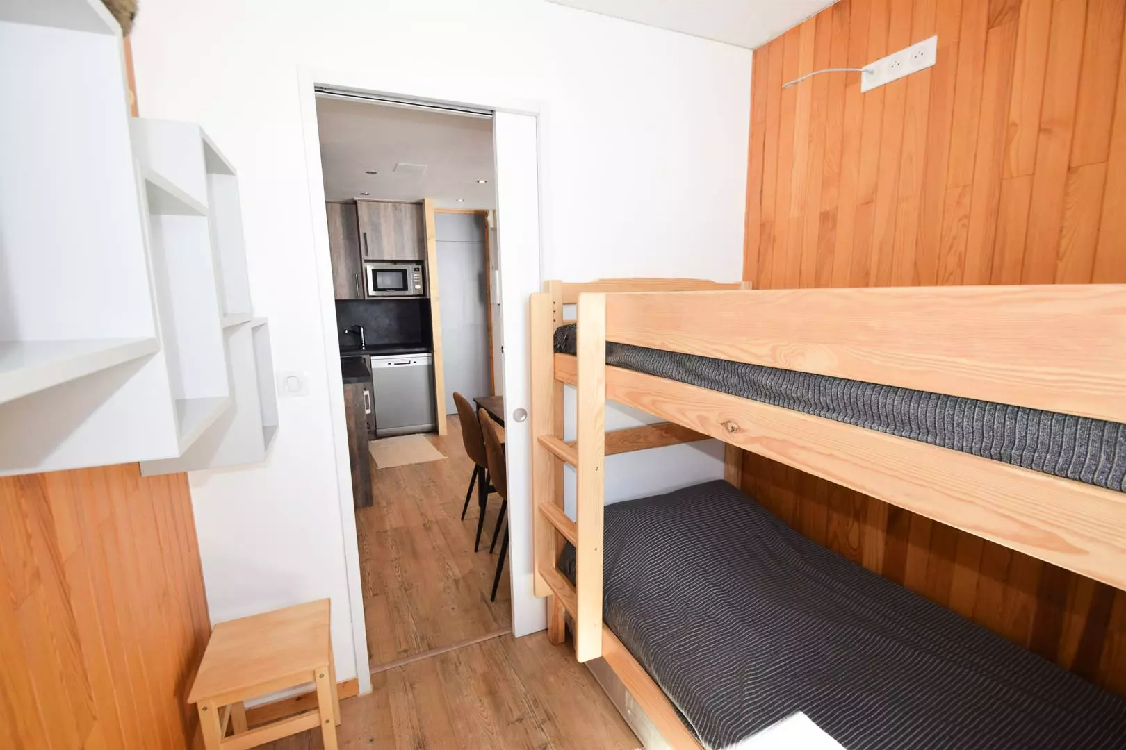 Studio + cabin for 4/5 people, 27m2, south facing, with balcony, beautiful view of the mountain and the slopes, located on the 2nd floor without elevator (the balcony gives to the 1st floor slope side) Entrance N° 2: right staircase - KITCHENETTE: 2 ceramic hobs, refrigerator, dishwasher, multifunction oven. LIVING ROOM: lounge area 2 pull-out beds forming a bench, TV - Closed cabin: 2 bunk beds + 1 drawer bed - BATHROOM: shower, separate WC. Bedding: 3 single duvets and 1 double duvet. Floors: PVC - Sheets and end of cleaning not included - Ski locker: N°42 on the ground floor - Studio with beautiful view of the slopes and the mountains, quiet - Non-smoking apartment and pets not allowed - The residence: small 3-story residence, quiet, located at the foot of the slopes, approx. 700m from shops, connected to the village by free shuttle buses (8am-midnight) -