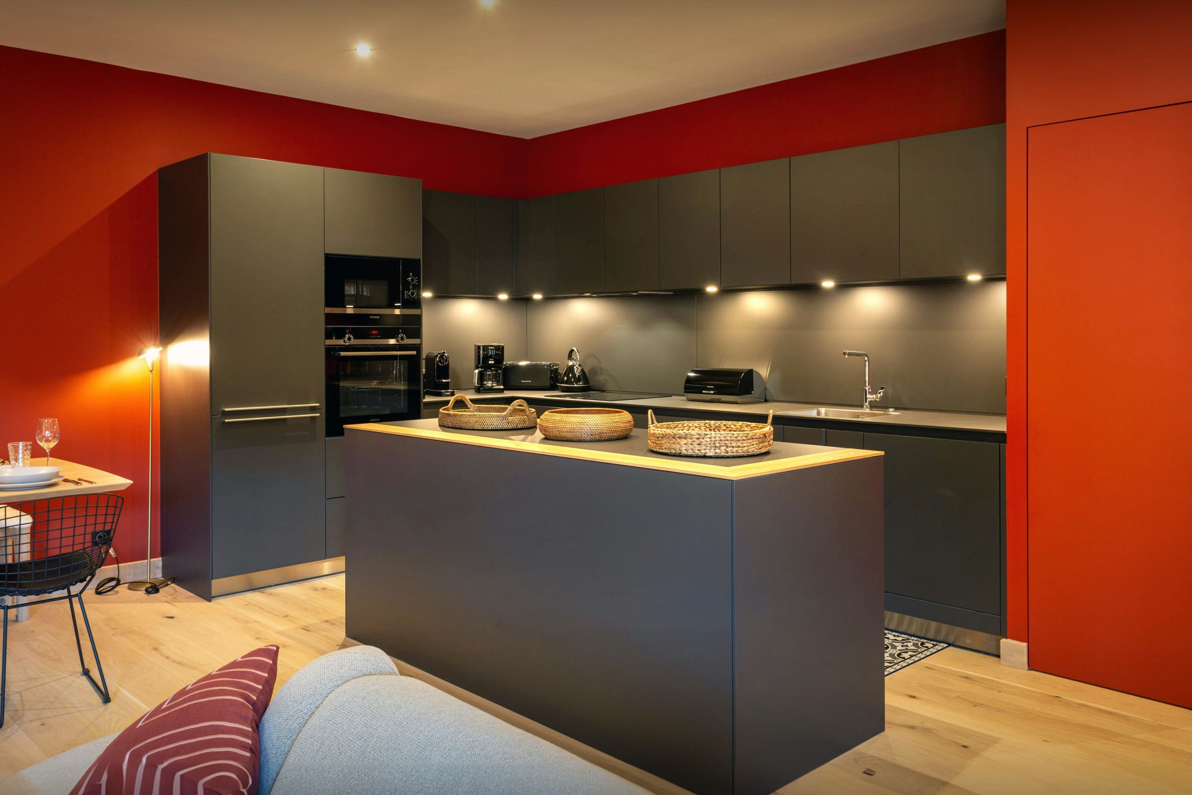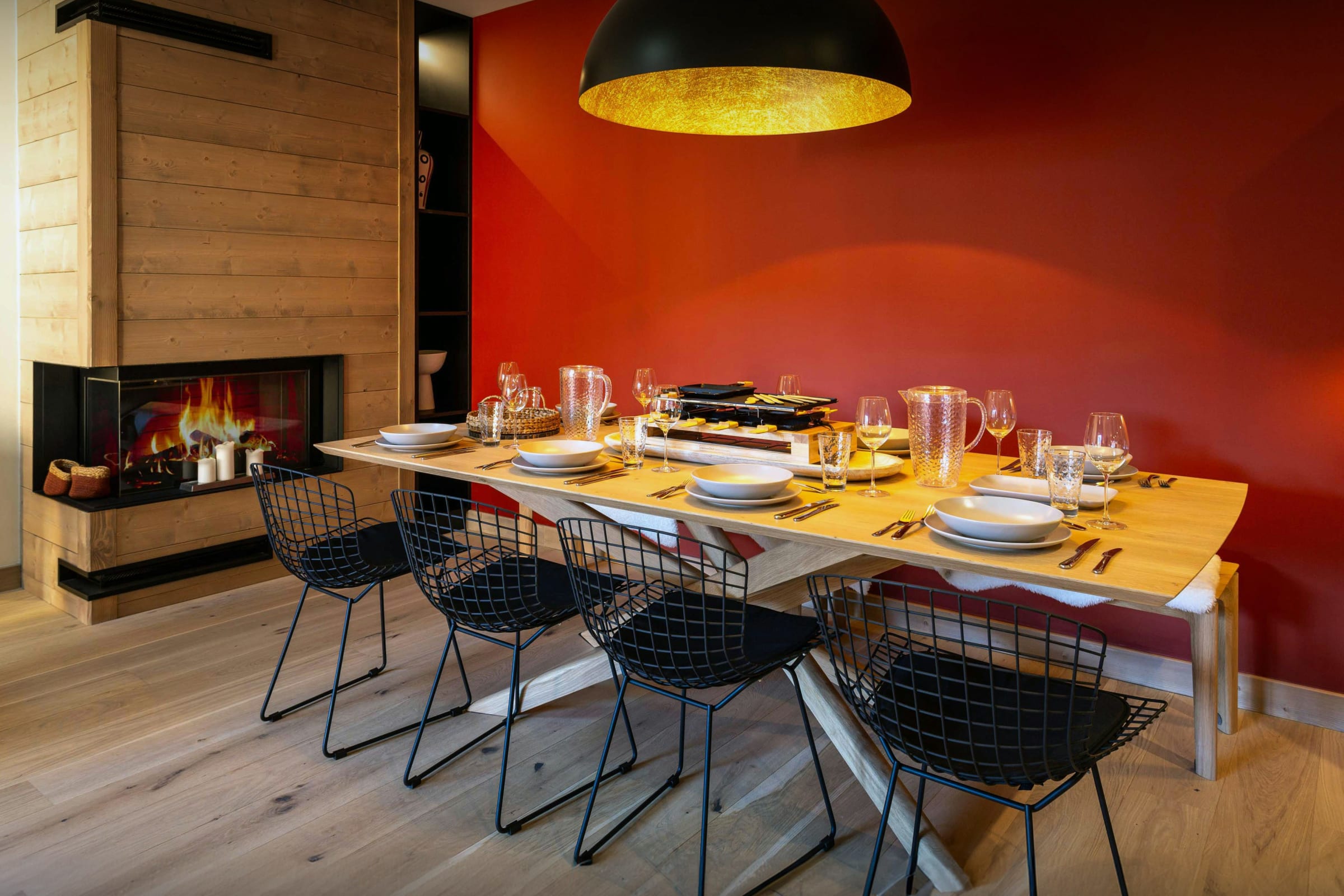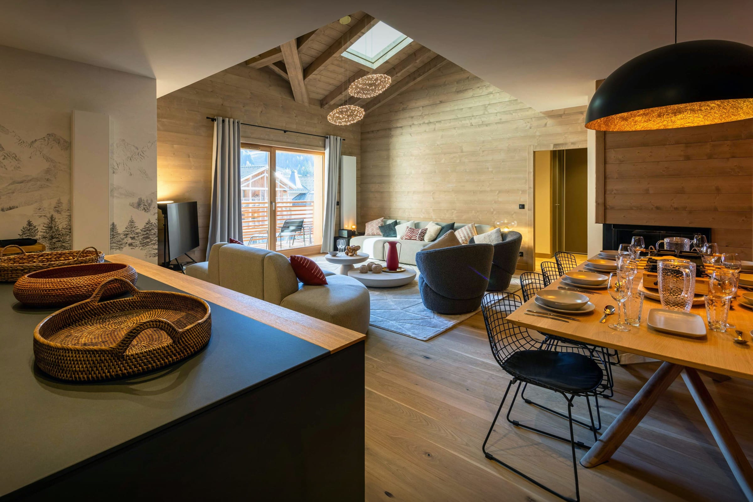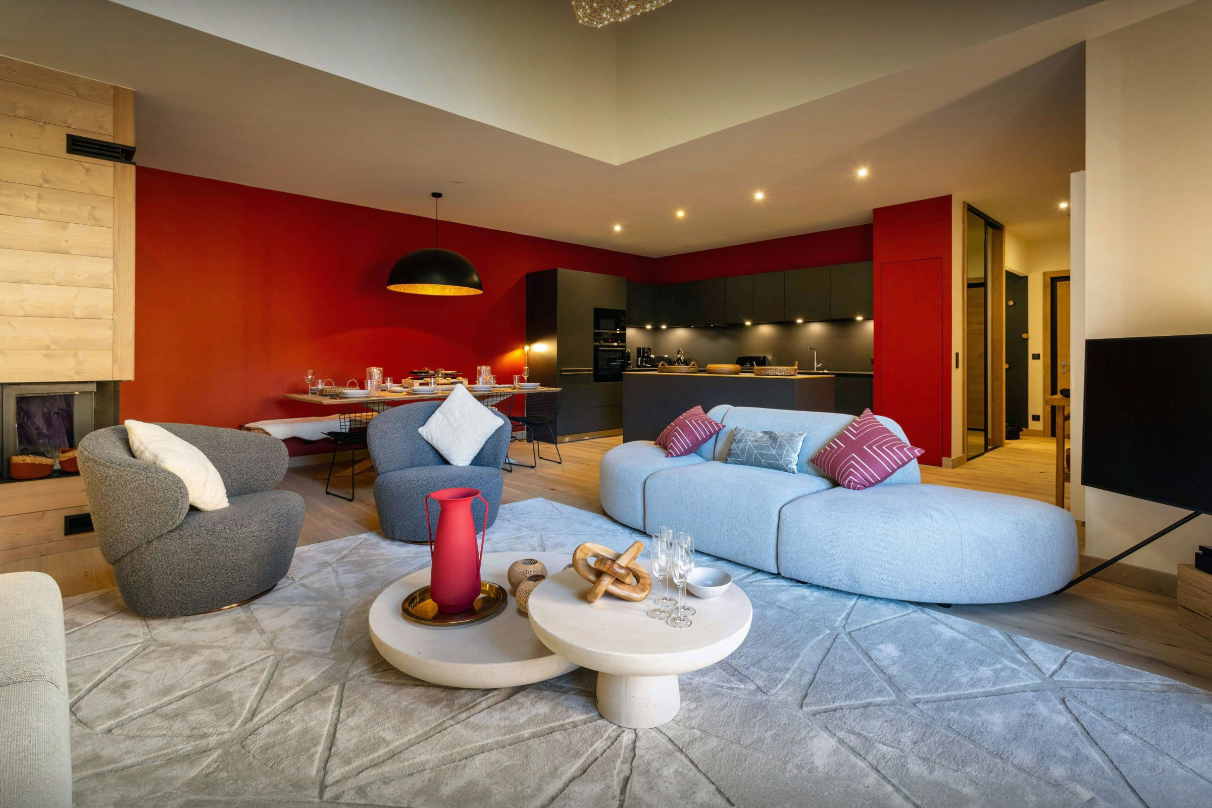 It's a beautifully decorated apartment, with a modern, well-equipped kitchen, a big seating area with cosy sofas and chairs and a dining table in front of the fire for cosy evening meals together.
