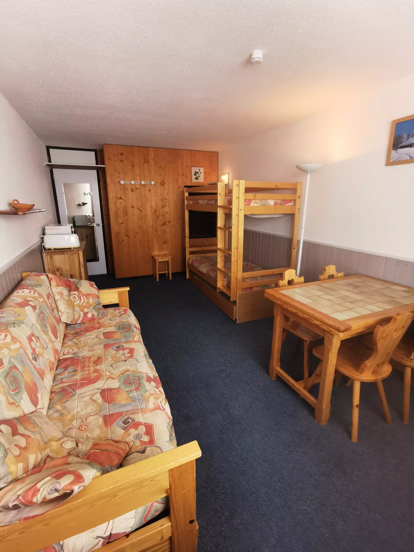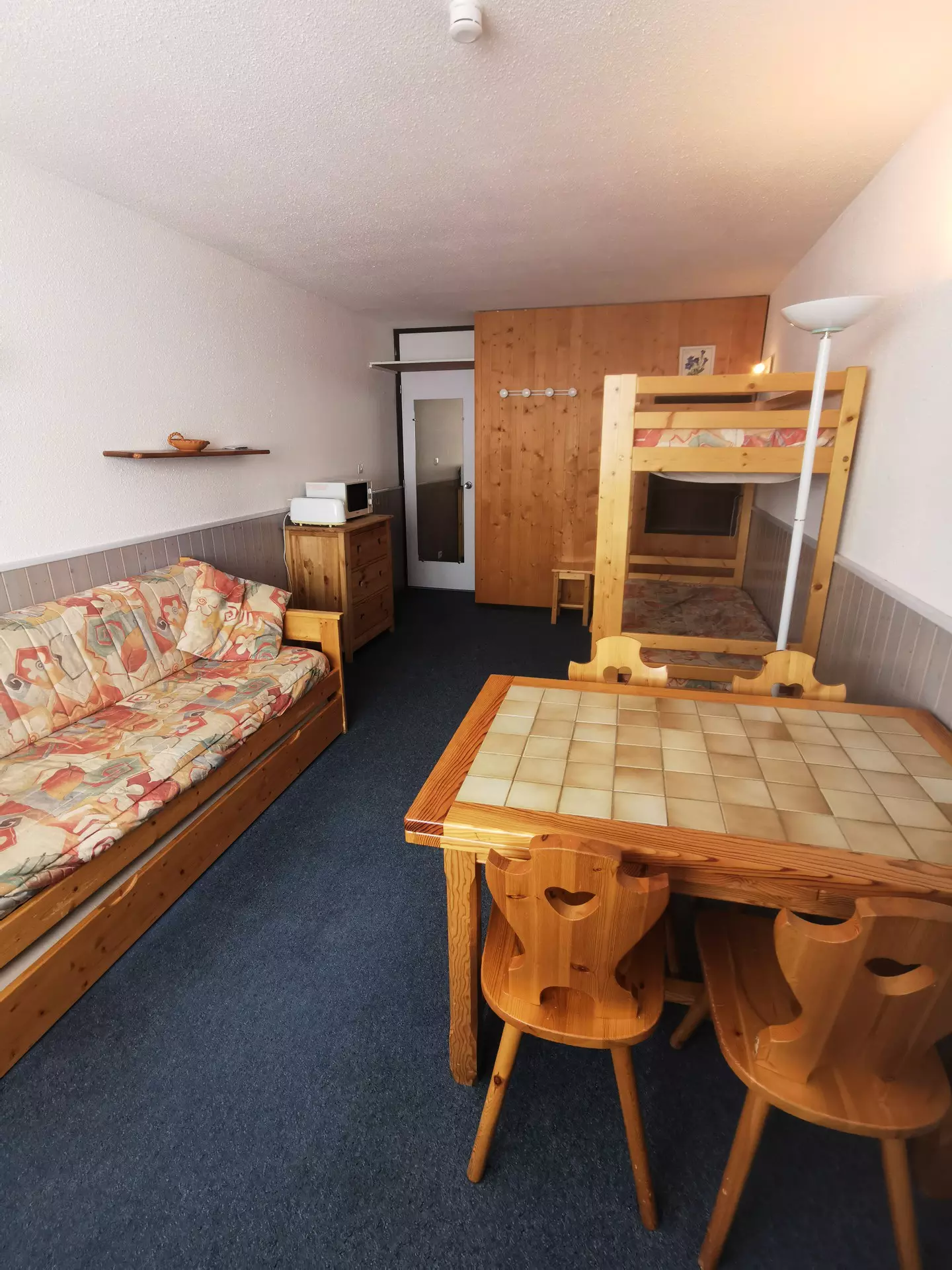 This studio is located on the "N" level of the Paquebot des Neiges and is accessible by the "Diamant" elevator. It consists of a living room, a separate kitchen, a bathroom, and a separate toilet. Its south-facing balcony offers a lovely view of the slopes of the Aime 2000 resort.
