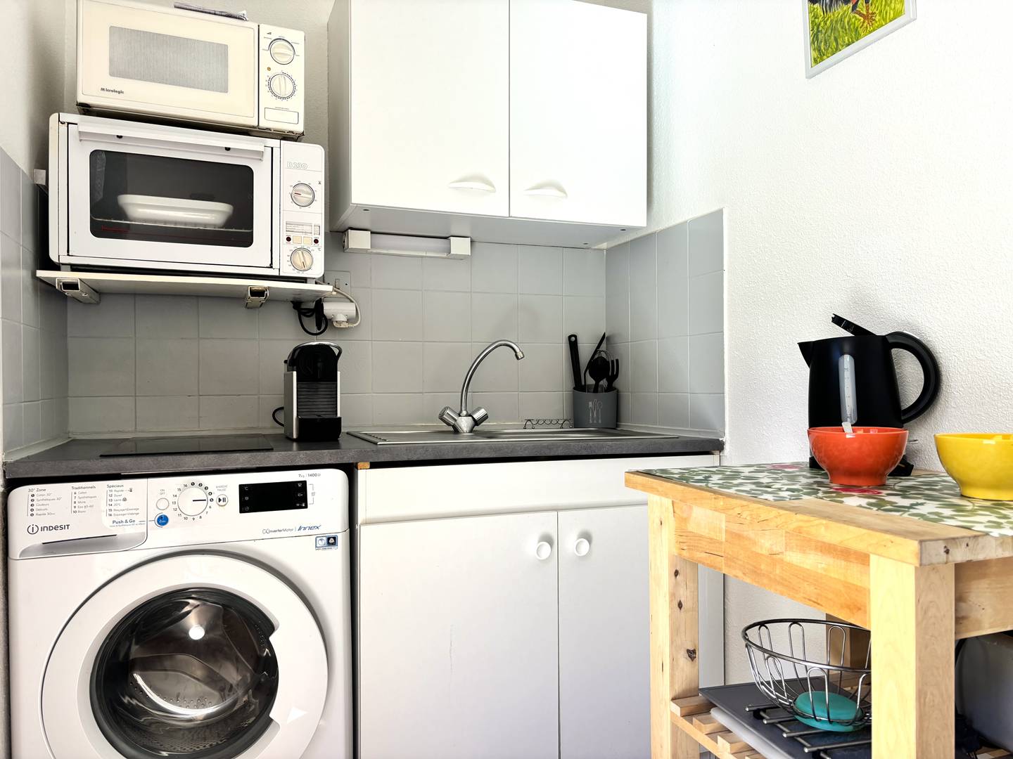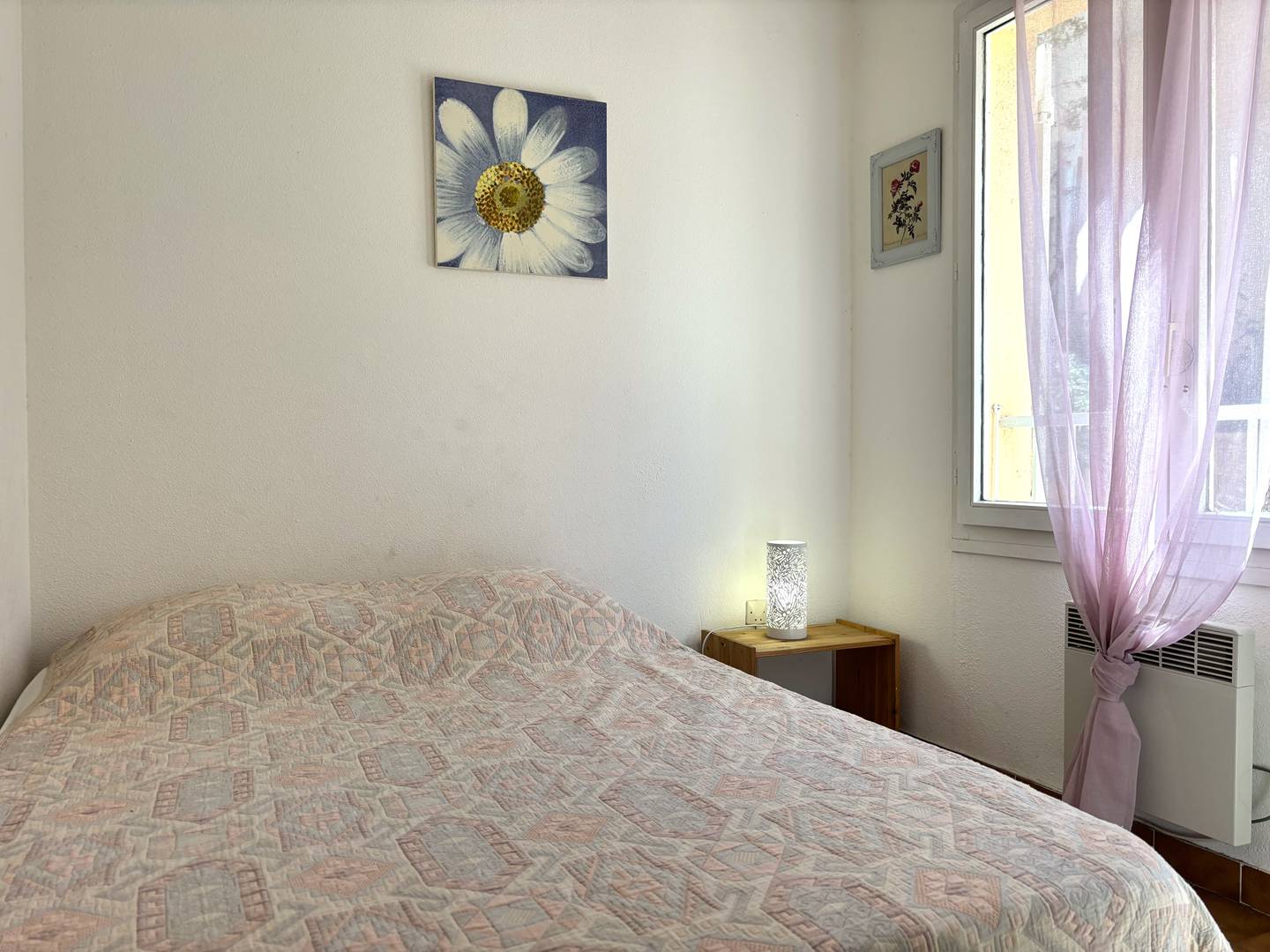 This 3-room apartment consists of a living room with its open fitted and equipped kitchen (oven, hob, fridge-freezer, microwave) with direct access to the exterior, there are two bedrooms with a double bed 140x190cm, a bathroom, a separate toilet with washing machine.