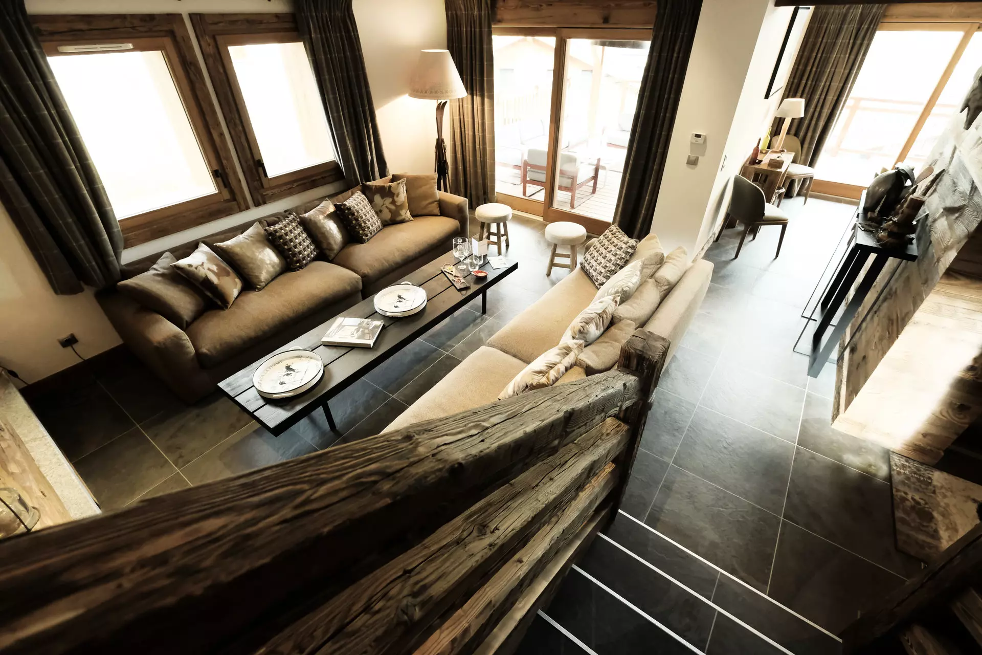 Beautiful living room of approximately 50m², cozy lounge with fireplace and dining room with magnificent view of the surrounding mountains.