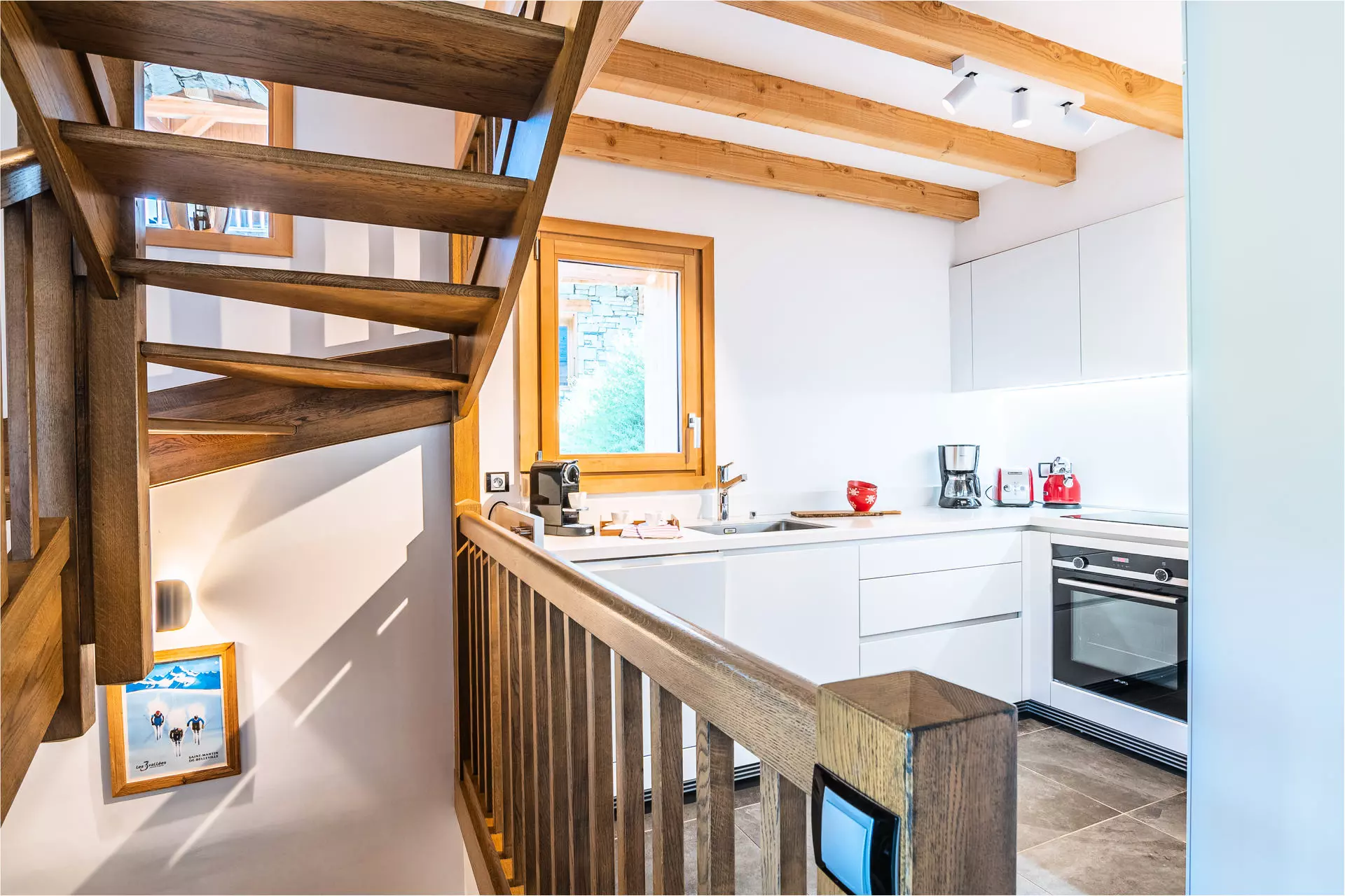 Open kitchen with 4 induction hobs, fridge, dishwasher, oven, microwave, kettle, toaster, filter coffee maker and Nespresso machine.