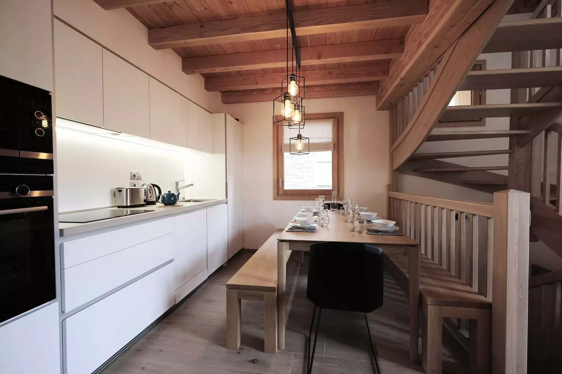 Fully equipped kitchen: induction hob, dishwasher, oven, microwave, kettle, toaster and French press coffee maker.