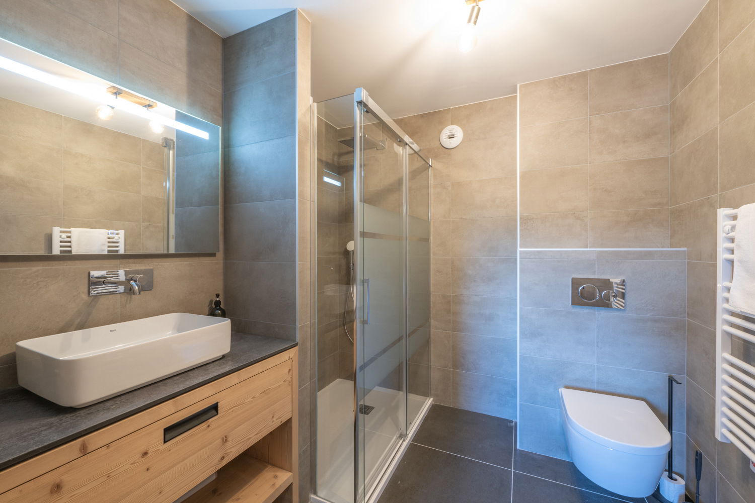 -1 double bedroom en suite with 180x200 bed, shower room, single washbasin, towel warmer and WC