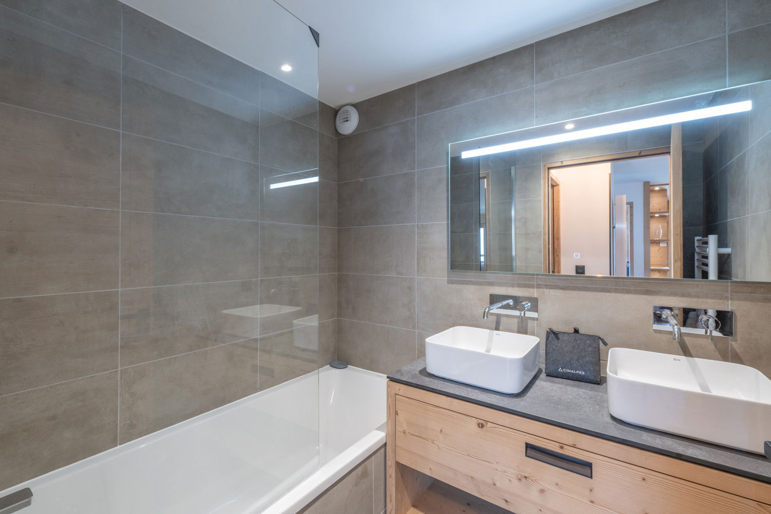 -1 independance bathroom with bathtub, double washbasin, WC, and towel warmer