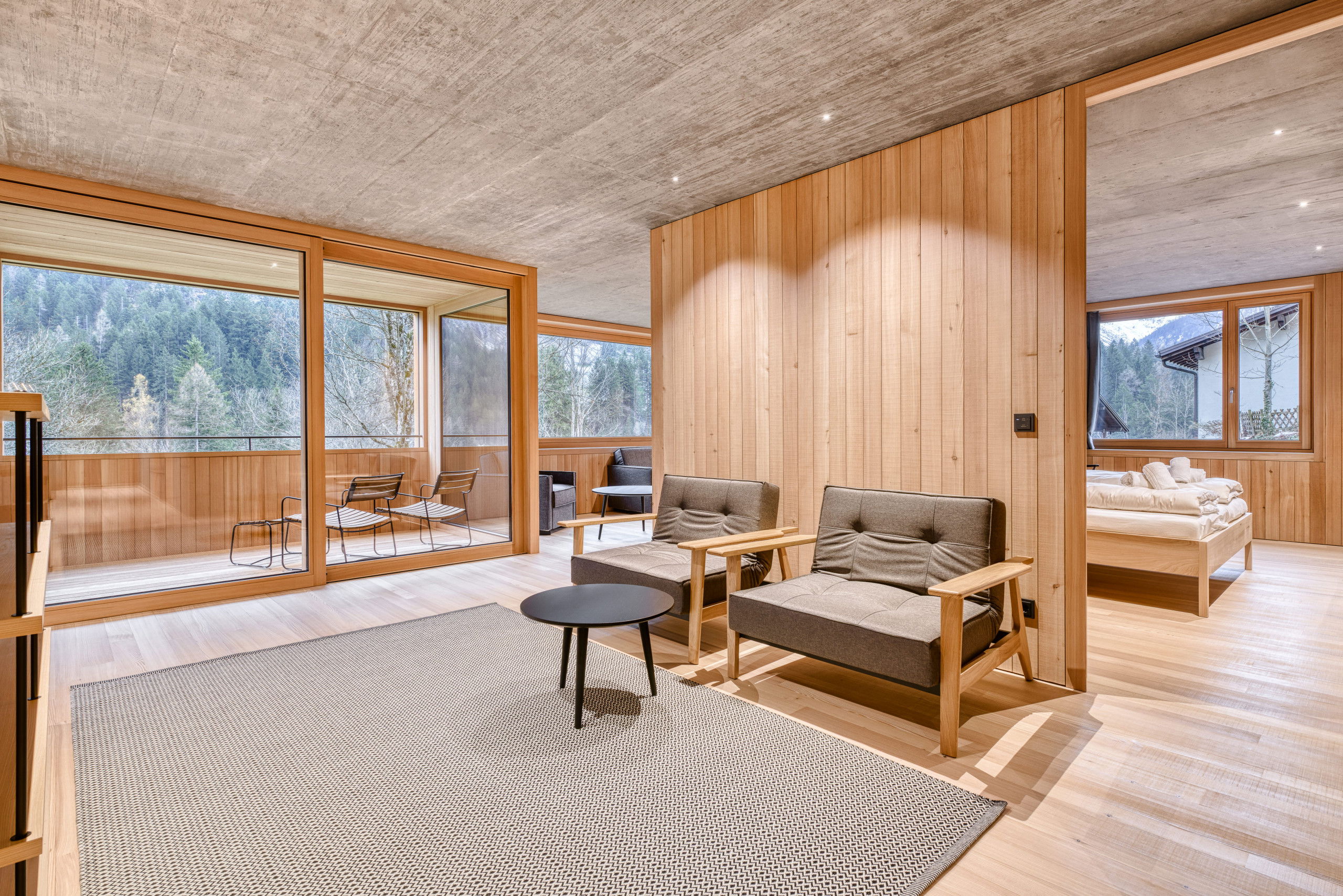 In the middle of the tranquil mountain landscape of Brand, you'll find a place to arrive together: a spacious apartment with 110 m² of living space – made for four to six people. Two bedrooms, clear architecture and noble materials create space for relaxed days with a view of the greenery. And the best part: your very own sauna and the loggia with a panoramic view are simply included.