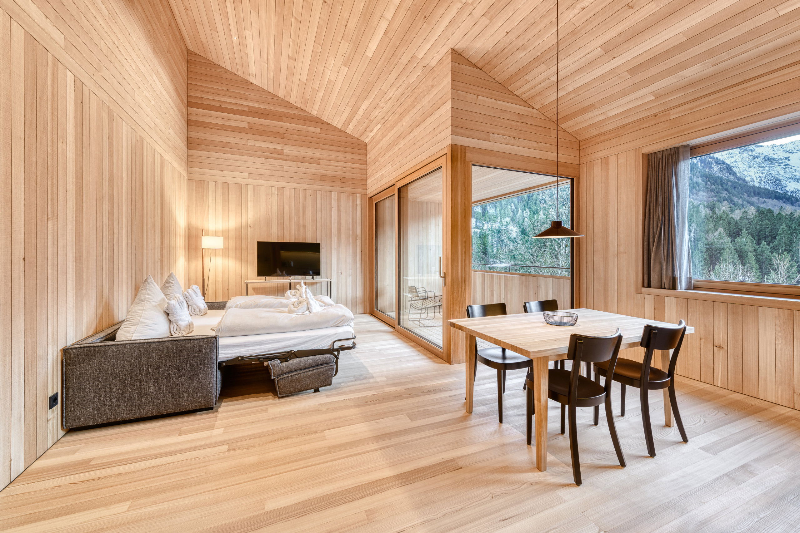 With 57 m² of living space, a double bed in the bedroom, a cosy living area with a sofa bed and a loggia with mountain views, everything is here that you need for a relaxing break. The private steam shower ensures relaxation - whenever you want.