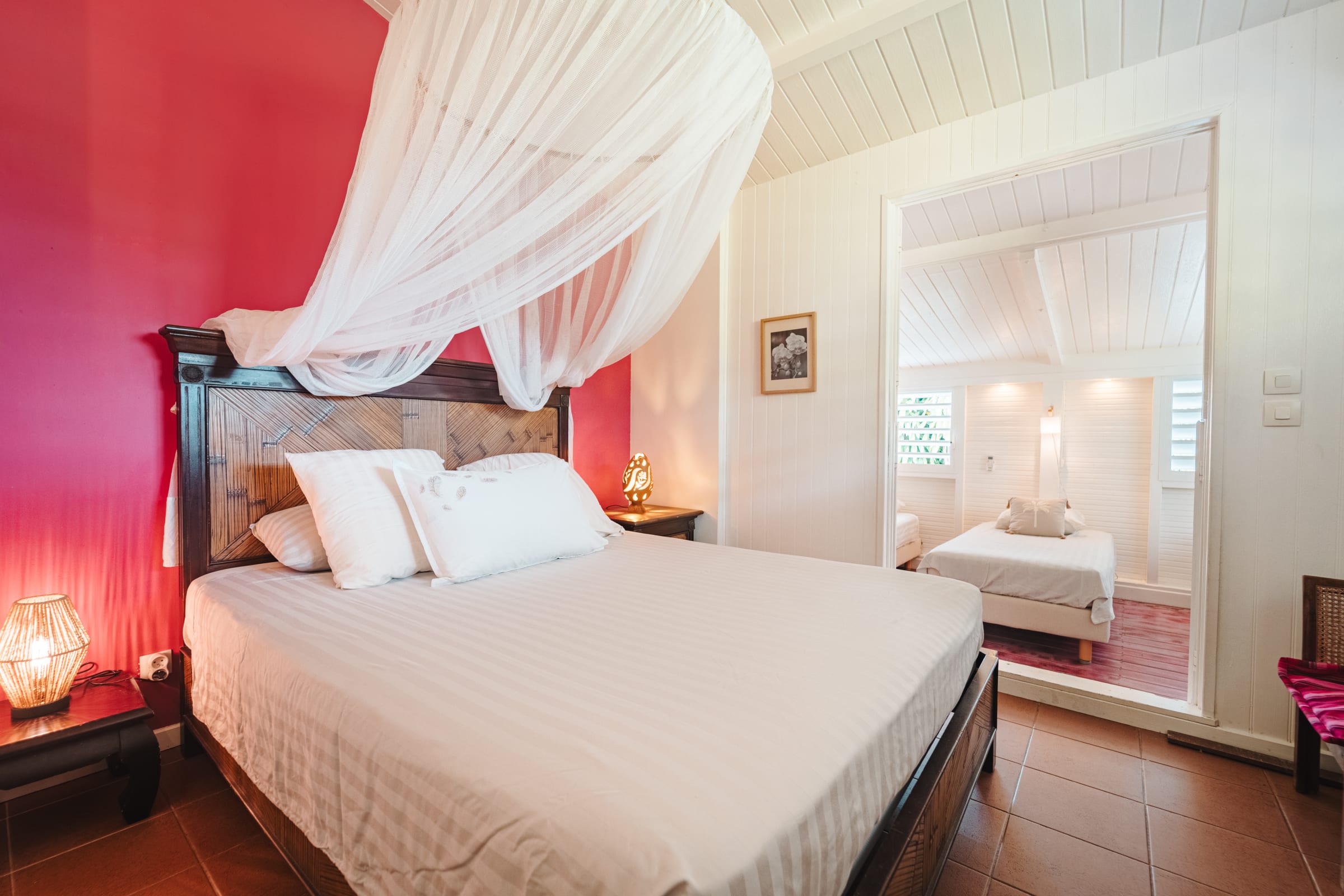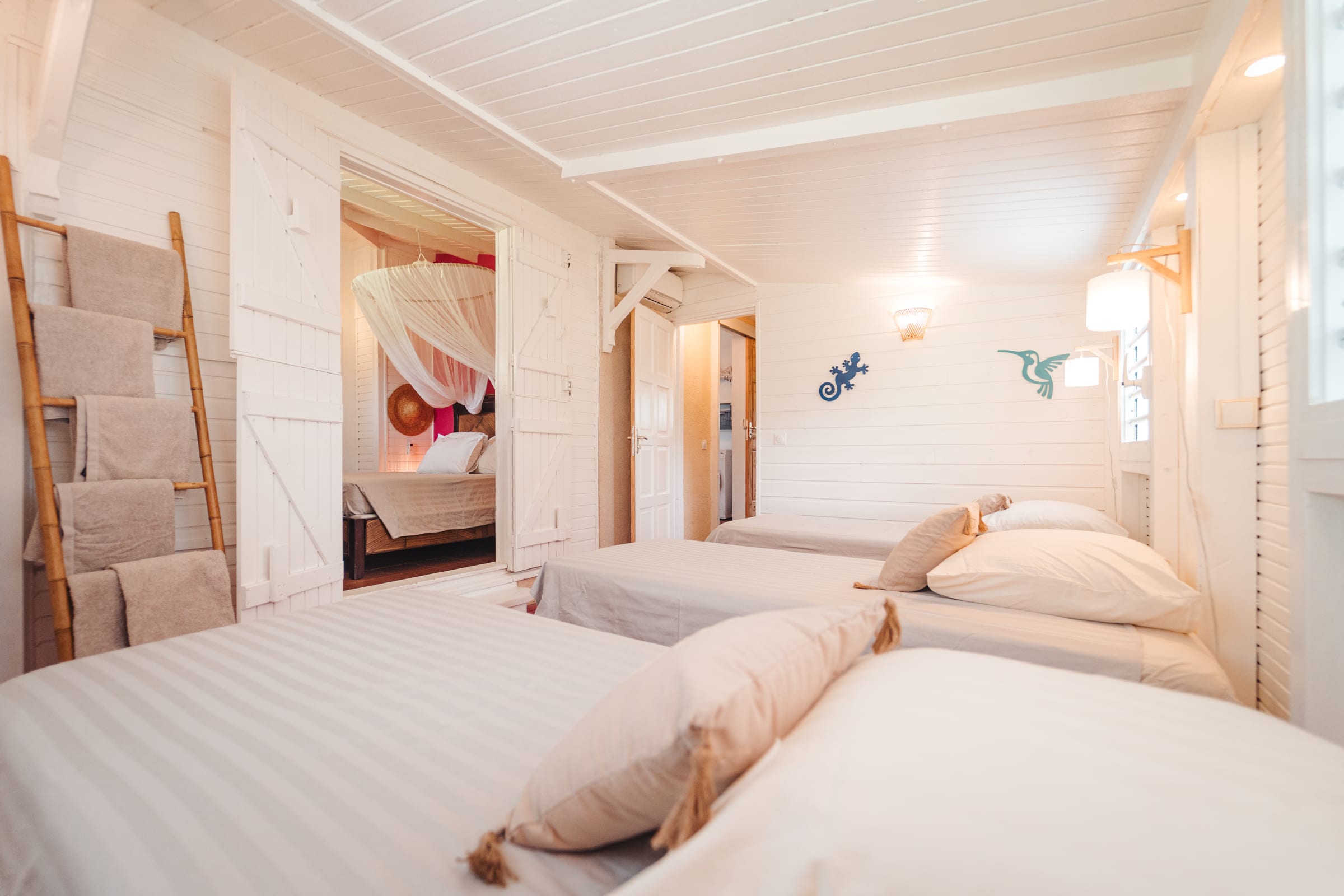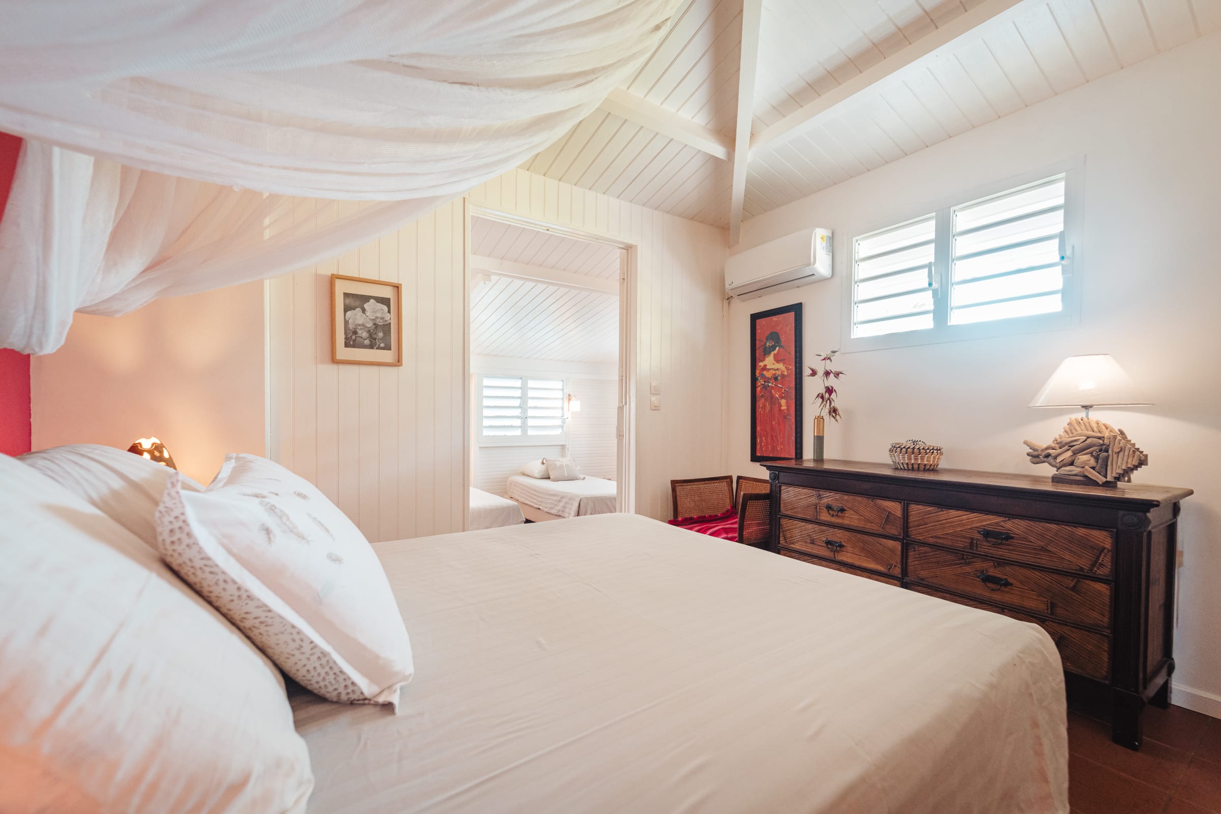 The property features 6 air-conditioned bedrooms spread between the main villa and an independent bungalow, as well as a mezzanine. Each bedroom is equipped with double or single beds, mosquito nets, and access to a shower room.