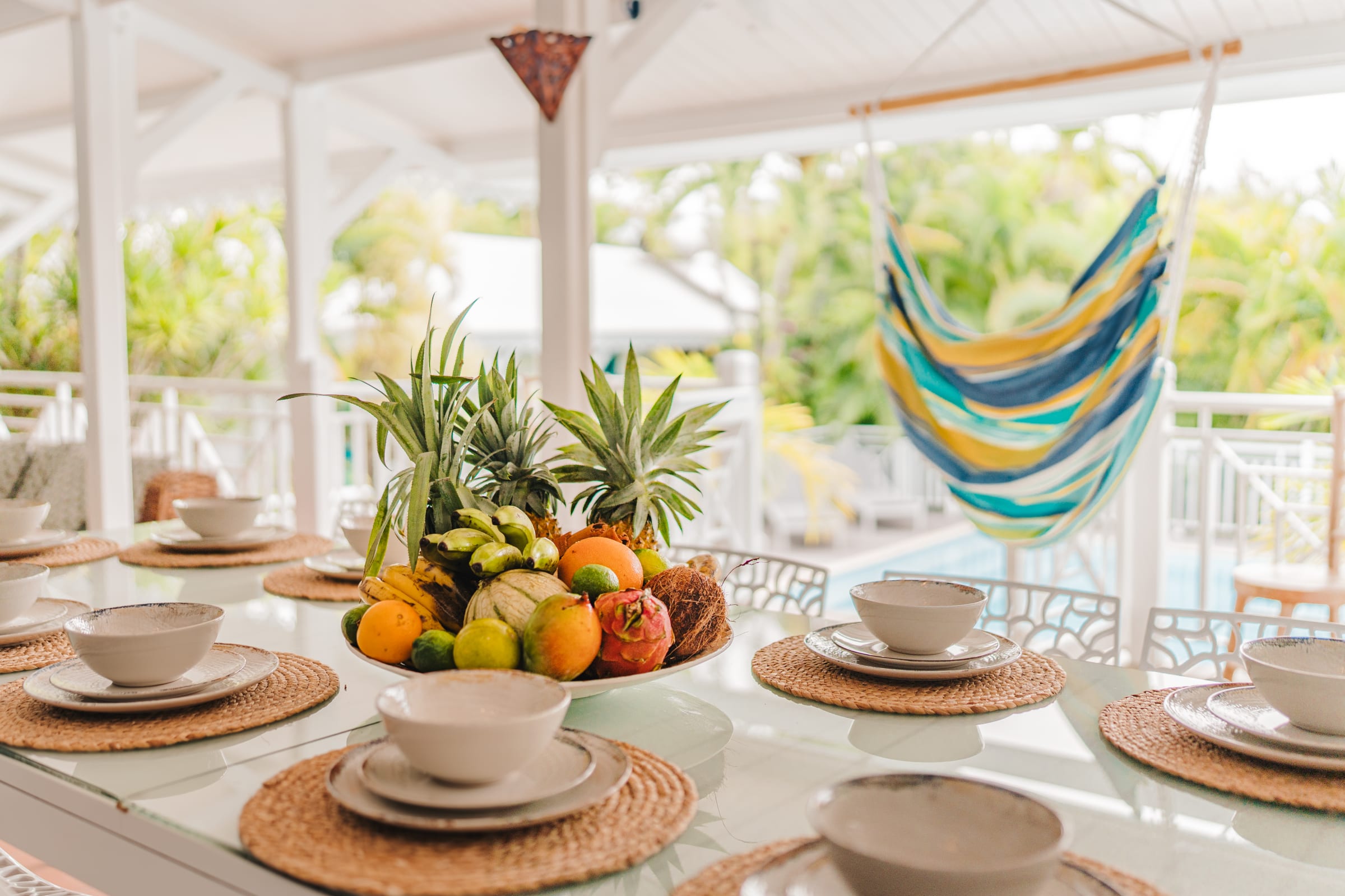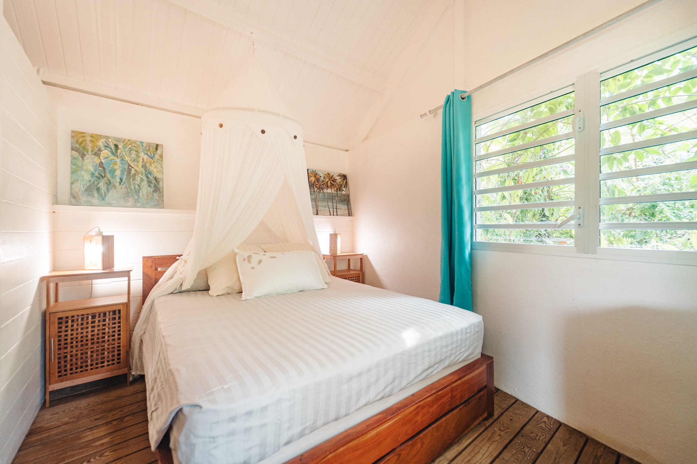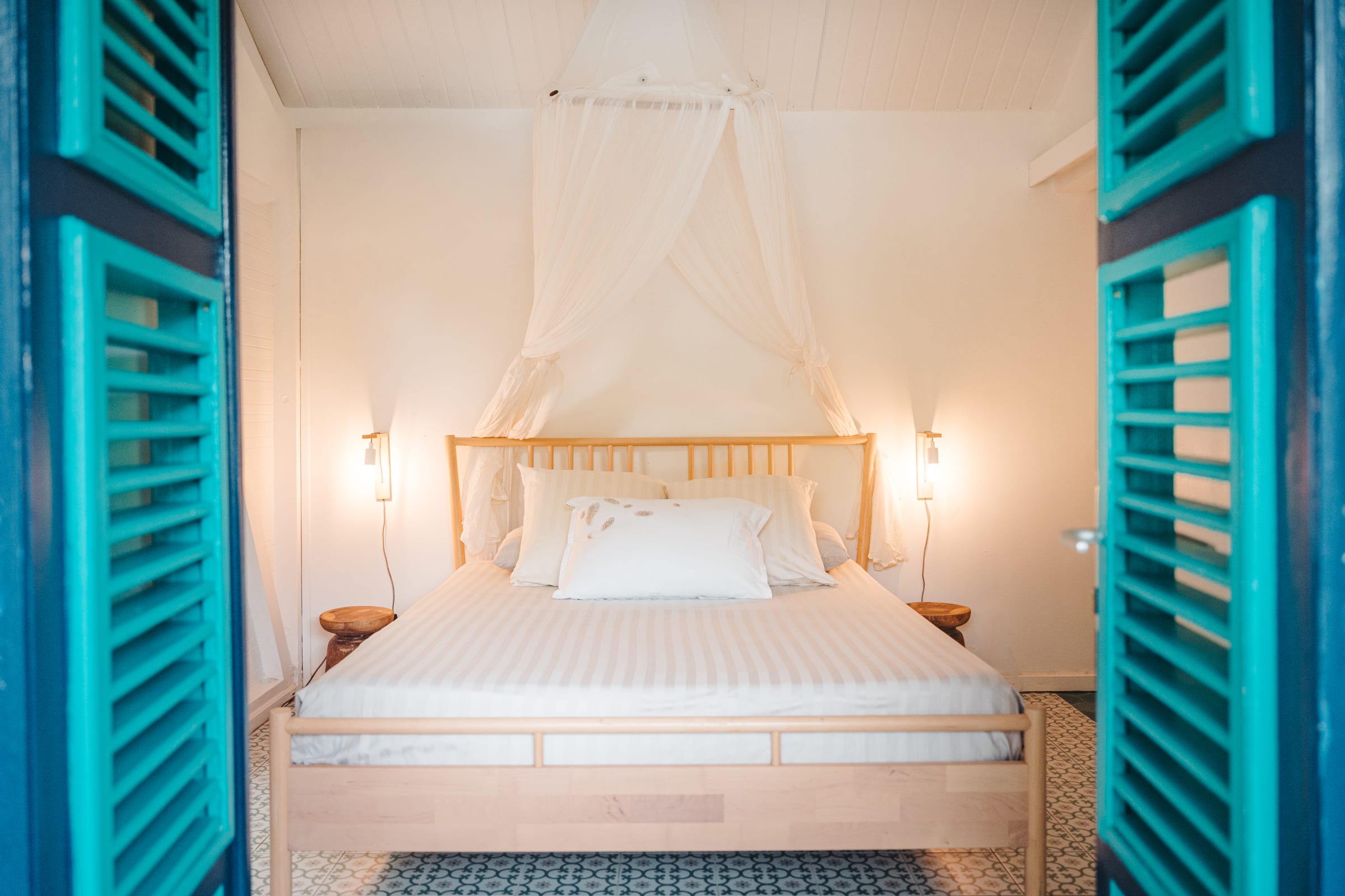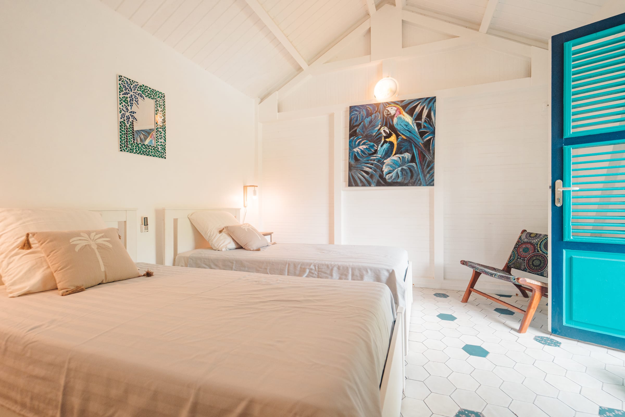 The property features 6 air-conditioned bedrooms spread between the main villa and an independent bungalow, as well as a mezzanine. Each bedroom is equipped with double or single beds, mosquito nets, and access to a shower room.
