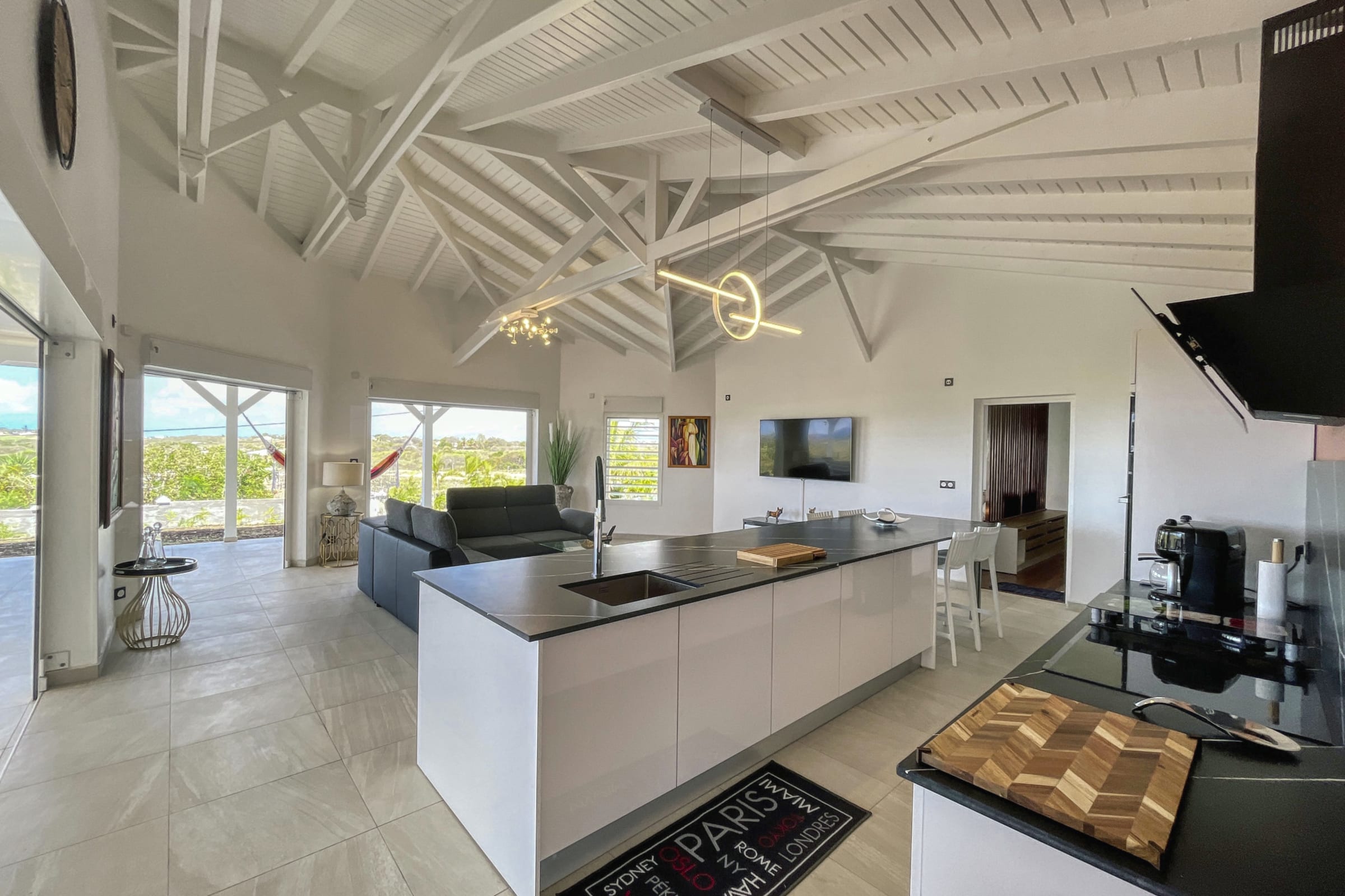 The villa features bright, open living spaces with tasteful decor and high ceilings. The comfortable lounge opens directly onto the covered terrace. The fully equipped kitchen includes a stunning marble island and opens onto the cozy living room with TV.