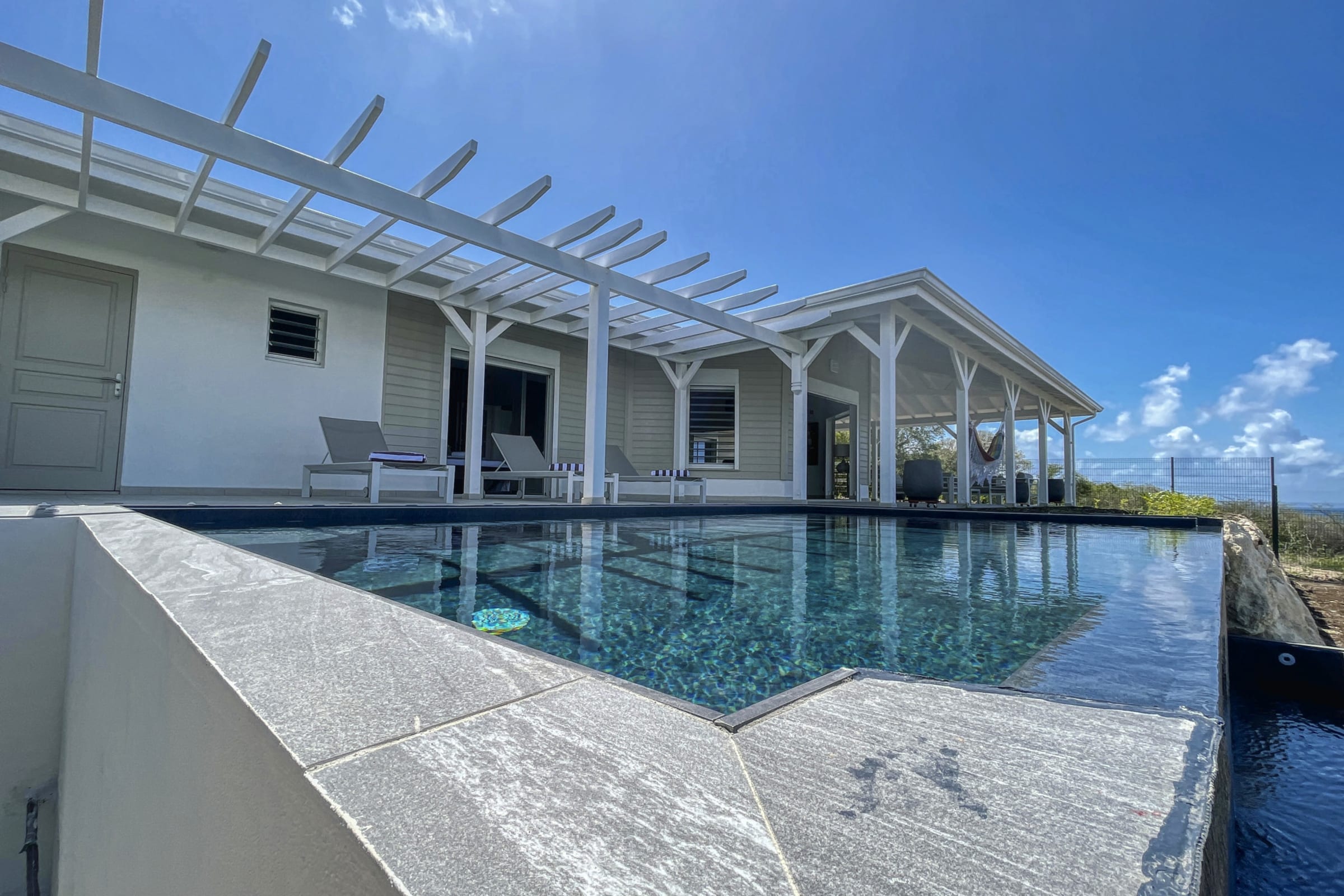 The semi-covered outdoor terrace includes a lovely dining area, a cozy lounge space, and a hammock perfect for shady naps. A beautiful pool lined with sun loungers invites you to unwind while enjoying the sea view.