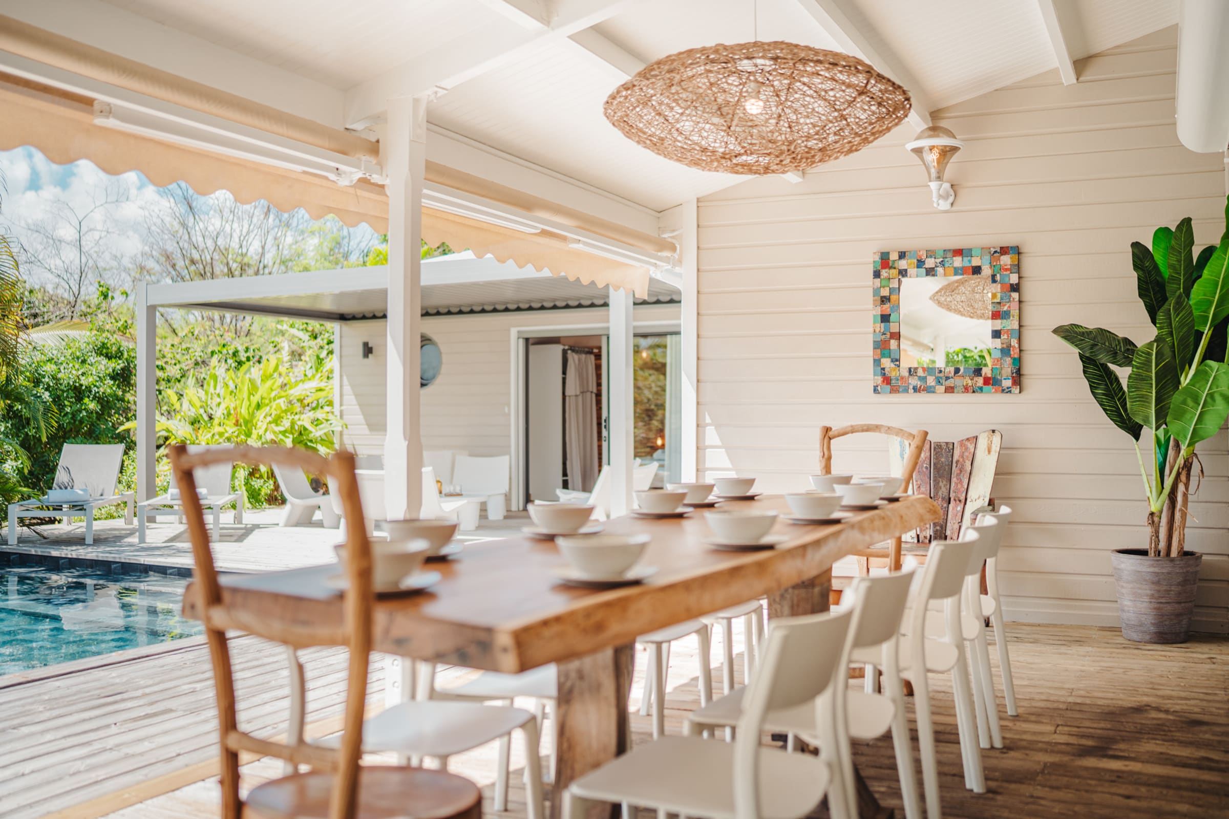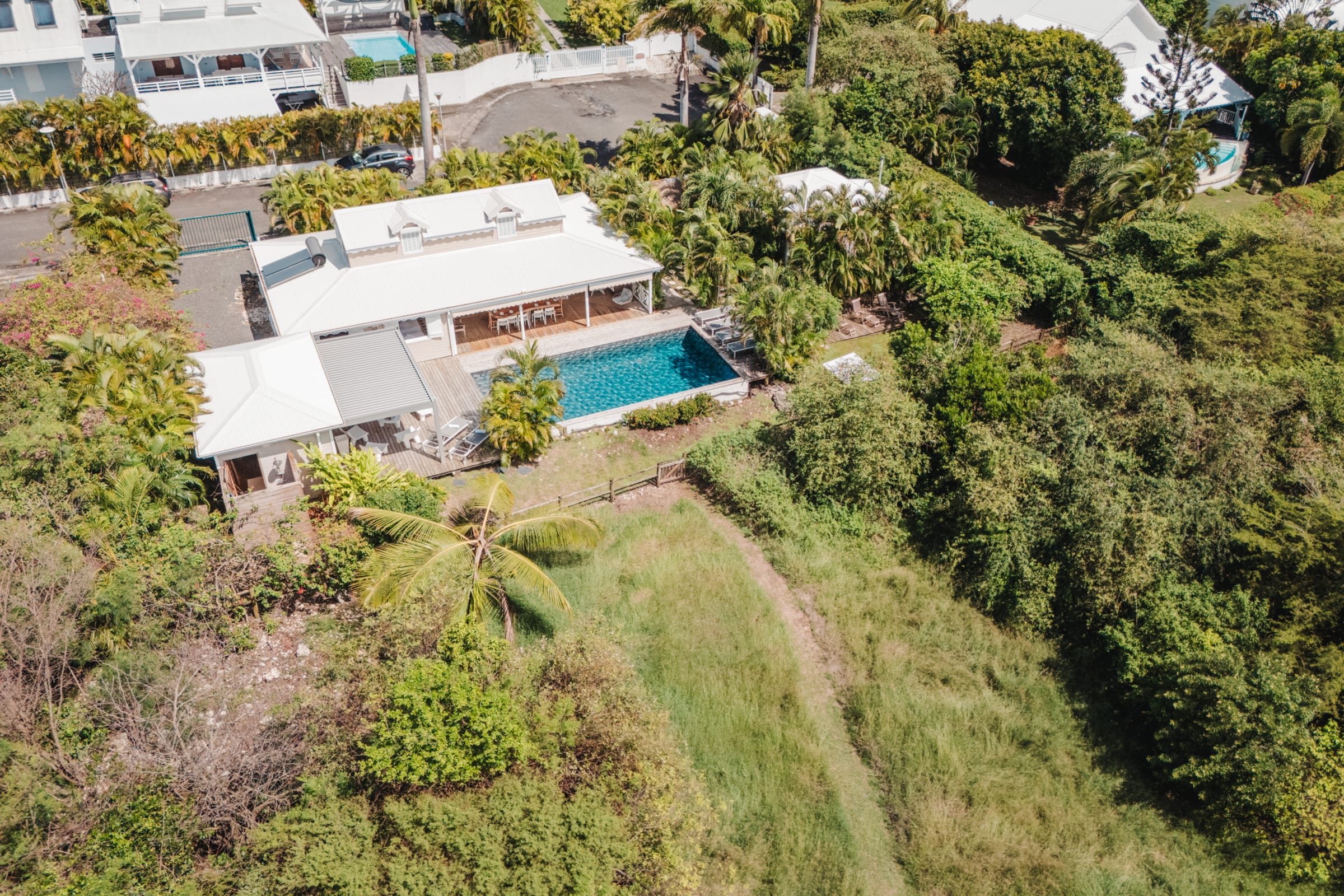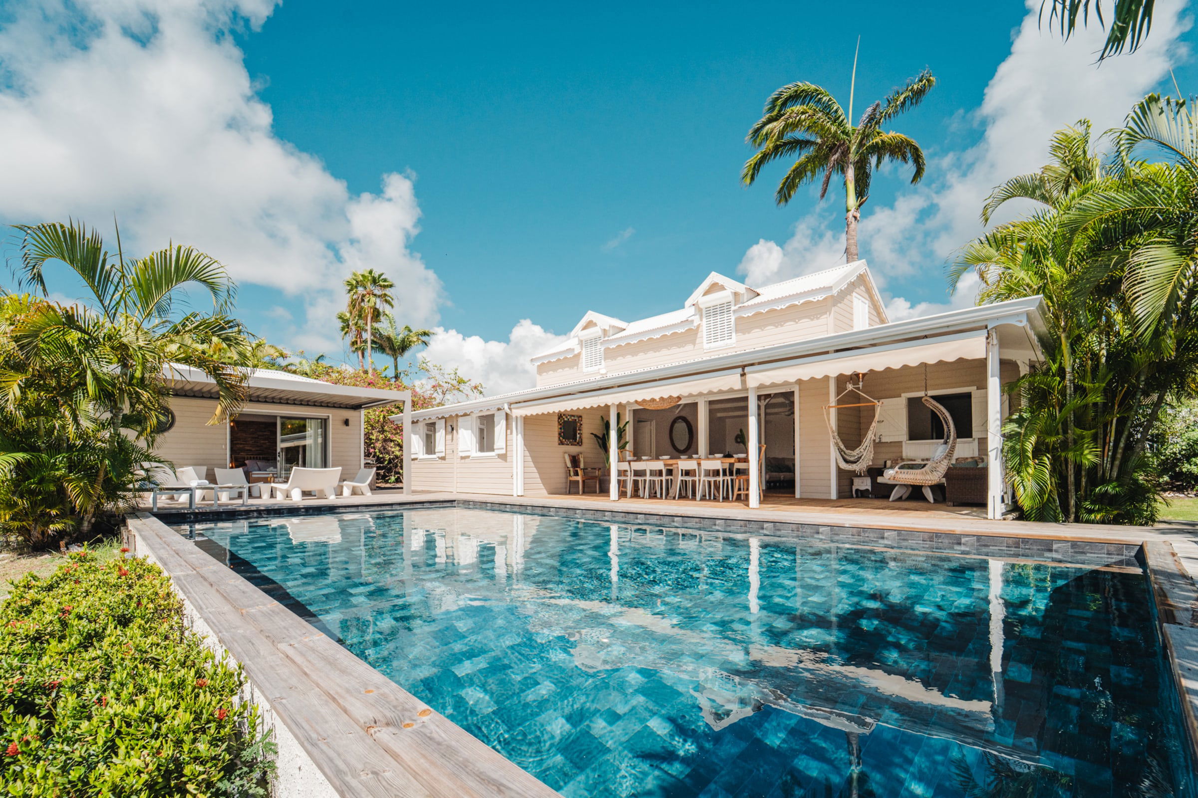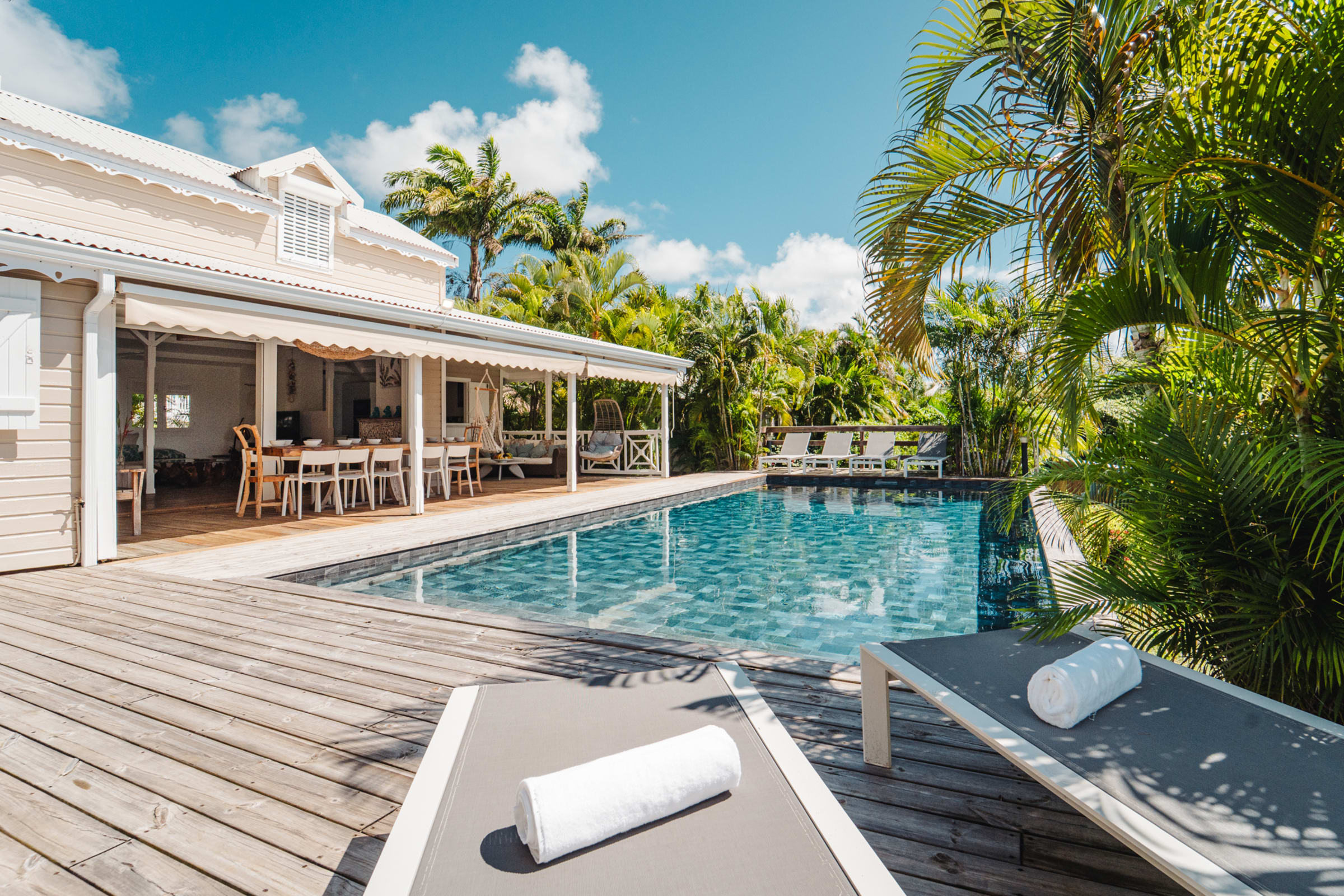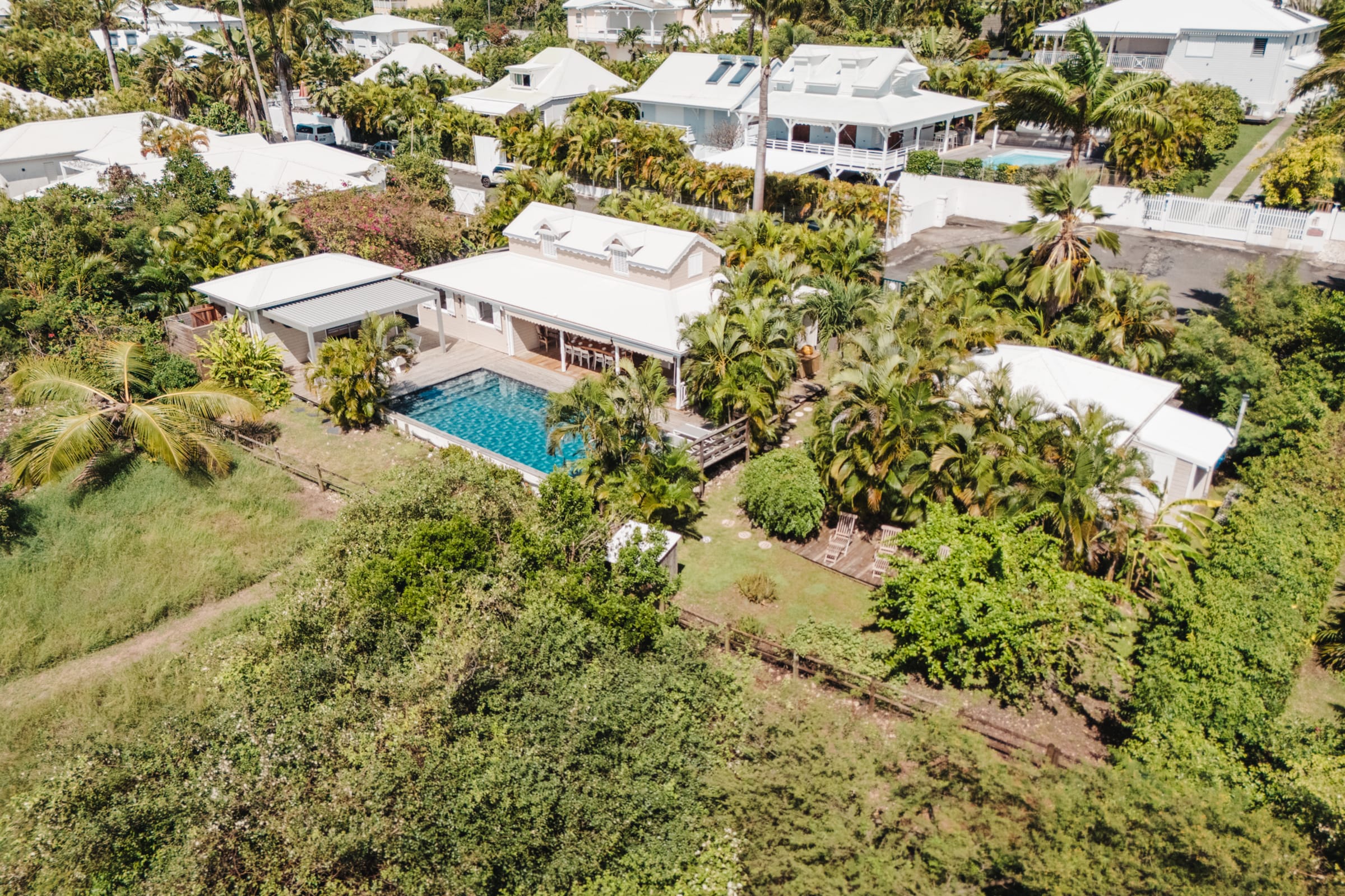 The villa features a private pool surrounded by sun loungers with views over the meadow and the sea. The flowering garden, shaded terraces, and hammocks under the **carbet** invite you to unwind. Just a short walk away: the beaches of , Gros Sable, and Bois Jolan.