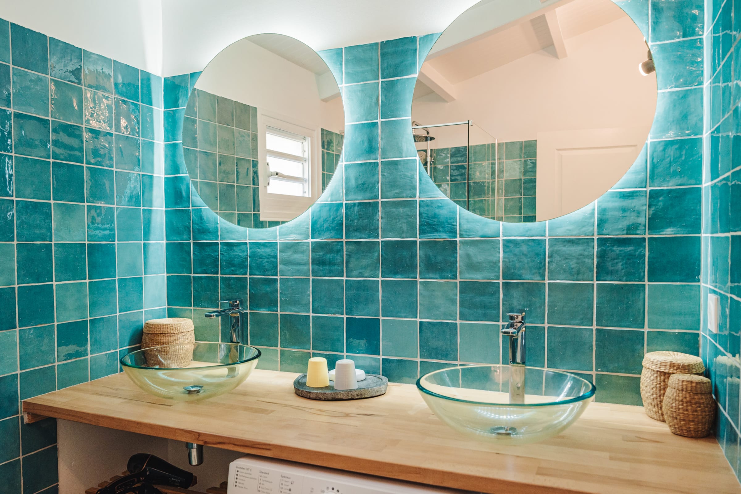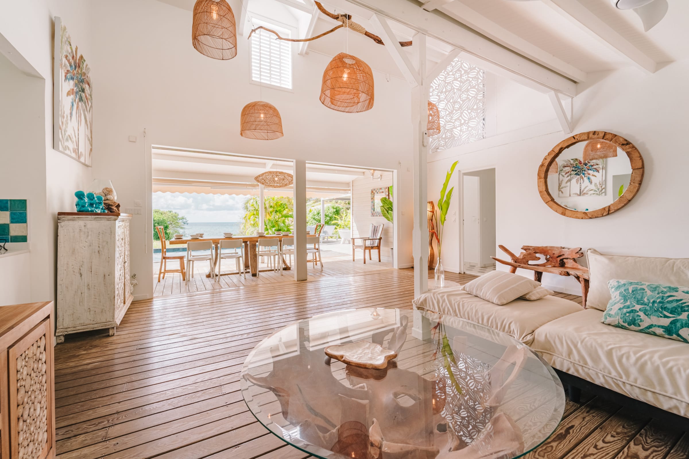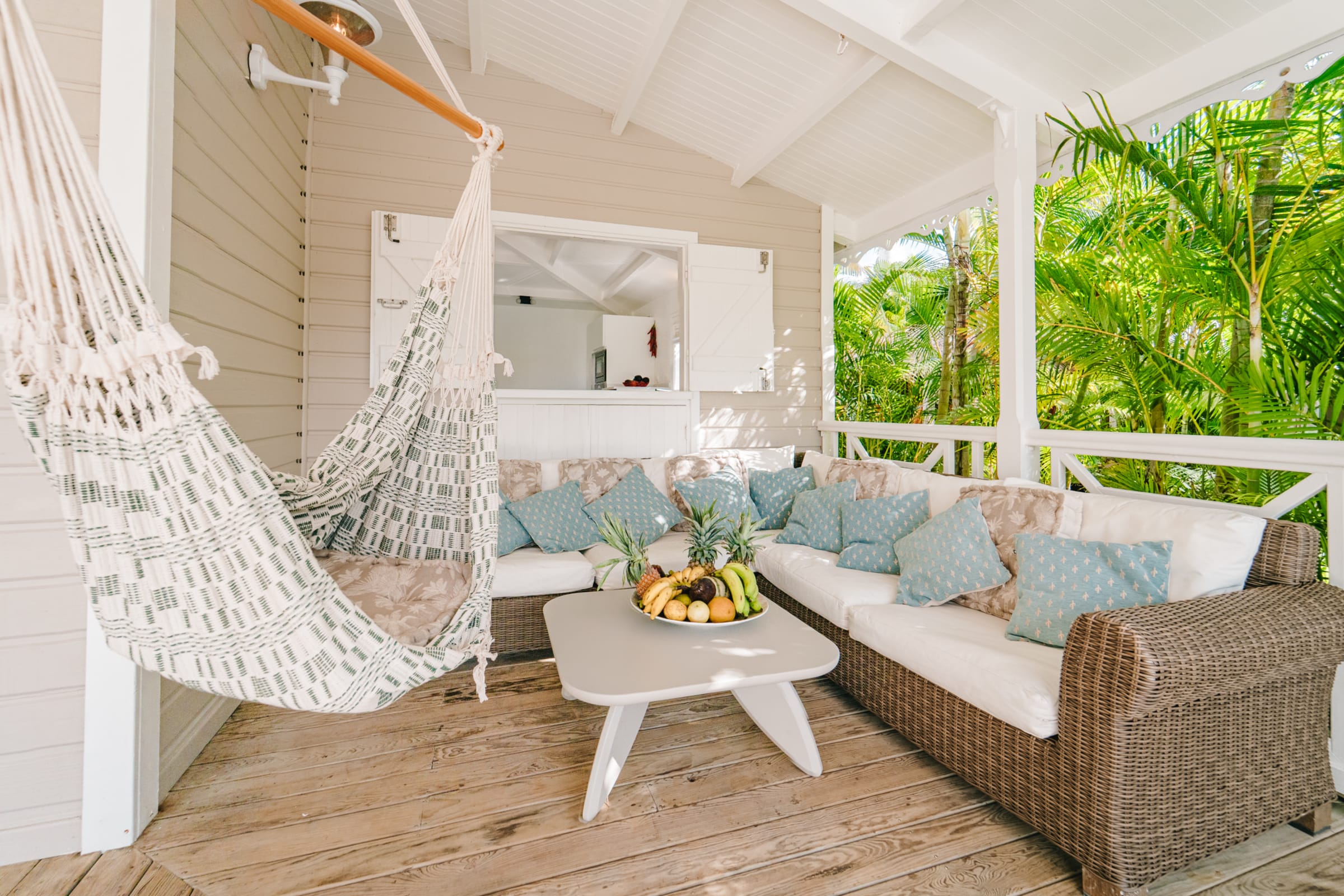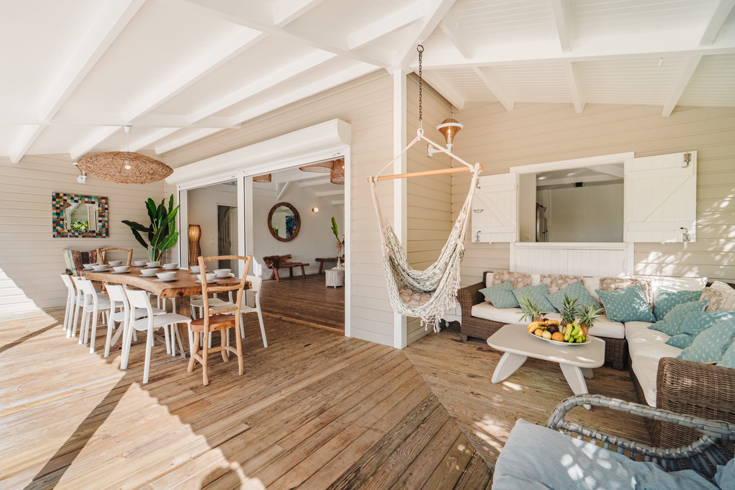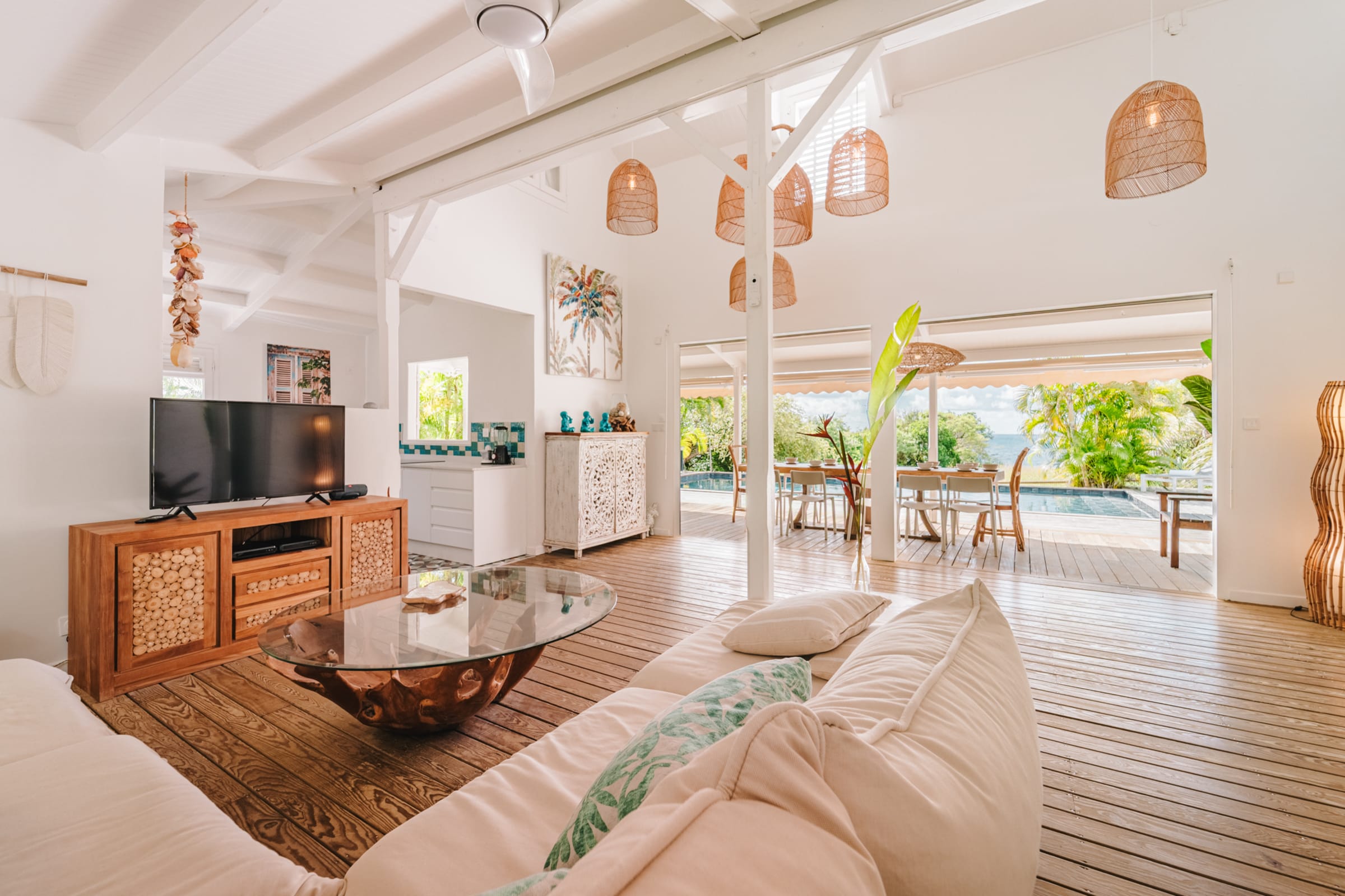 At the heart of the villa, the main living room with sofa and TV opens onto a sea-view terrace. The fully equipped kitchen is perfect for preparing meals in a friendly atmosphere. Several cozy spaces invite relaxation: a lounge under the terrace, a second lounge for sunset drinks, and a **carbet** with hammocks. A laundry area with washing machine, iron, and linens is available.
