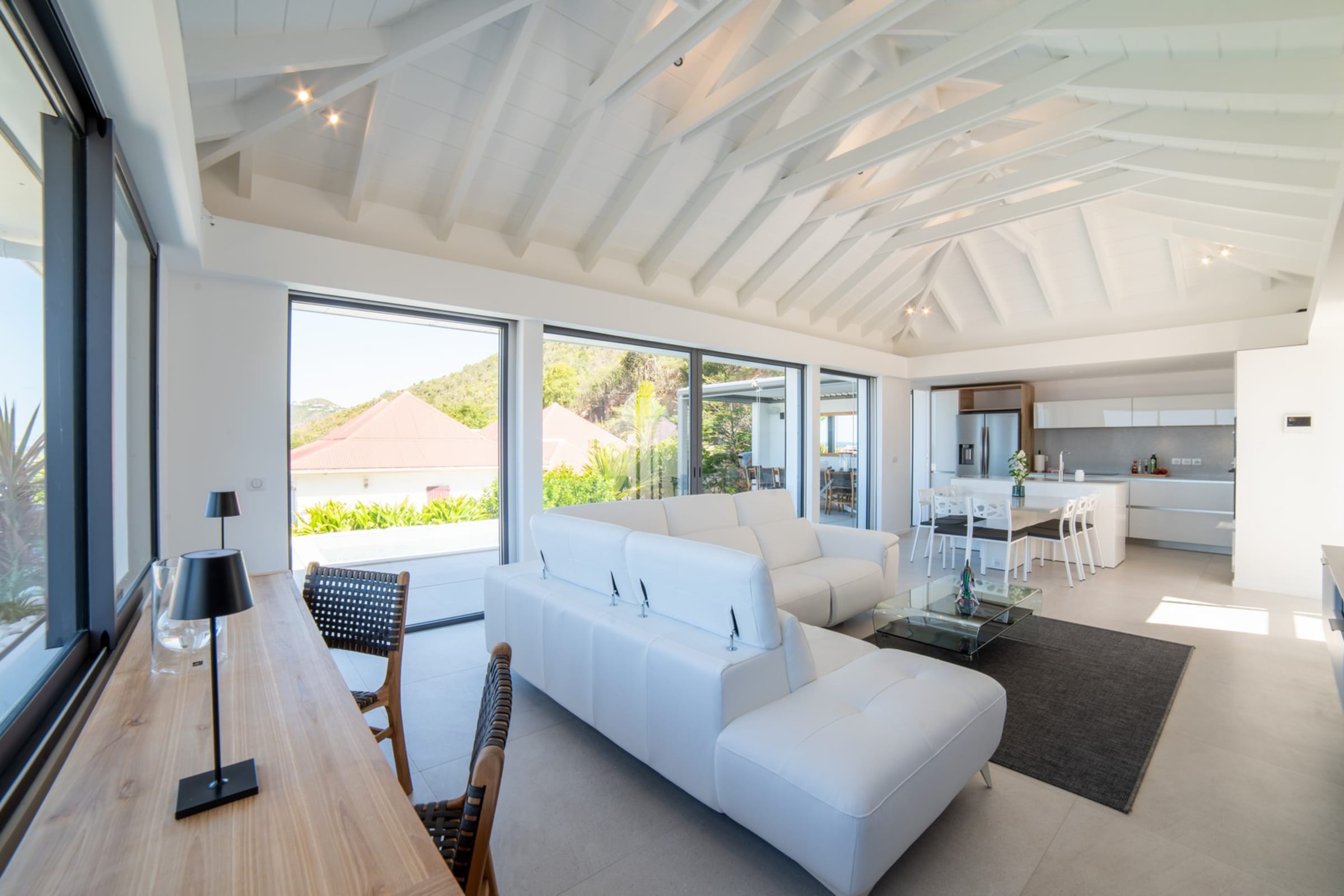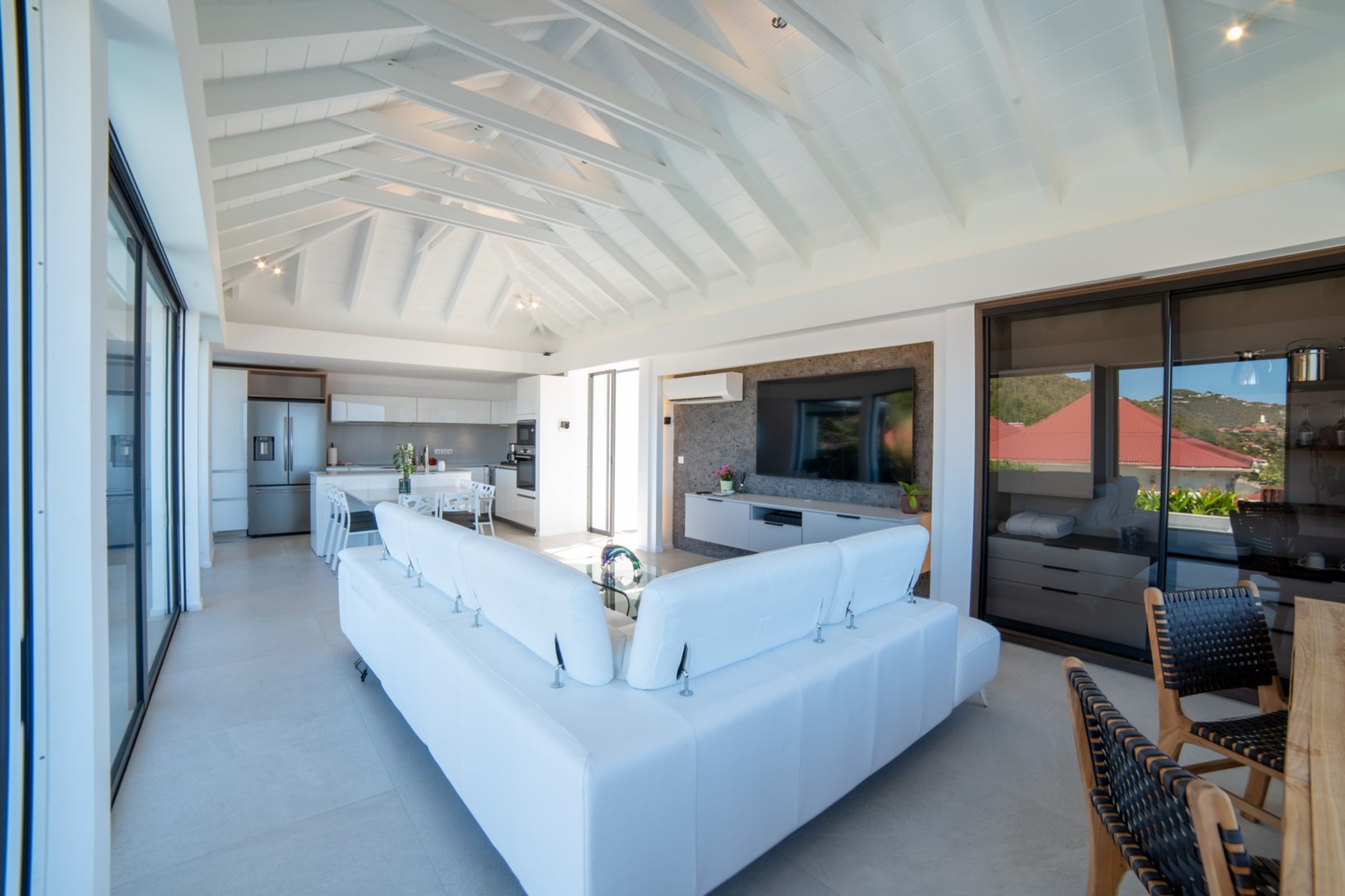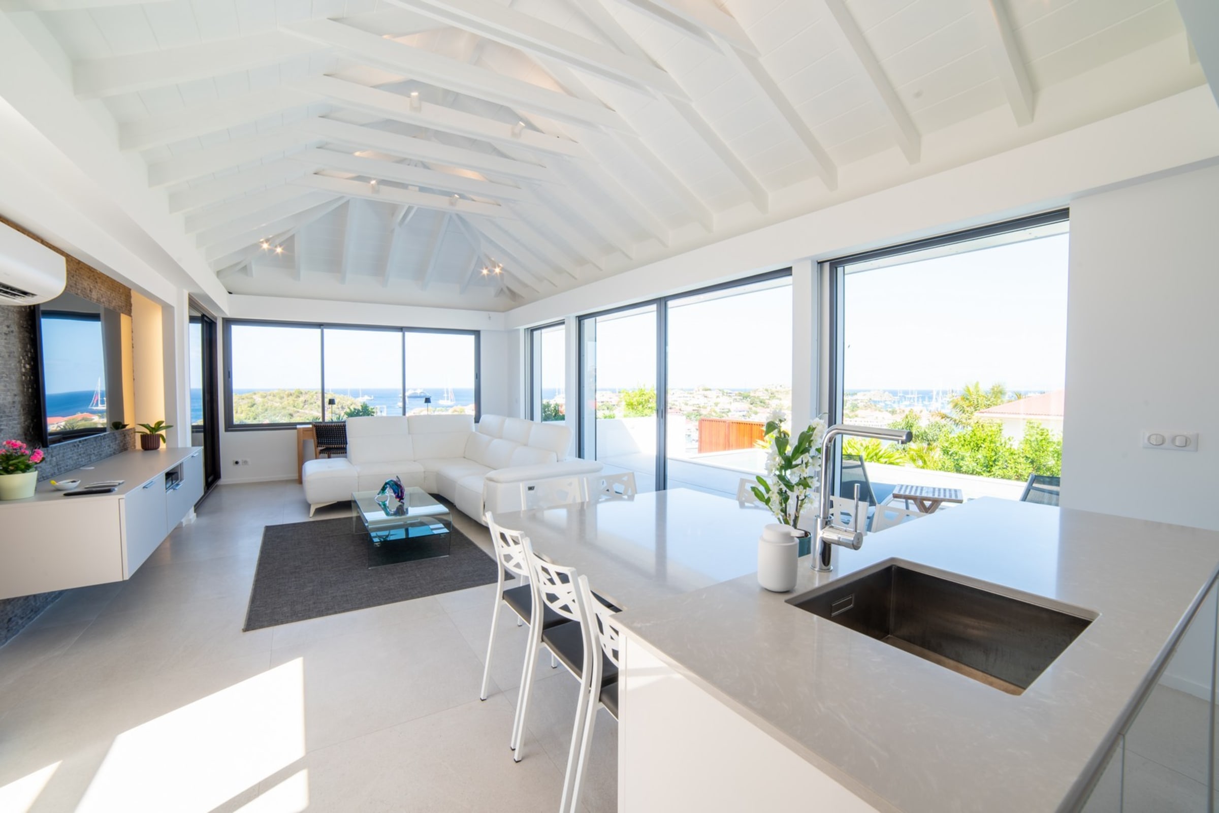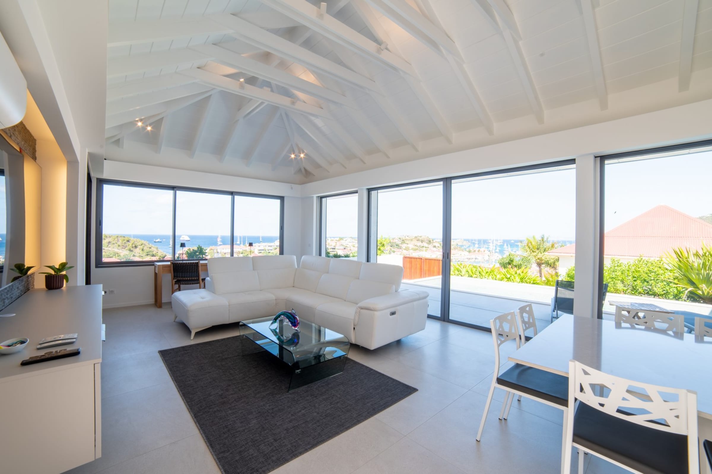 The air-conditioned living room features large glass doors that flood the space with natural light, highlighting the spacious sofa and HD television. Beneath the high, pristine ceiling, the atmosphere is calm and relaxing, with soothing views of Gustavia and the azure ocean beyond. In the same open space, the modern, fully equipped kitchen includes a cozy dining area—perfect for sharing meals with family or friends.