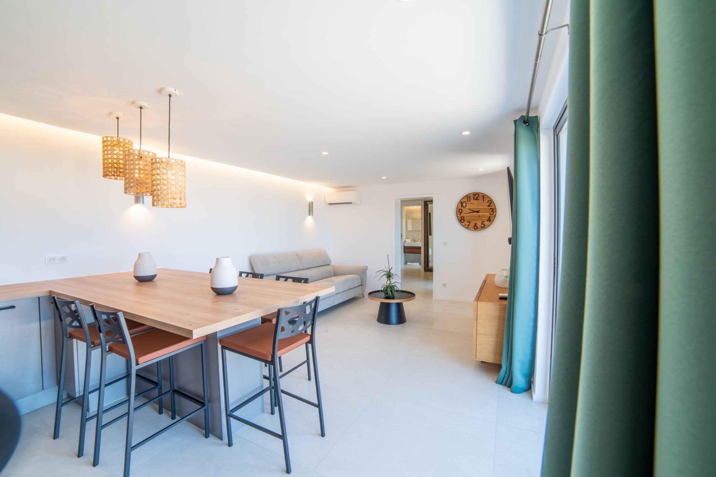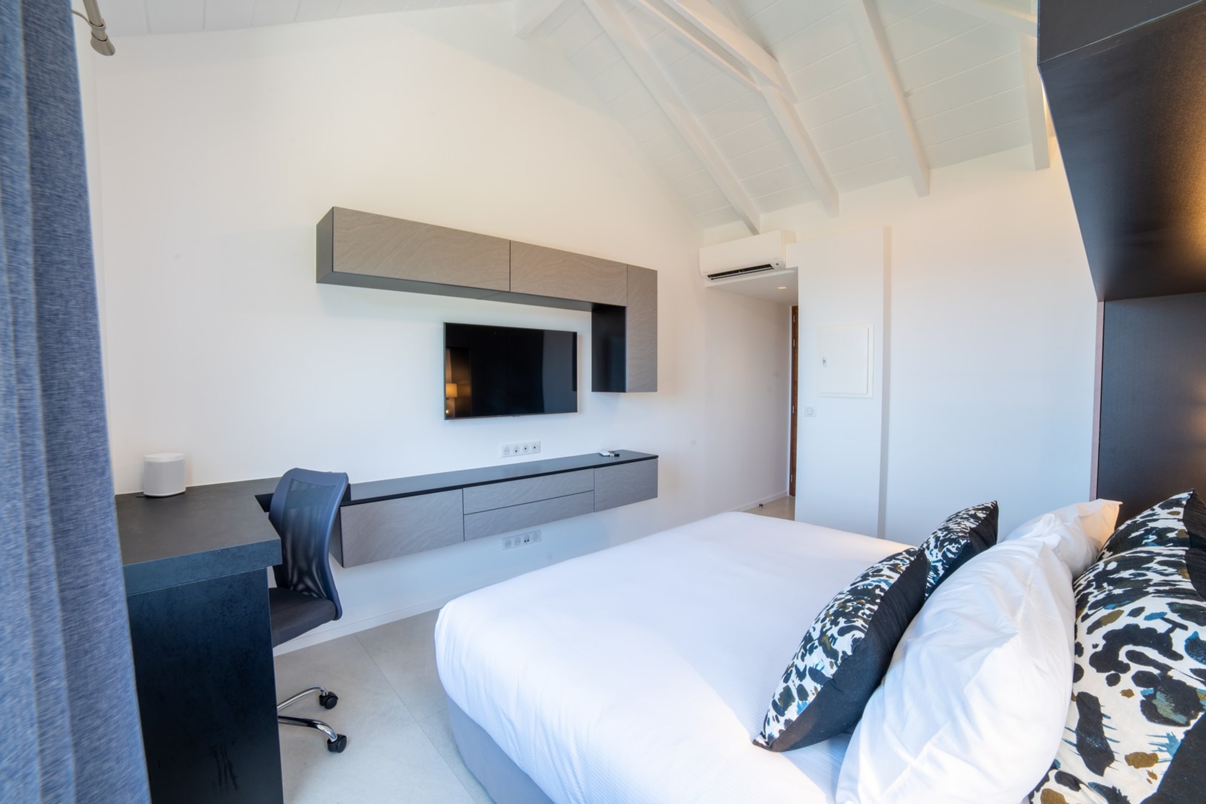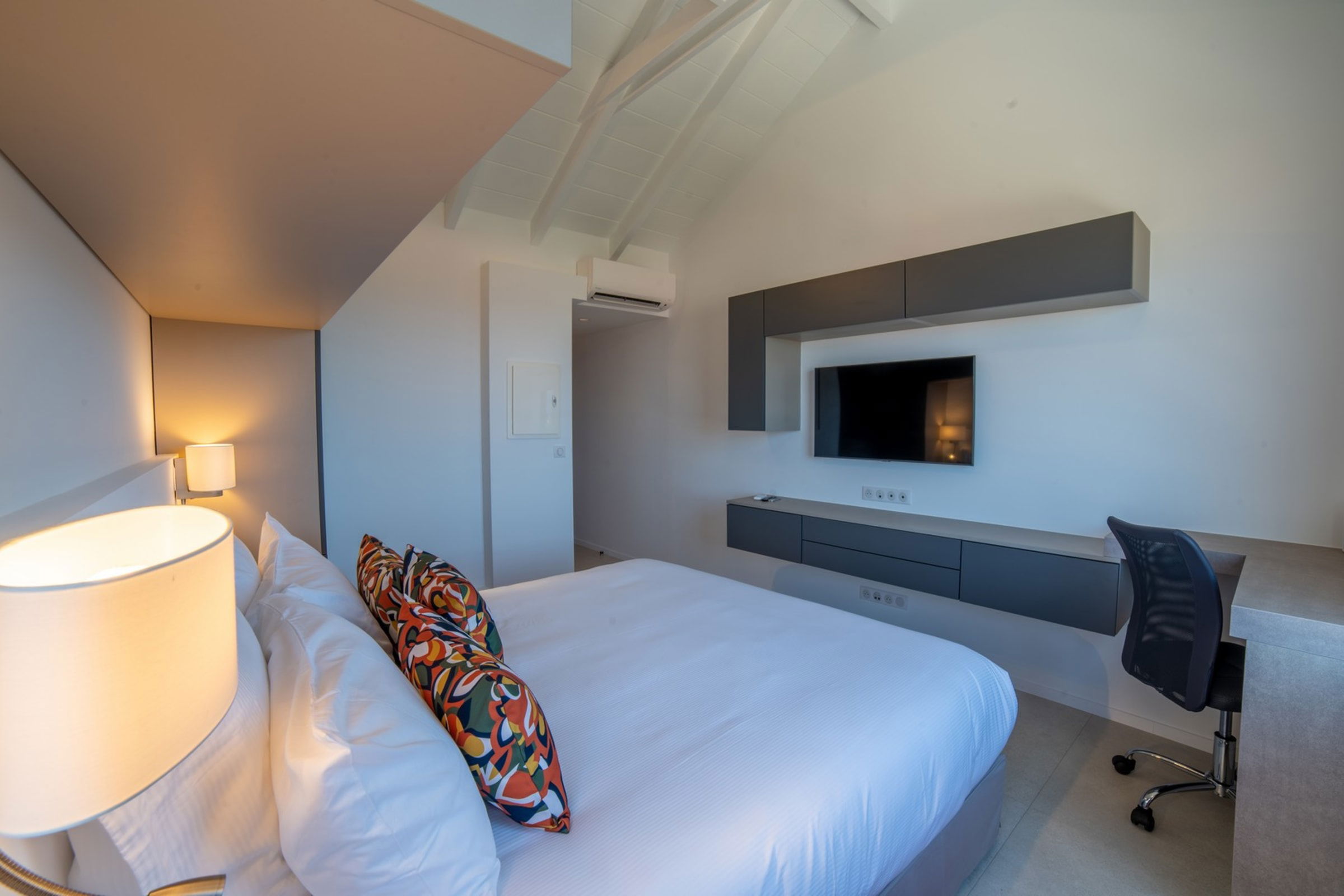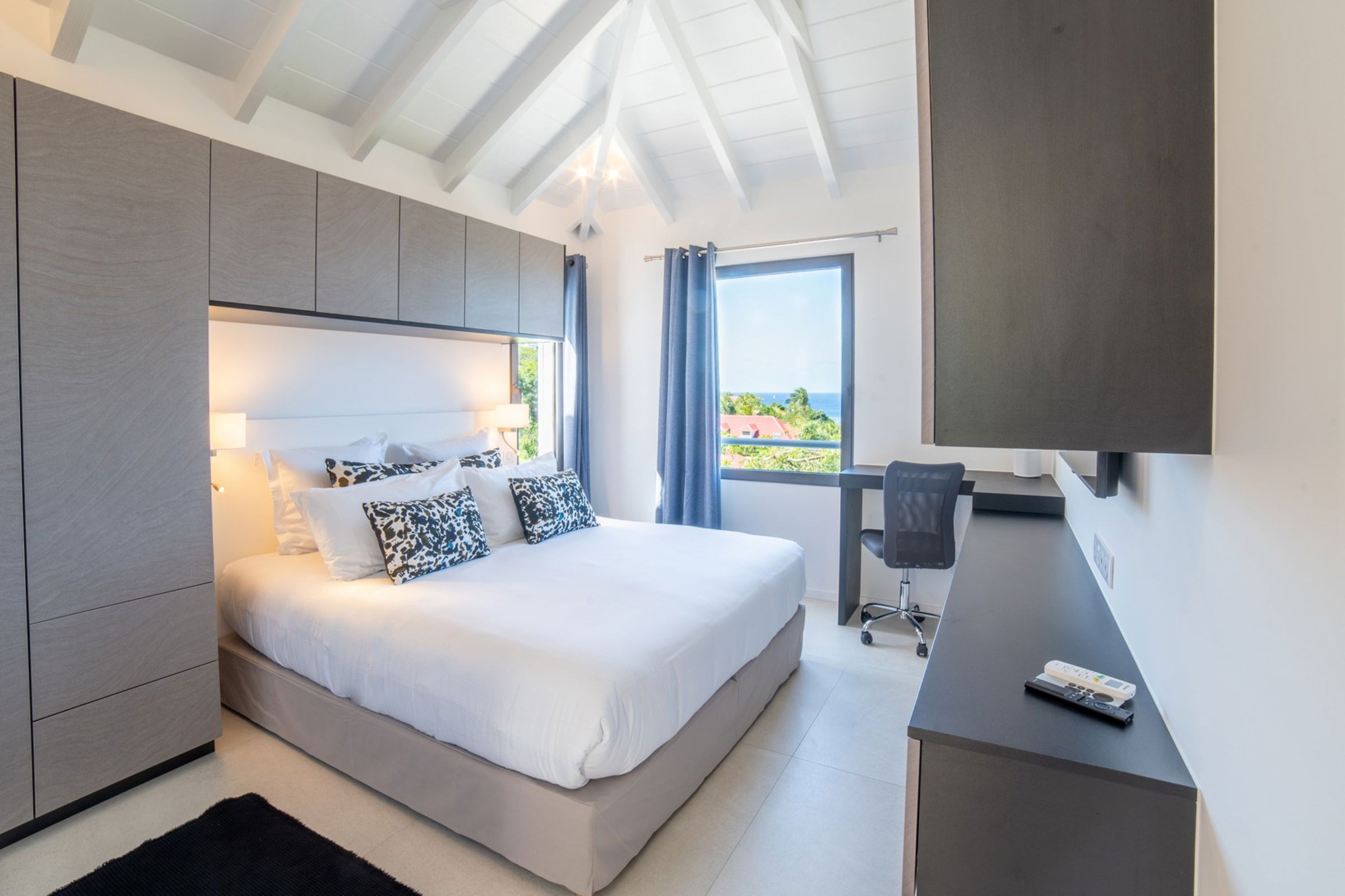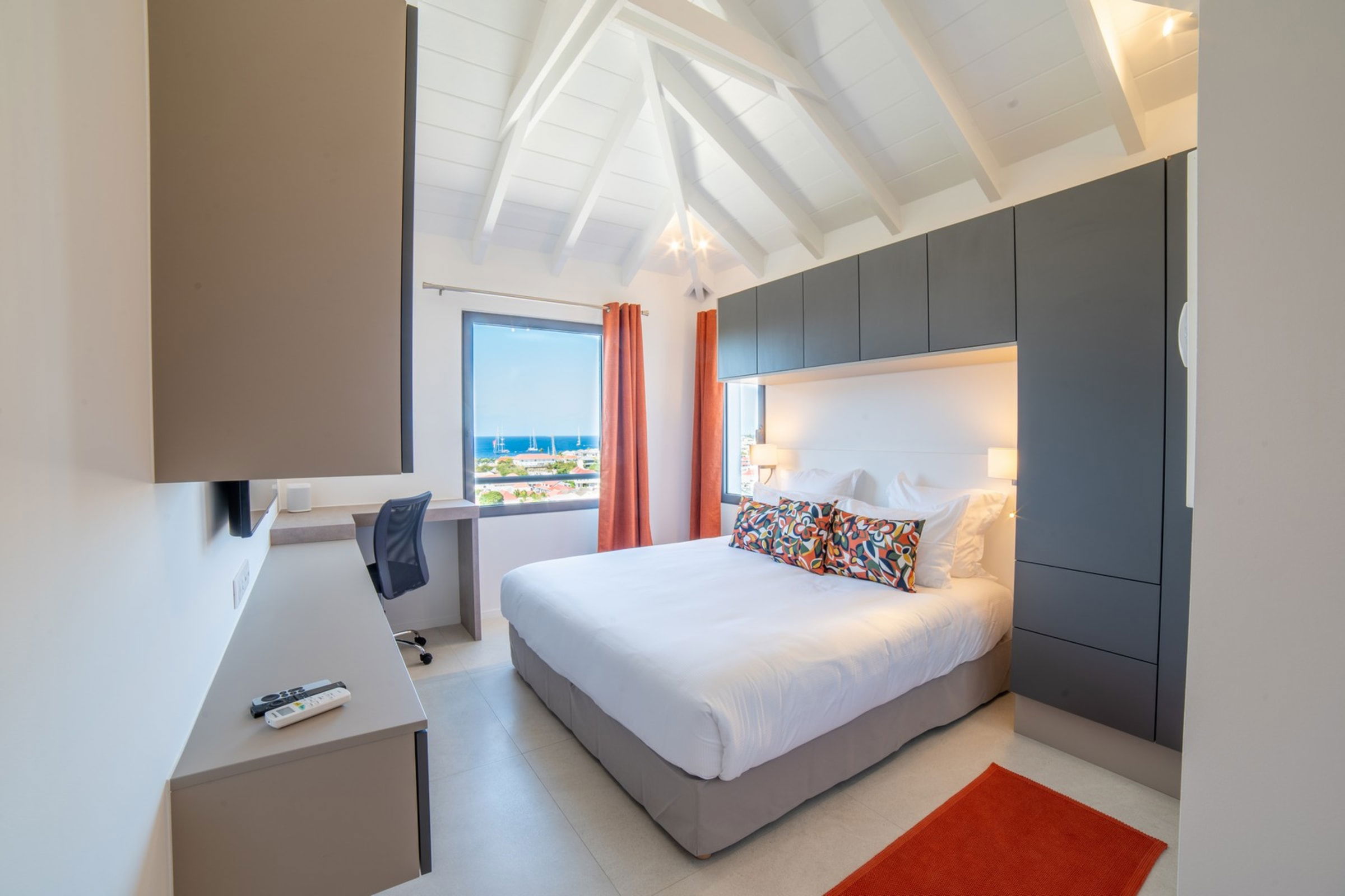 The air-conditioned living room features large glass doors that flood the space with natural light, highlighting the spacious sofa and HD television. Beneath the high, pristine ceiling, the atmosphere is calm and relaxing, with soothing views of Gustavia and the azure ocean beyond. In the same open space, the modern, fully equipped kitchen includes a cozy dining area—perfect for sharing meals with family or friends.