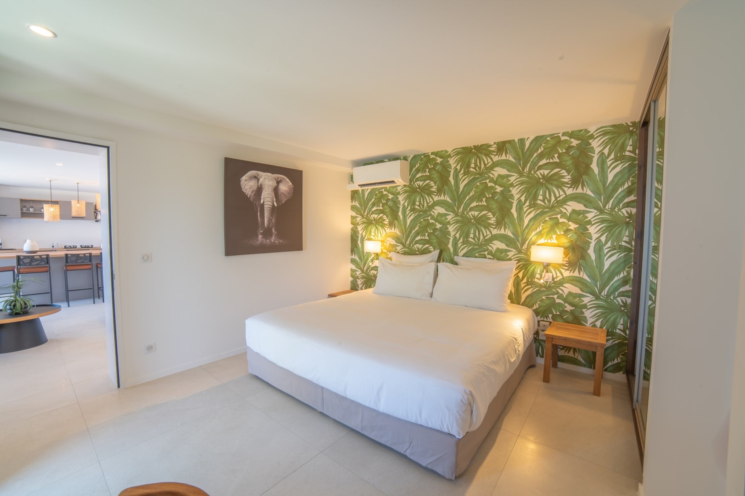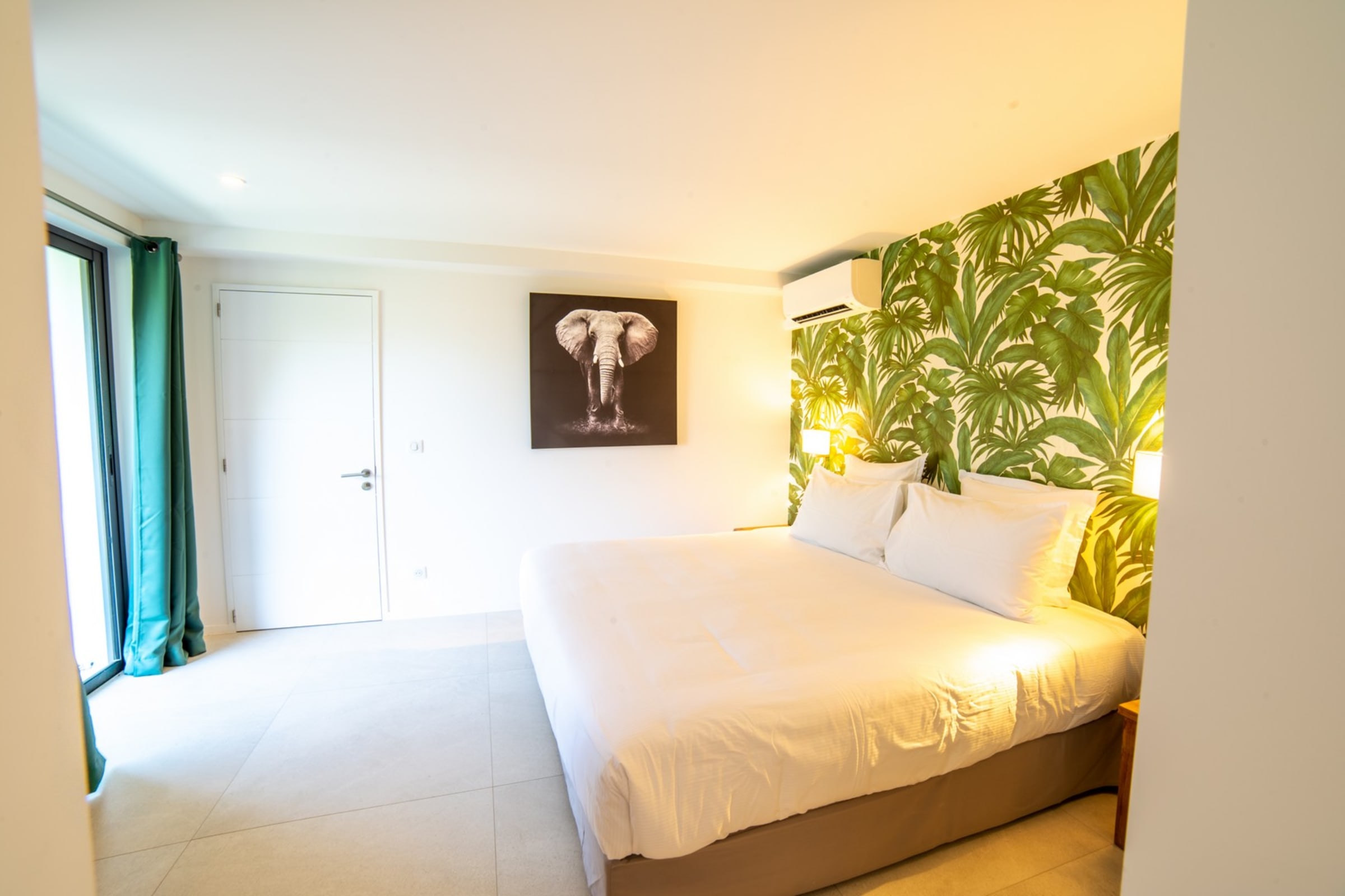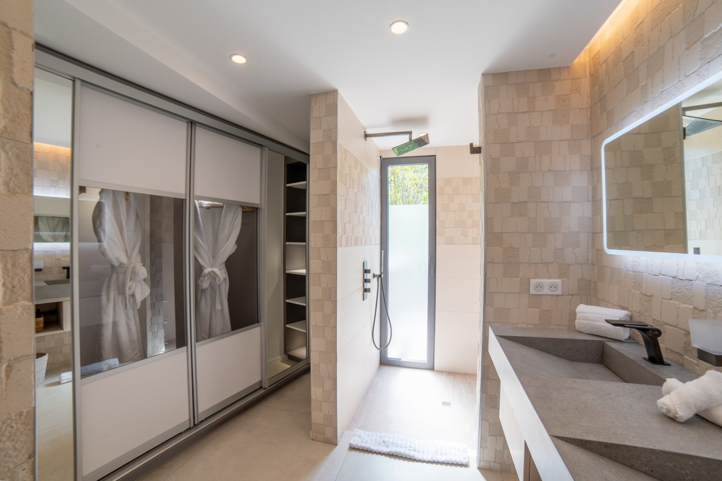 To reach the three main bedrooms, simply cross a charming outdoor patio. These rooms are modern, each equipped with a television. The master suite features a spacious walk-in closet and a private terrace overlooking the garden. On the lower level, you’ll find a fully independent fourth bedroom—more of a self-contained studio—with its own equipped kitchen and lounge area, opening directly onto the garden and offering ultimate privacy and comfort.