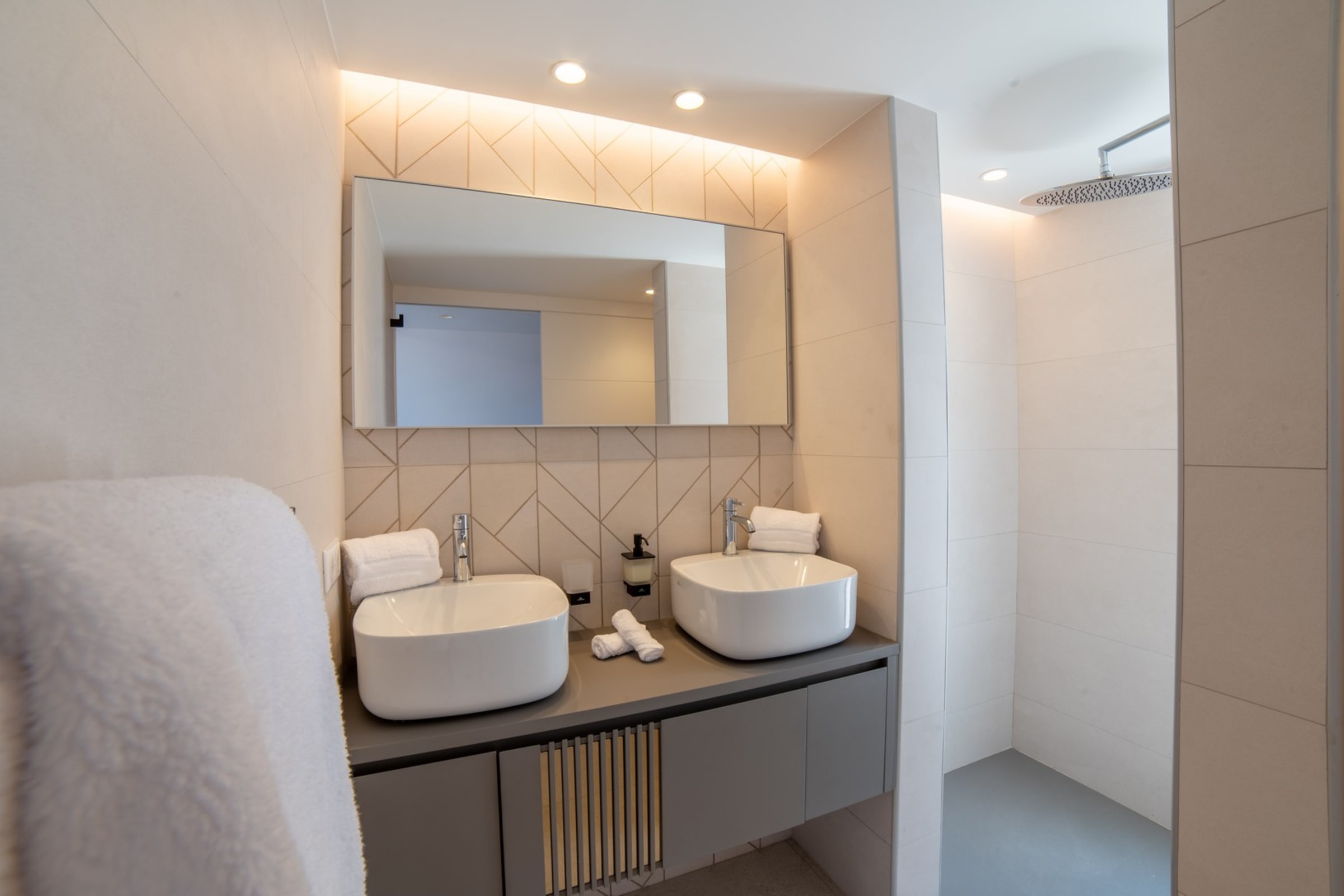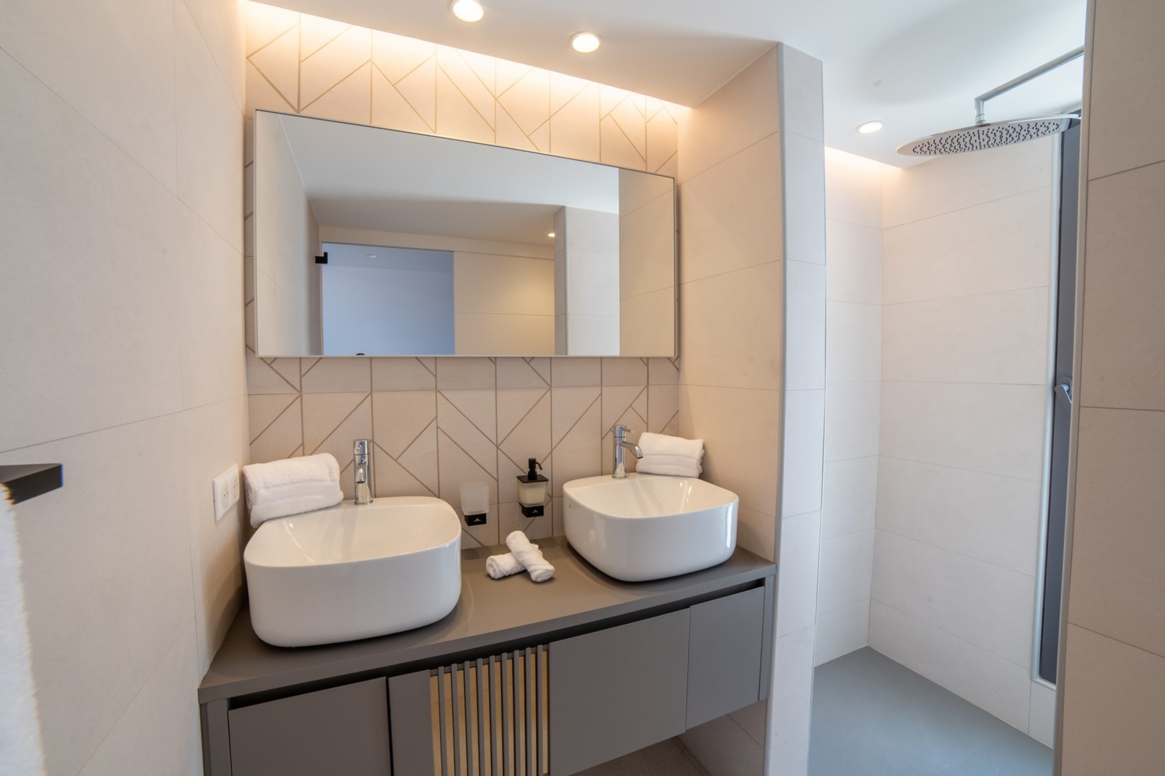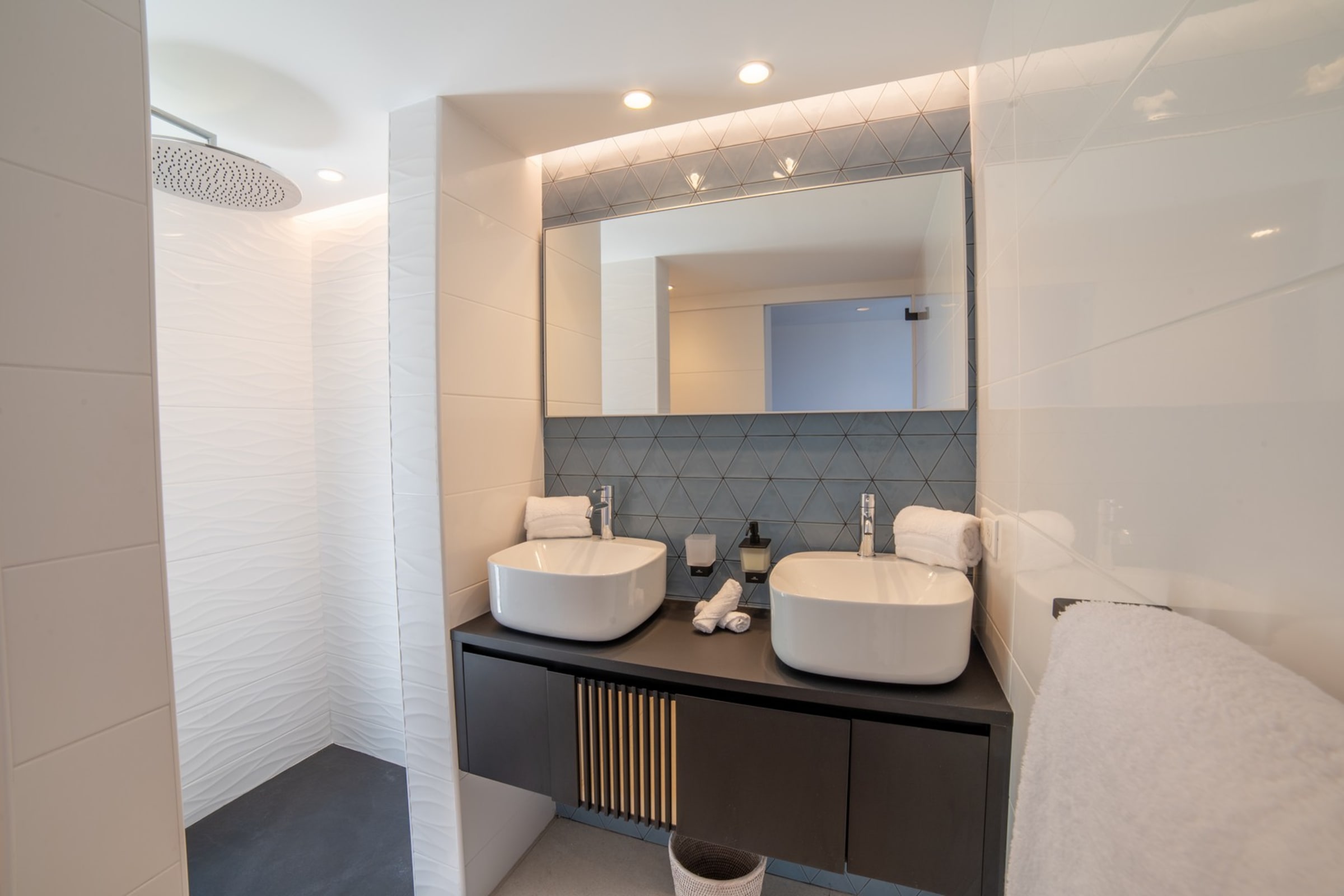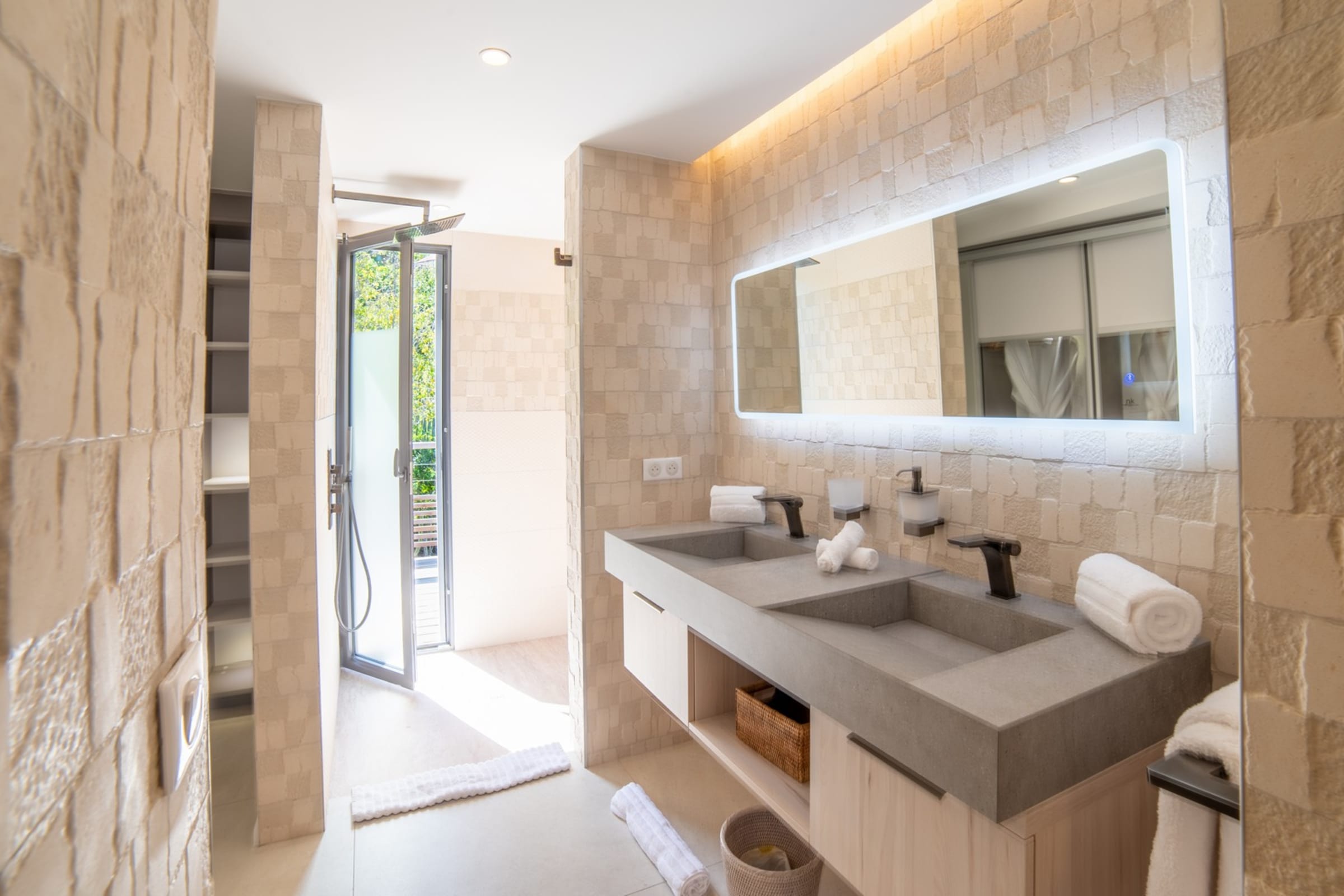 To reach the three main bedrooms, simply cross a charming outdoor patio. These rooms are modern, each equipped with a television. The master suite features a spacious walk-in closet and a private terrace overlooking the garden. On the lower level, you’ll find a fully independent fourth bedroom—more of a self-contained studio—with its own equipped kitchen and lounge area, opening directly onto the garden and offering ultimate privacy and comfort.