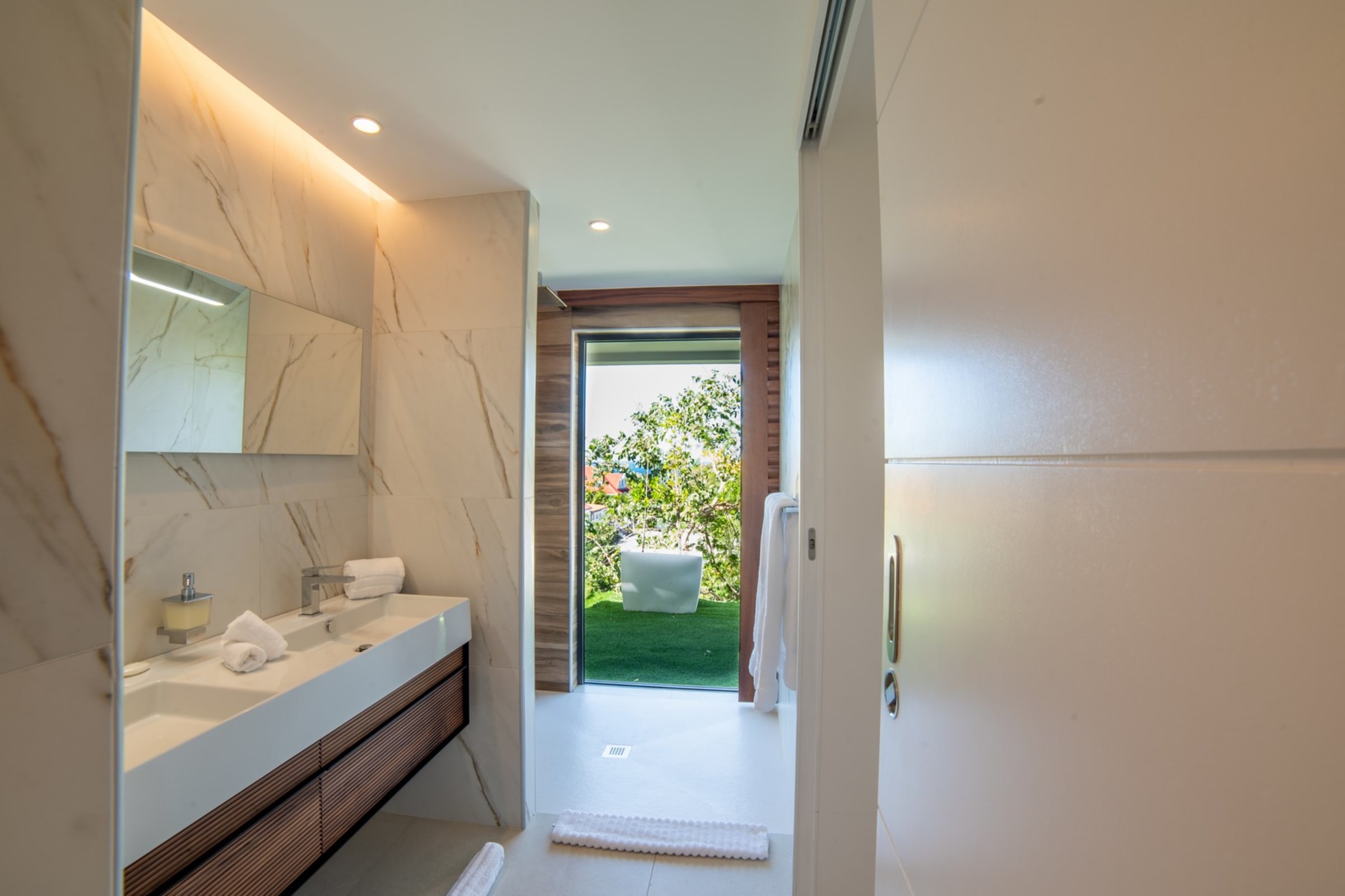 At the front of the villa, the terrace is centered around a long swimming pool with unobstructed views of the hills and the horizon. The large deck is furnished with sun loungers, ideal for sunbathing or relaxing with a book. For al fresco dining, a stylish outdoor dining area for up to ten guests awaits under the pergola at the far end of the pool.