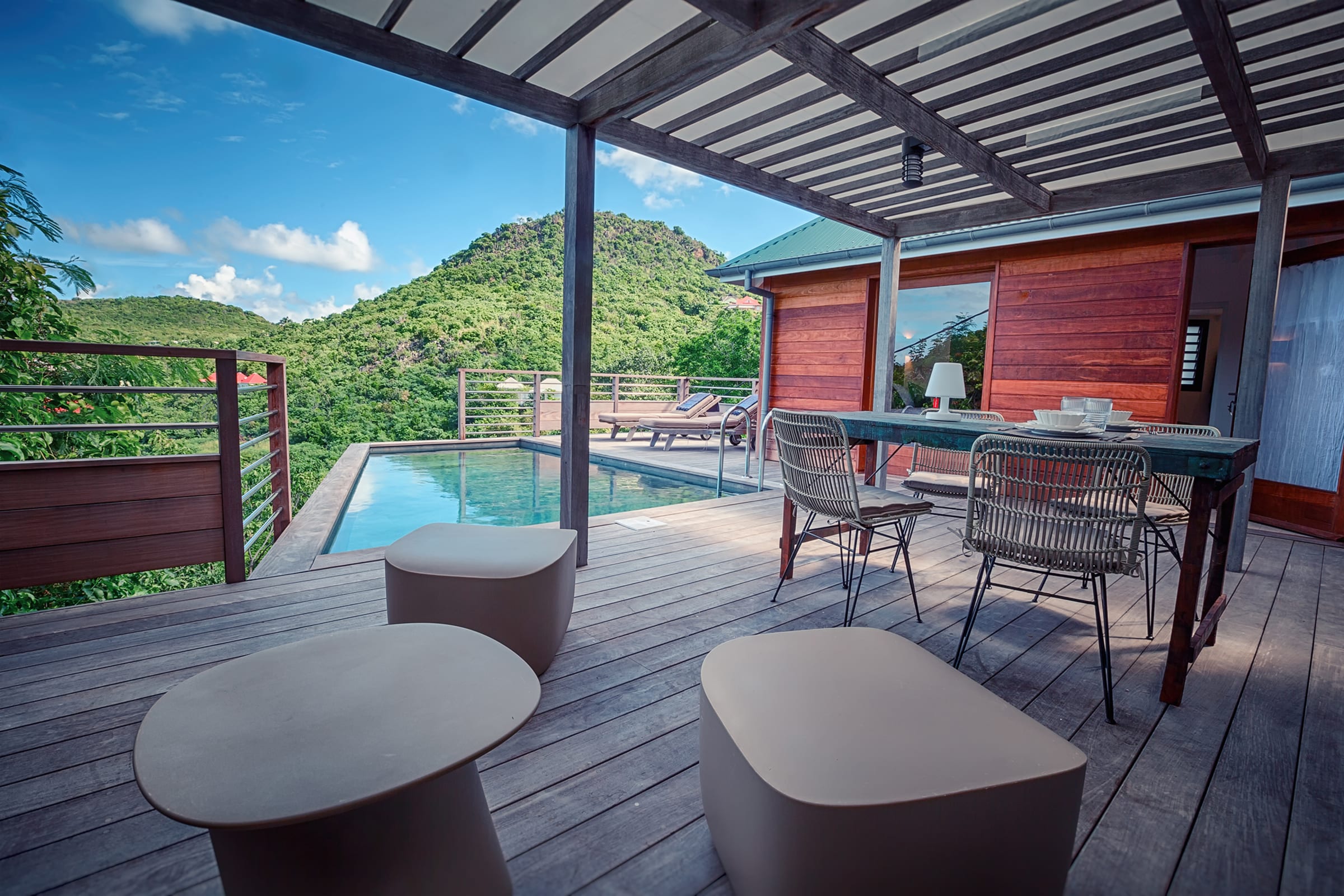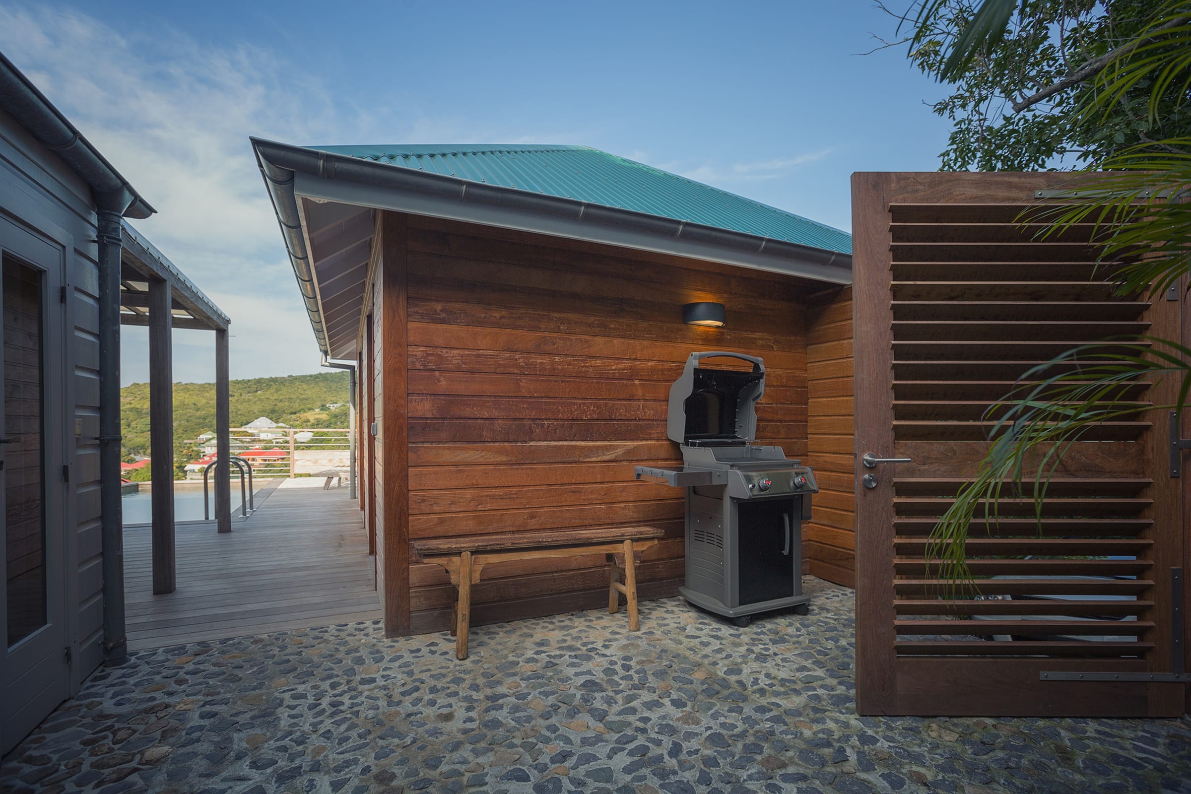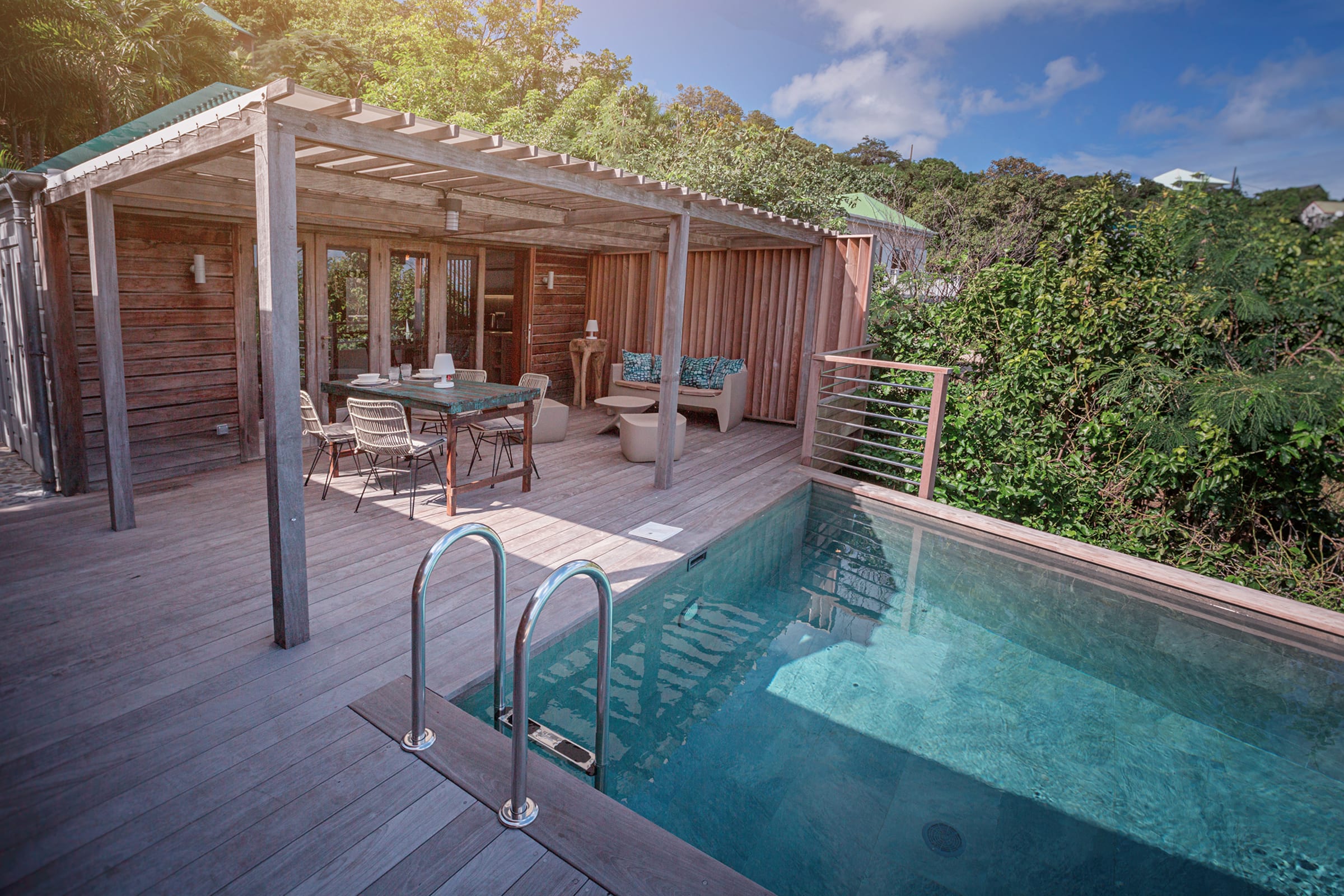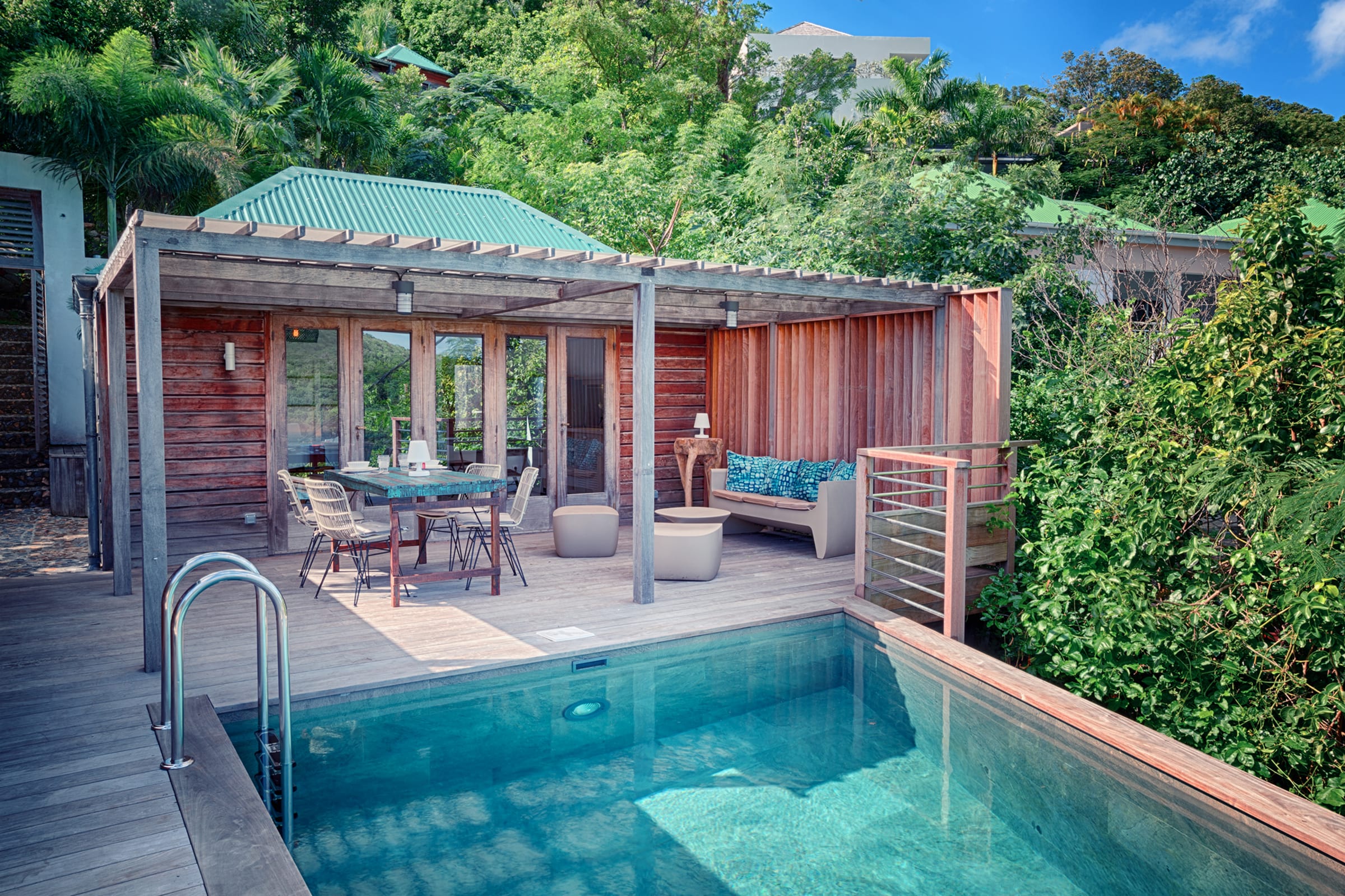 The outdoor terrace includes a lounge area, sunbeds, and a barbecue, all with a beautiful view of the Caribbean Sea. A small private pool nestled among the island’s lush vegetation adds the perfect touch of refreshment. The atmosphere is peaceful, private, and perfectly suited for a romantic escape.