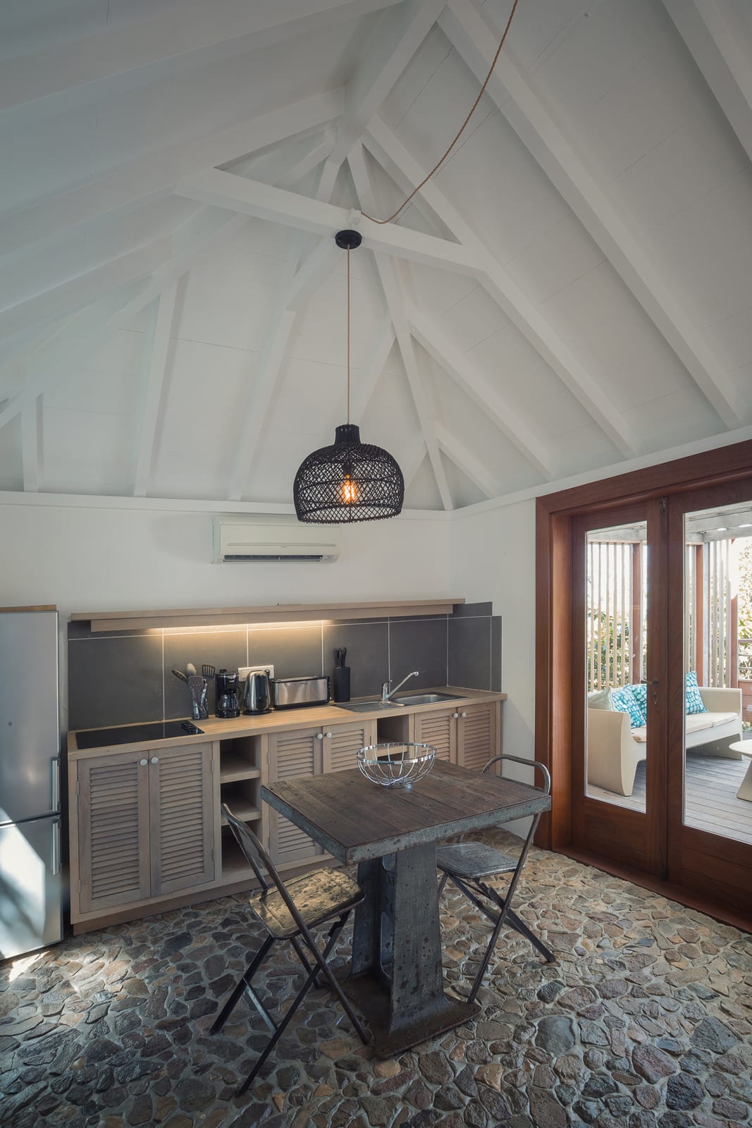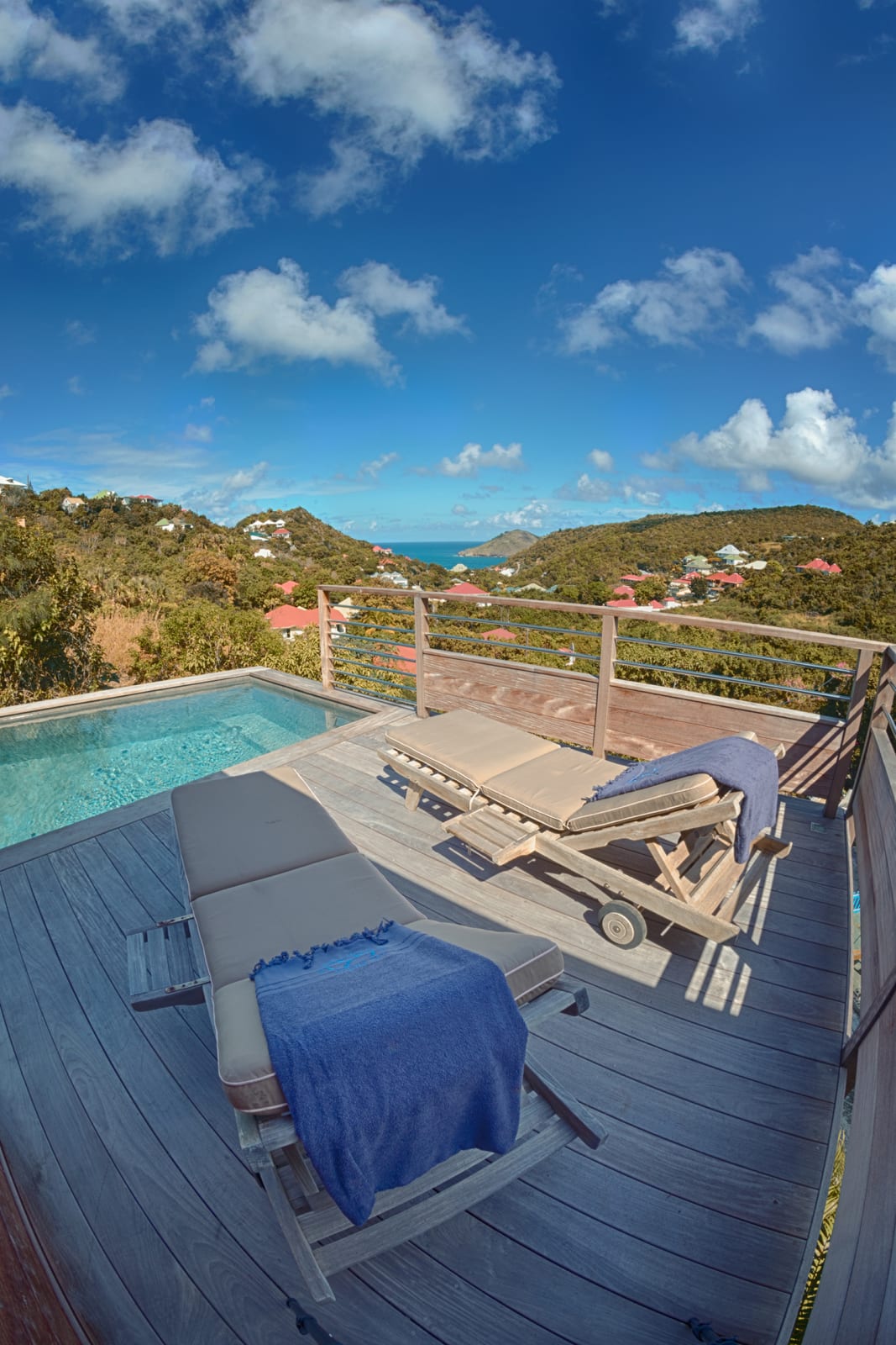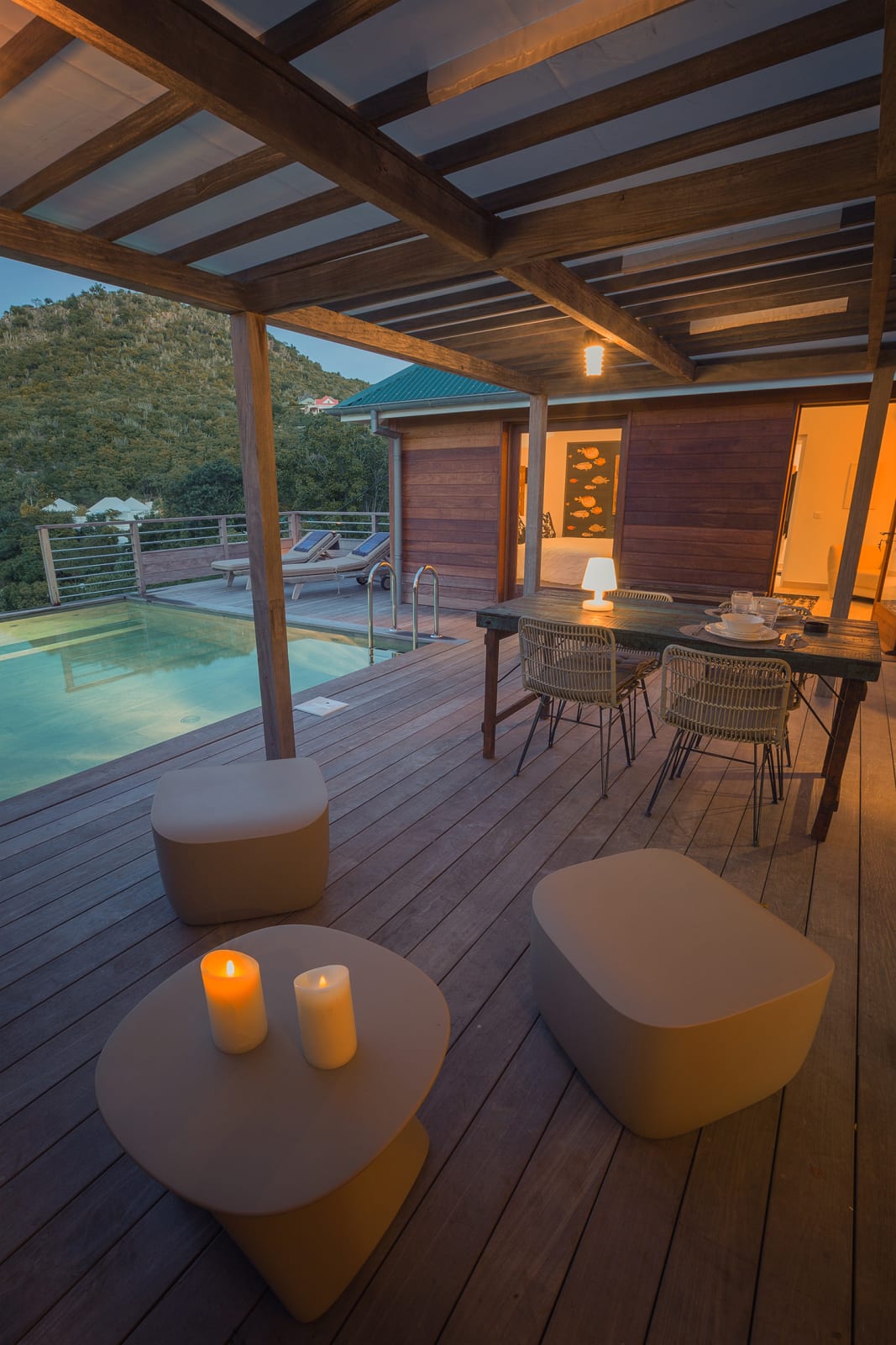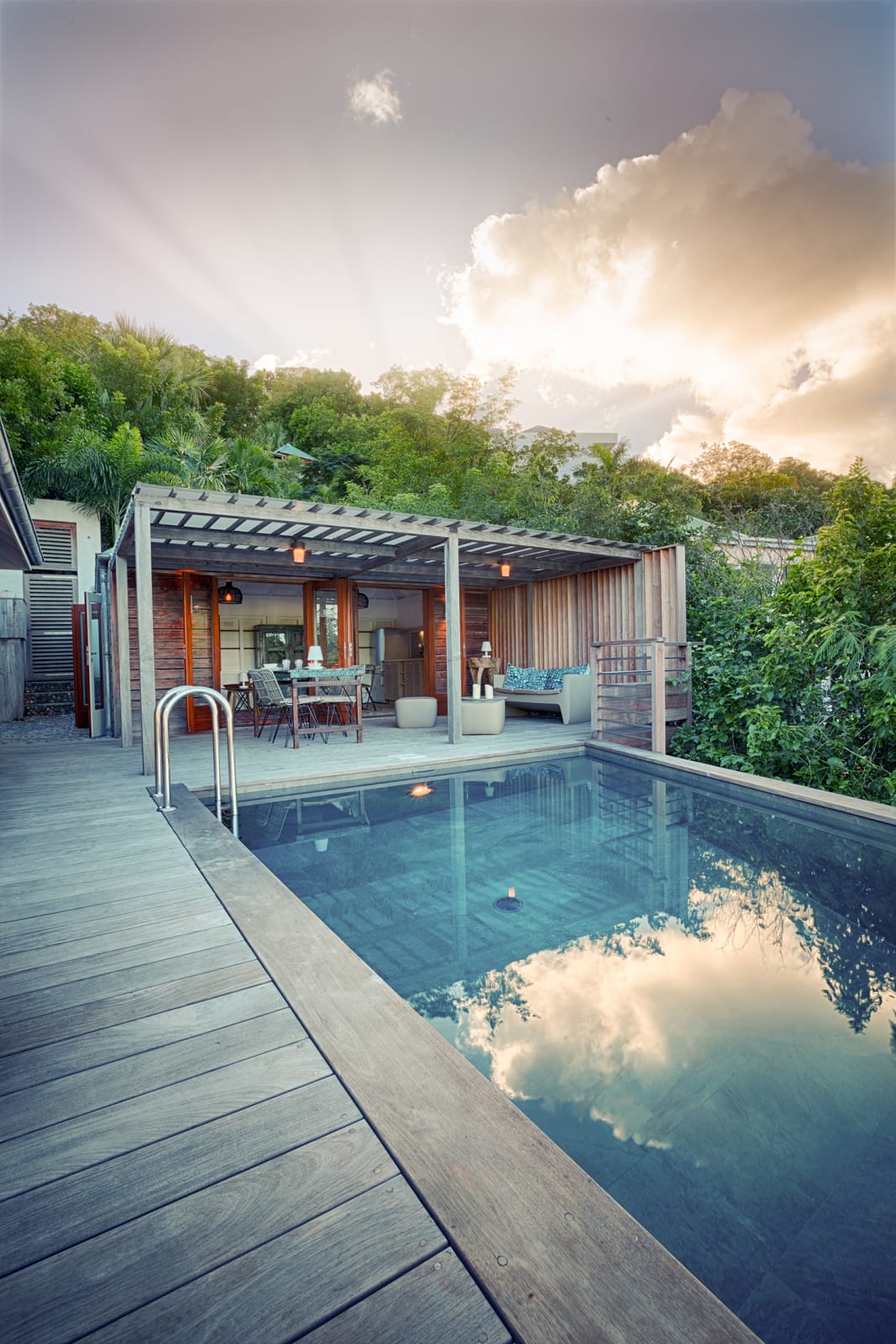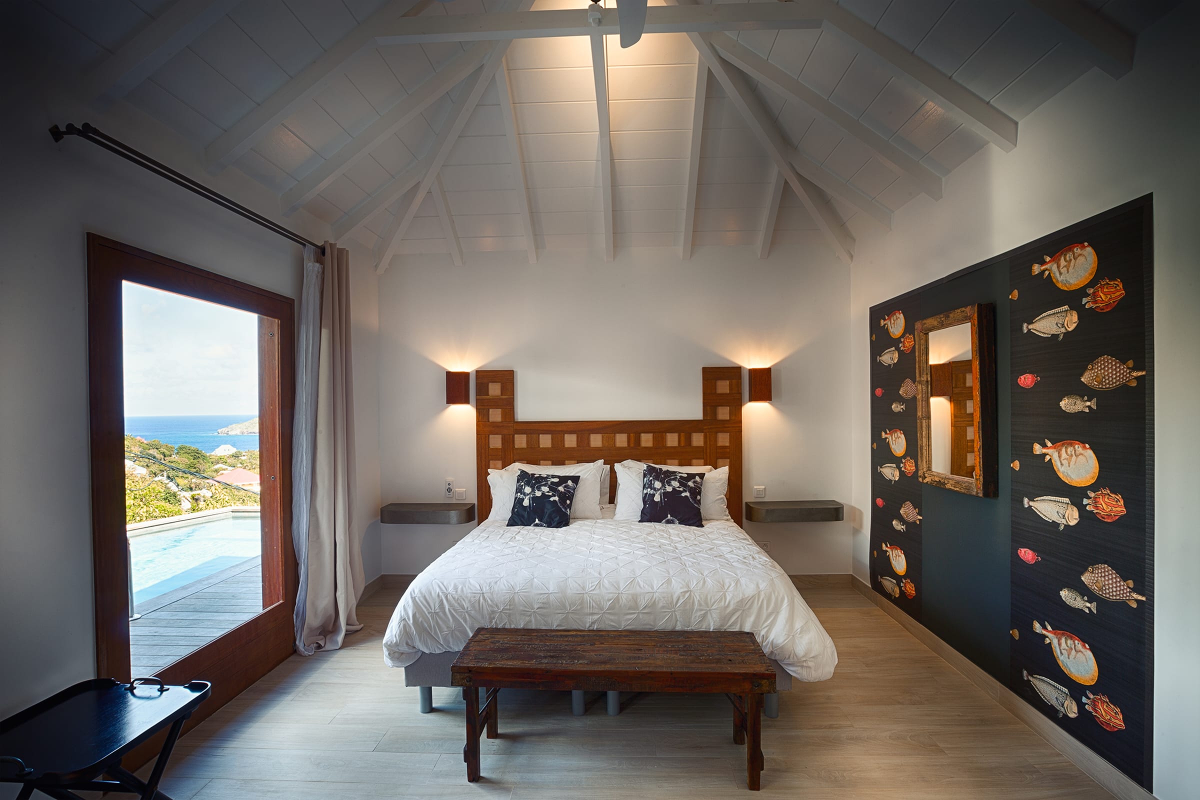 The outdoor terrace includes a lounge area, sunbeds, and a barbecue, all with a beautiful view of the Caribbean Sea. A small private pool nestled among the island’s lush vegetation adds the perfect touch of refreshment. The atmosphere is peaceful, private, and perfectly suited for a romantic escape.