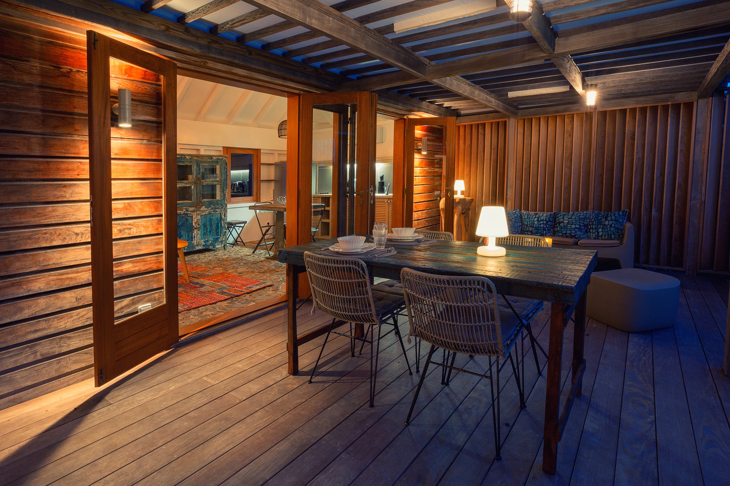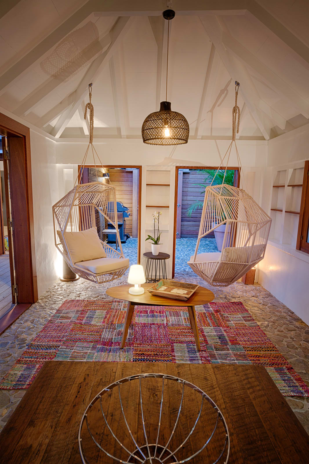 Set within a charming wooden bungalow, the air-conditioned living room features two hanging chairs—perfect for relaxing in comfort. The kitchen is practical and well-equipped (oven, stove, microwave), combining functionality with character. The space opens onto a covered terrace with an outdoor dining area, ideal for enjoying a meal with a view of the sea.