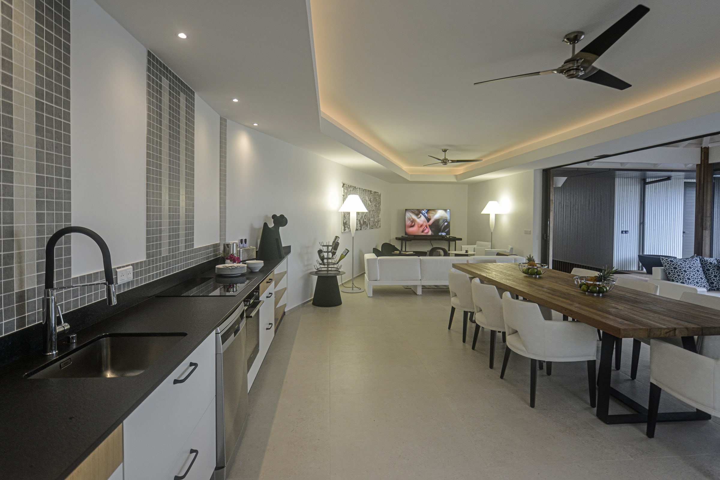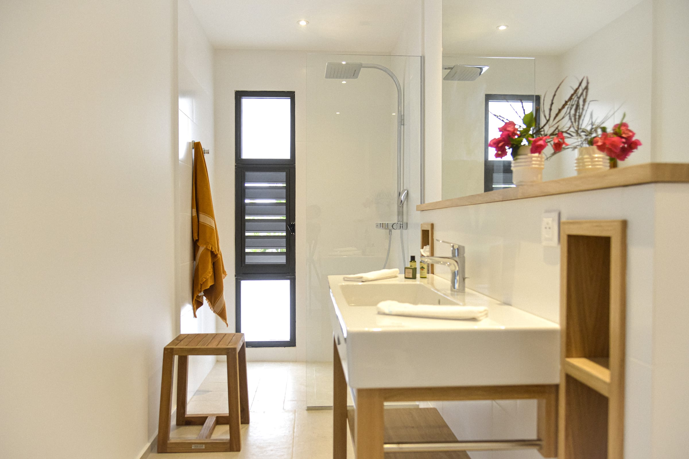 The fully equipped kitchen opens onto a beautiful solid wood dining table for 8 guests. Just beyond, the TV lounge features comfortable sofas and armchairs, a flat-screen TV, and a ceiling fan. Thanks to its large openings, the living spaces are filled with natural light and offer stunning sea views.