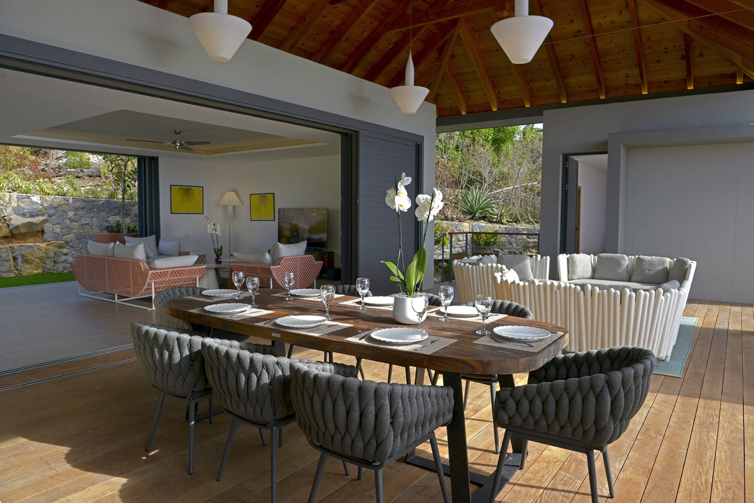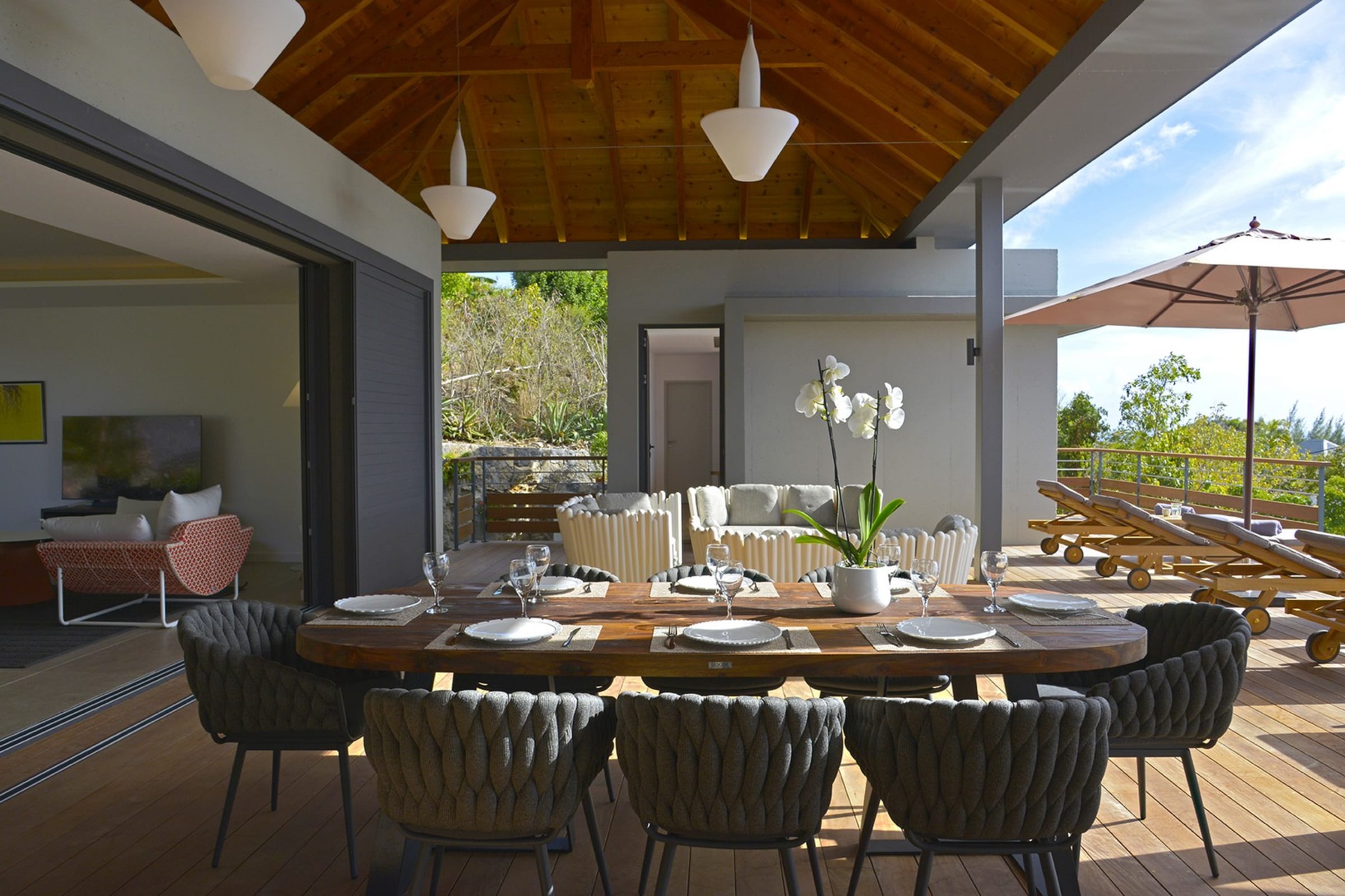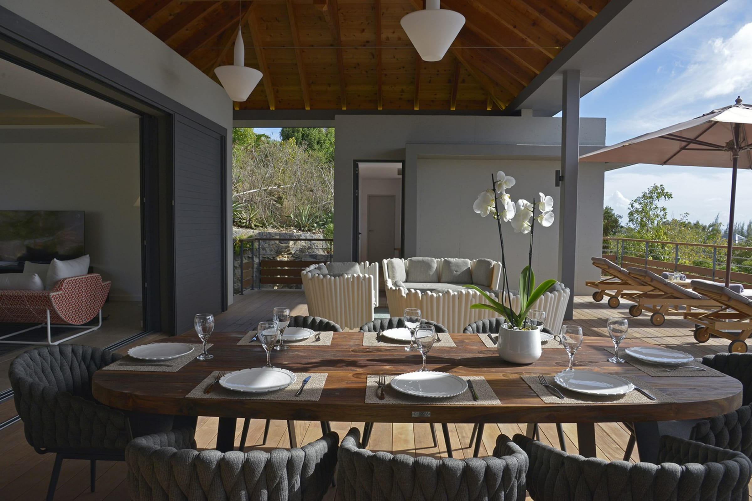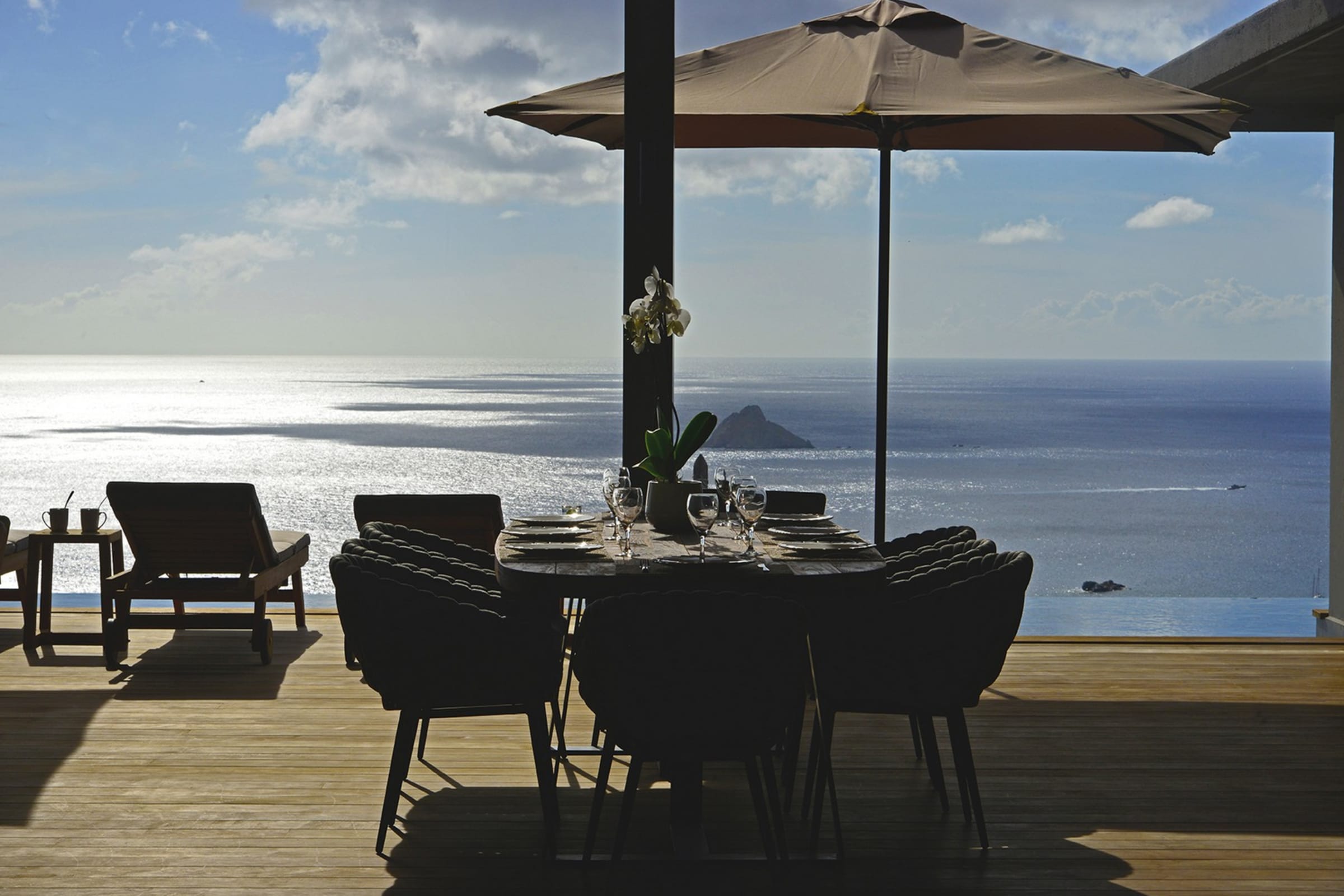 The main terrace offers an impressive 12.5-meter heated infinity pool stretching toward the horizon. With a shaded dining area, outdoor lounge, and sun loungers overlooking the sea, it’s the perfect place to soak up the island’s calm or watch the sunset paint the sky. Garden and lounge area at the back of the property, with a gas barbecue is available for a refreshing moment surrounded by lush tropical greenery.