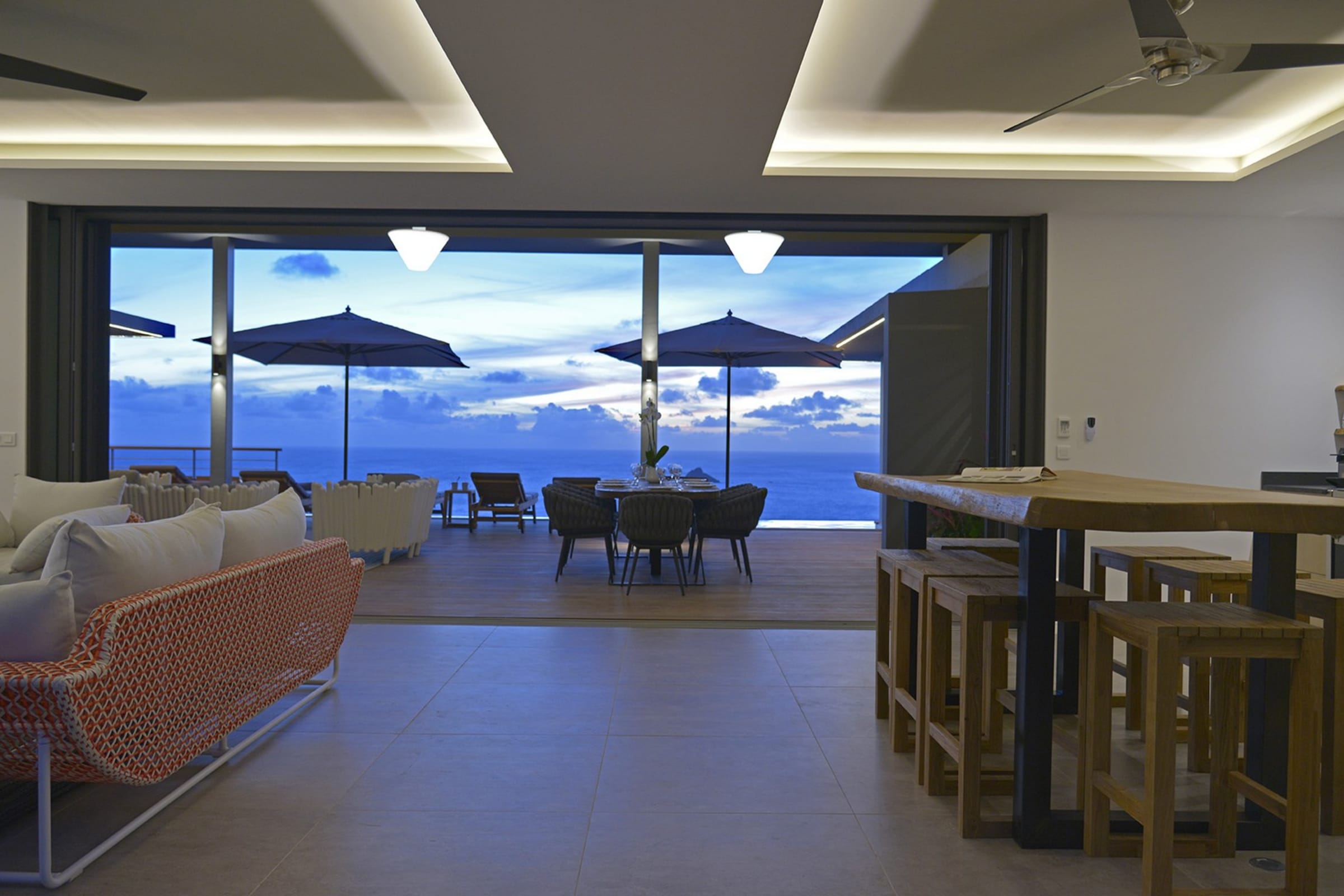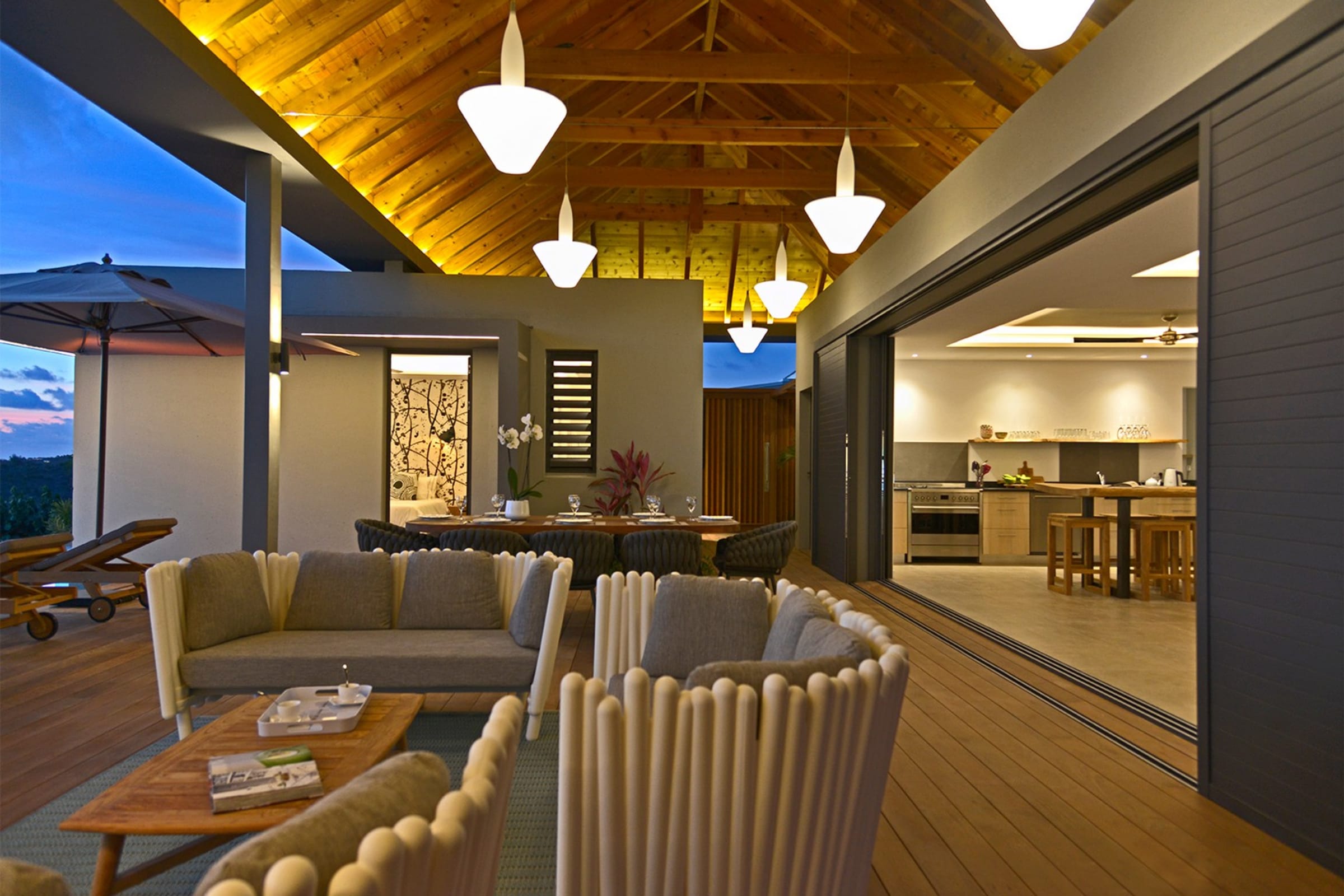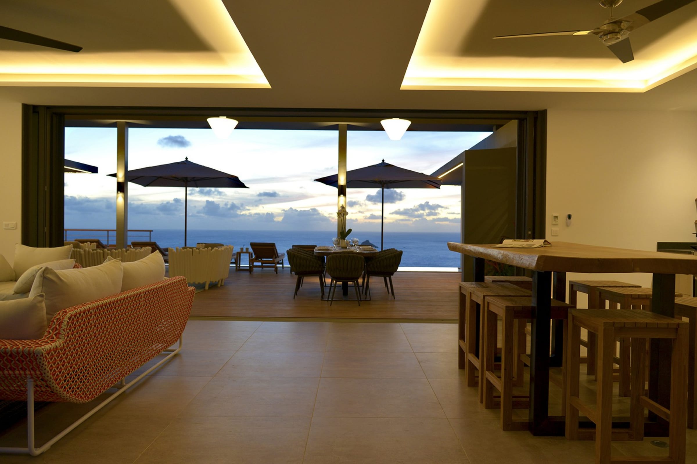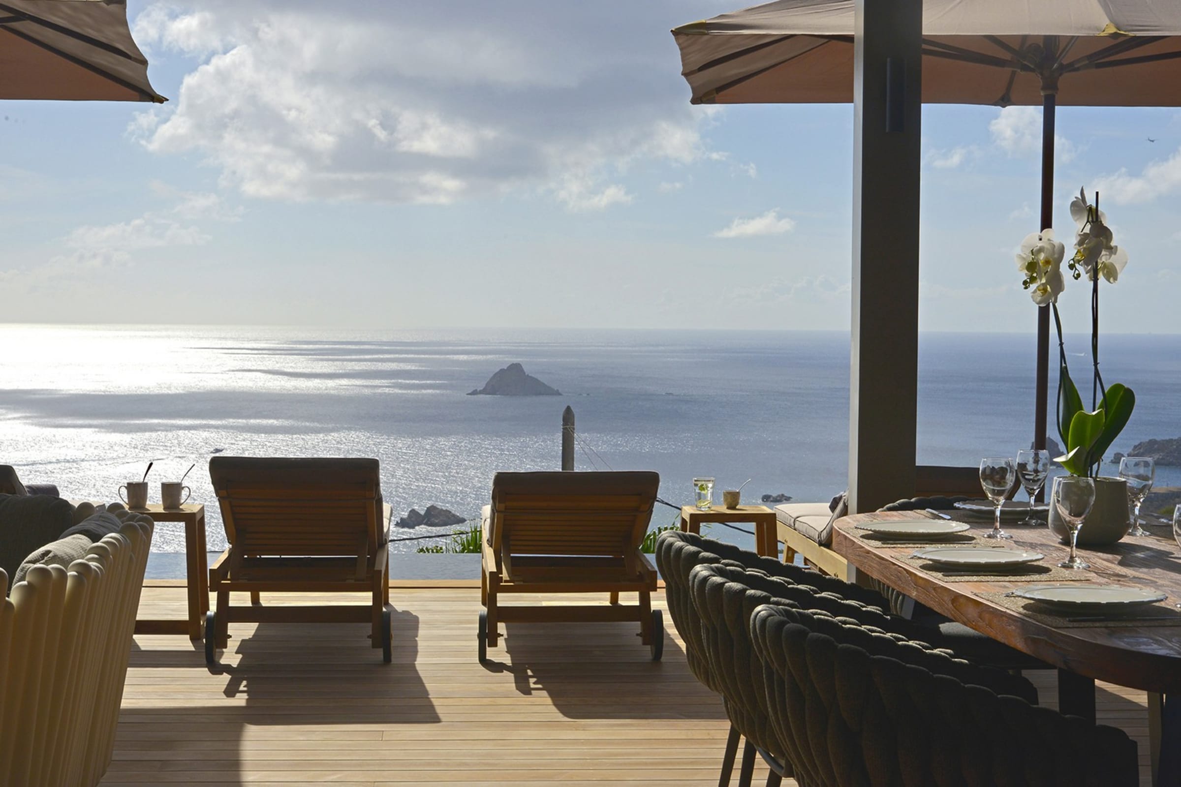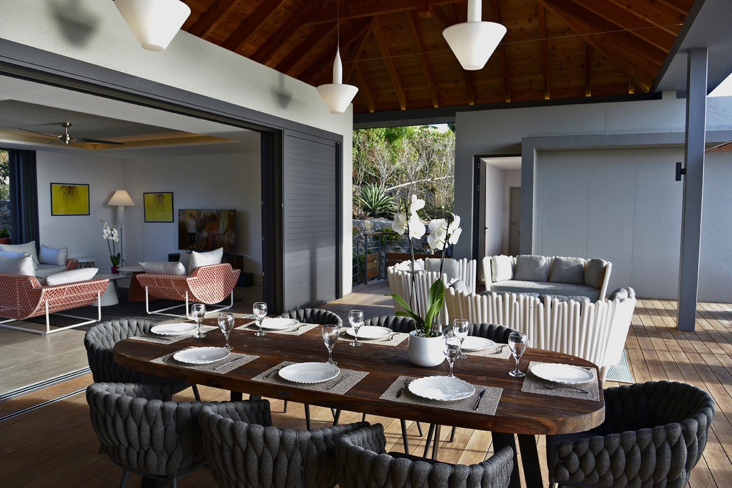 The main terrace offers an impressive 12.5-meter heated infinity pool stretching toward the horizon. With a shaded dining area, outdoor lounge, and sun loungers overlooking the sea, it’s the perfect place to soak up the island’s calm or watch the sunset paint the sky. Garden and lounge area at the back of the property, with a gas barbecue is available for a refreshing moment surrounded by lush tropical greenery.