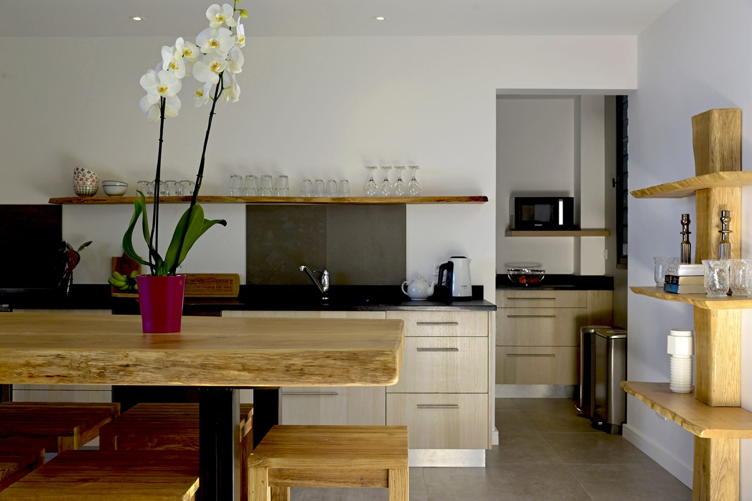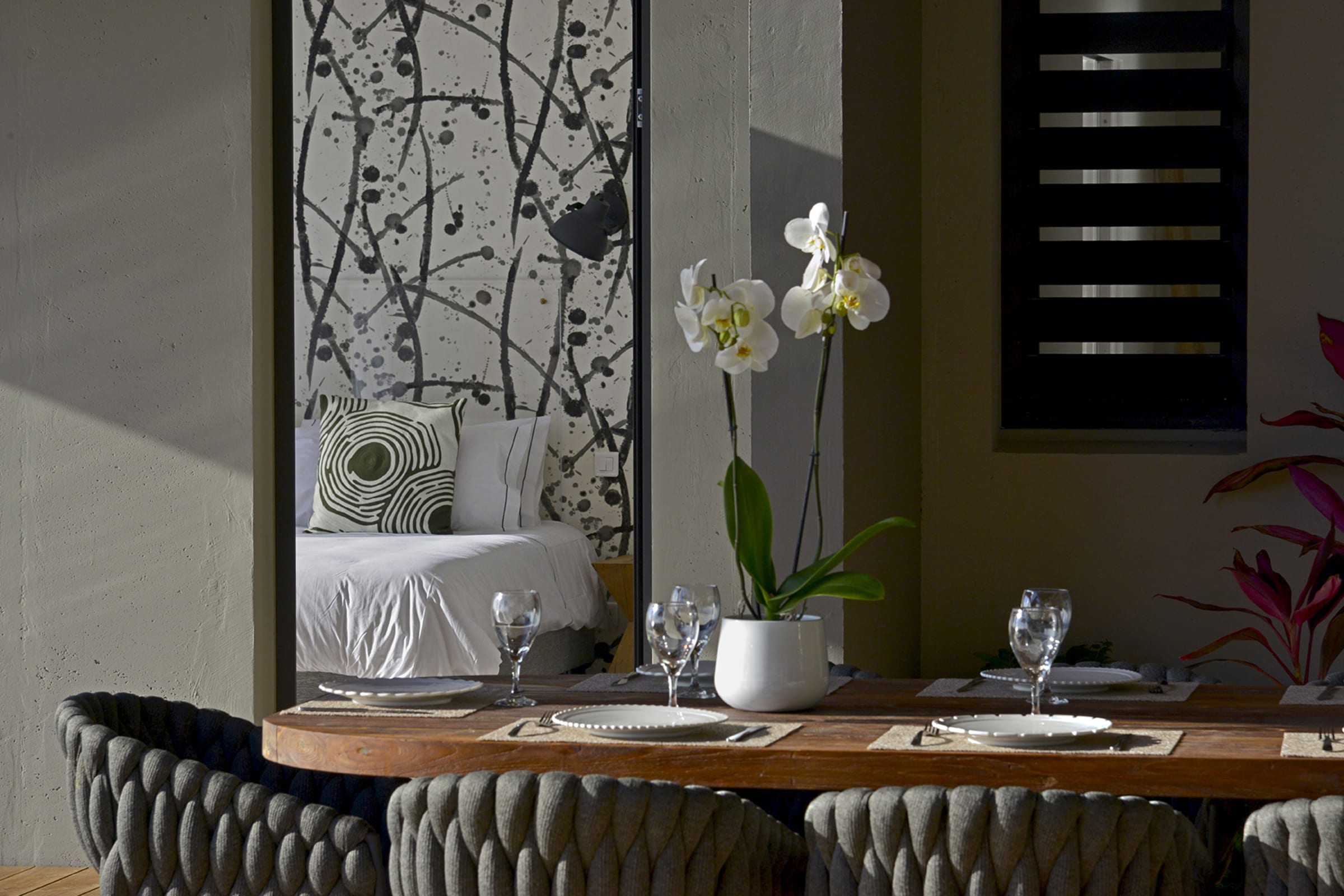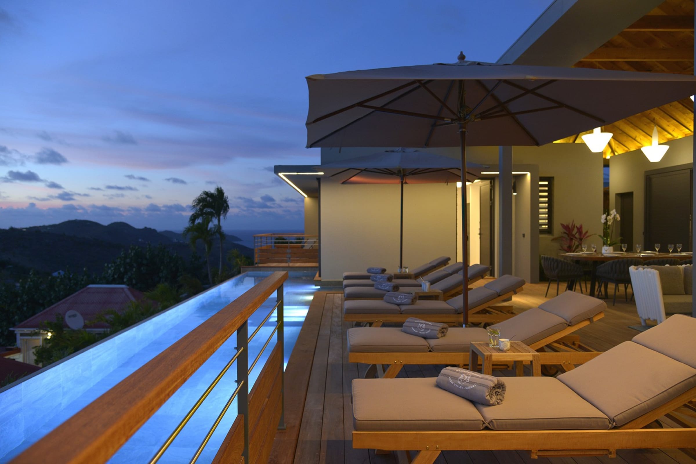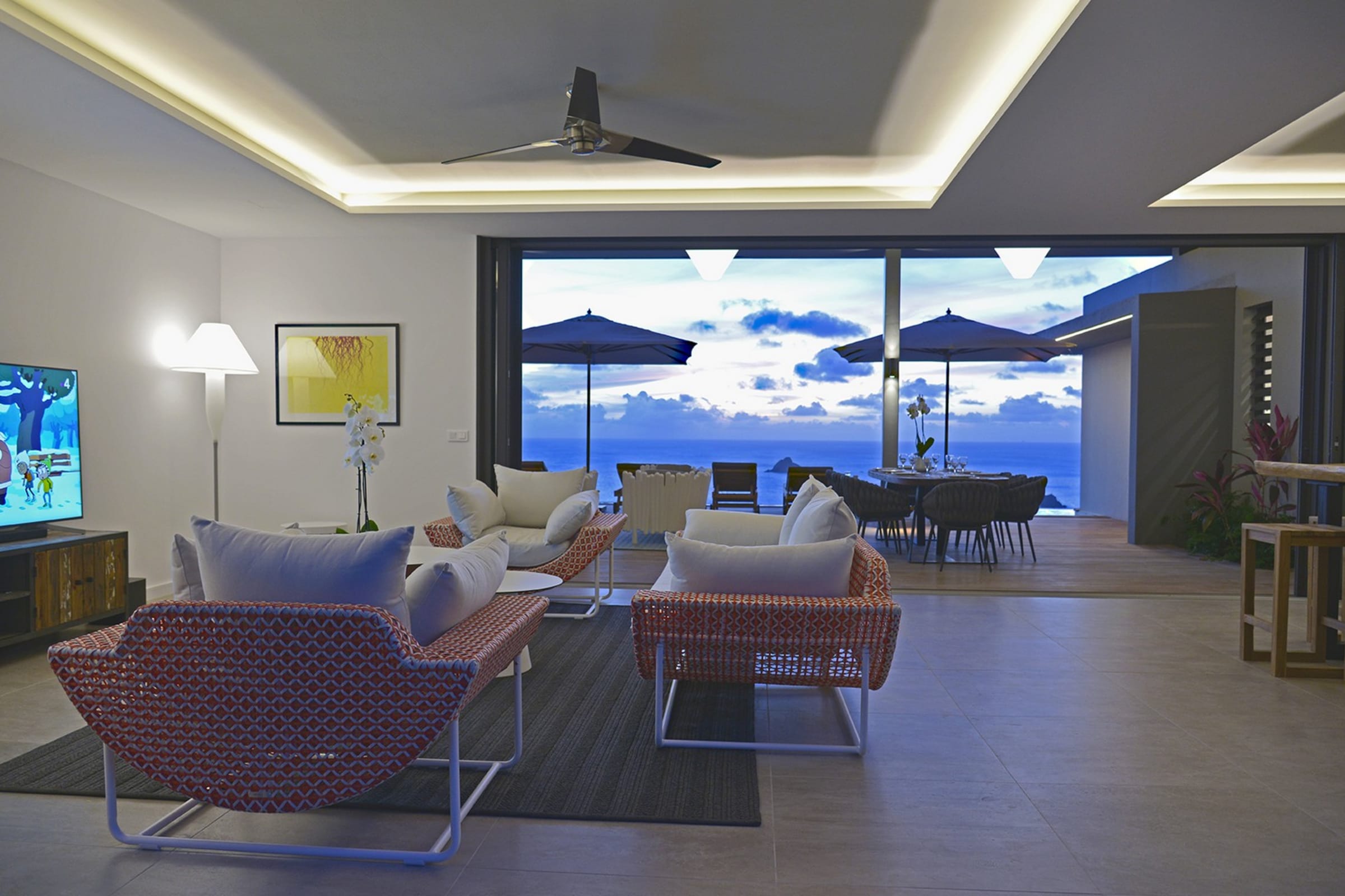 The main terrace offers an impressive 12.5-meter heated infinity pool stretching toward the horizon. With a shaded dining area, outdoor lounge, and sun loungers overlooking the sea, it’s the perfect place to soak up the island’s calm or watch the sunset paint the sky. Garden and lounge area at the back of the property, with a gas barbecue is available for a refreshing moment surrounded by lush tropical greenery.