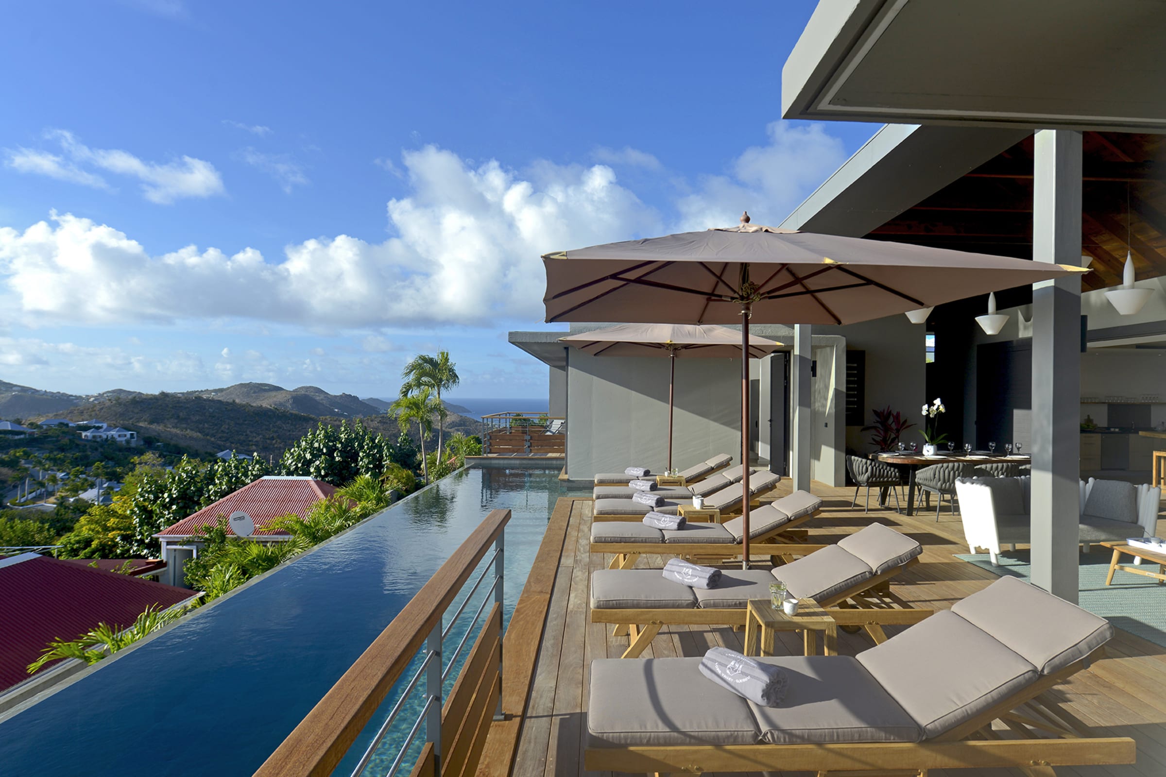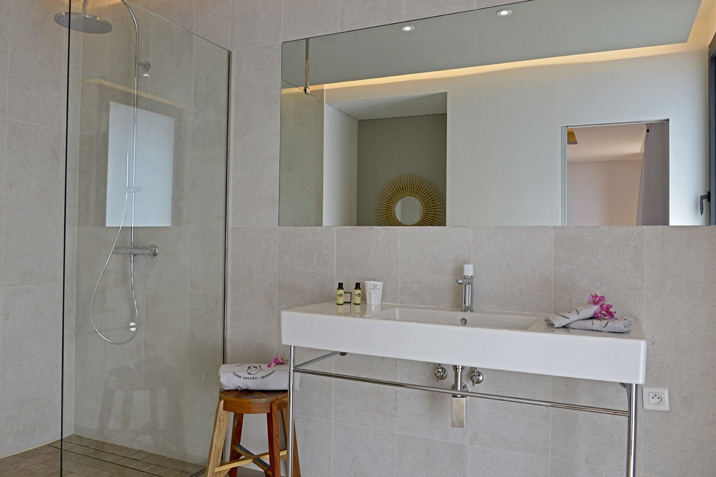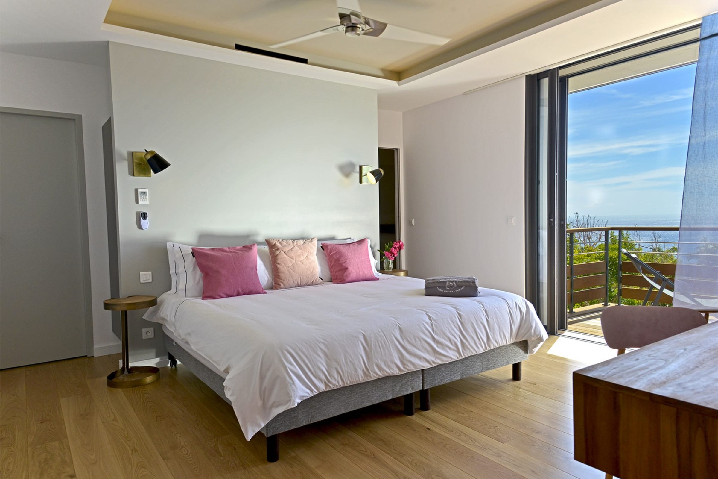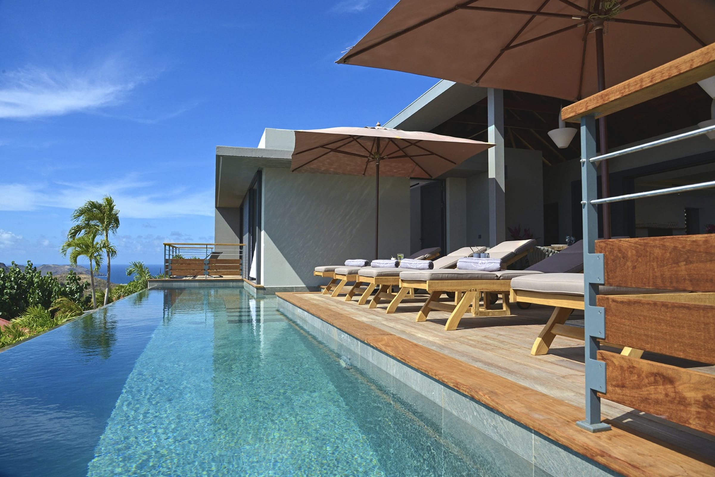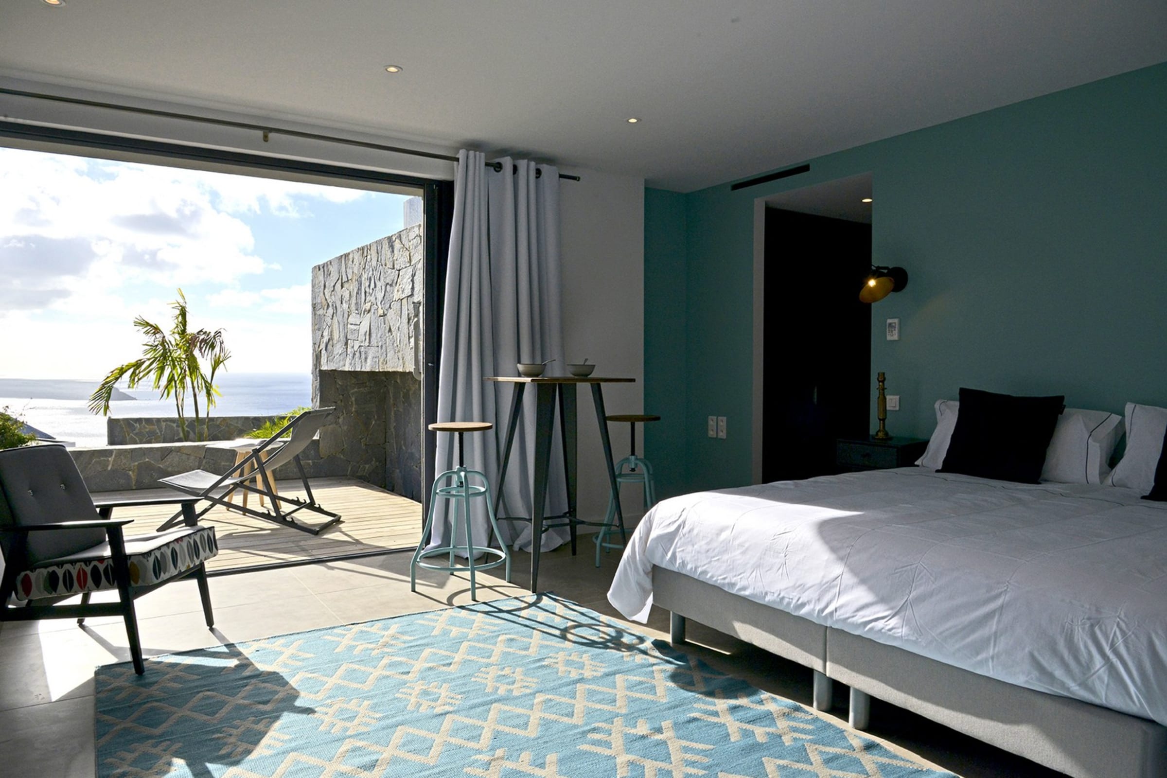 Built over two floors, this luxury villa features 4 air-conditioned master suites with ocean view. Each has king-size beds that can be separated into twins, an en-suite bathroom with walk-in shower and a walkin closet. Three of them are located on either side of the pool, two of which feature a balcony. The fourth bedroom is on the lower level, with a terrace, kitchenette, private entrance, and parking.
