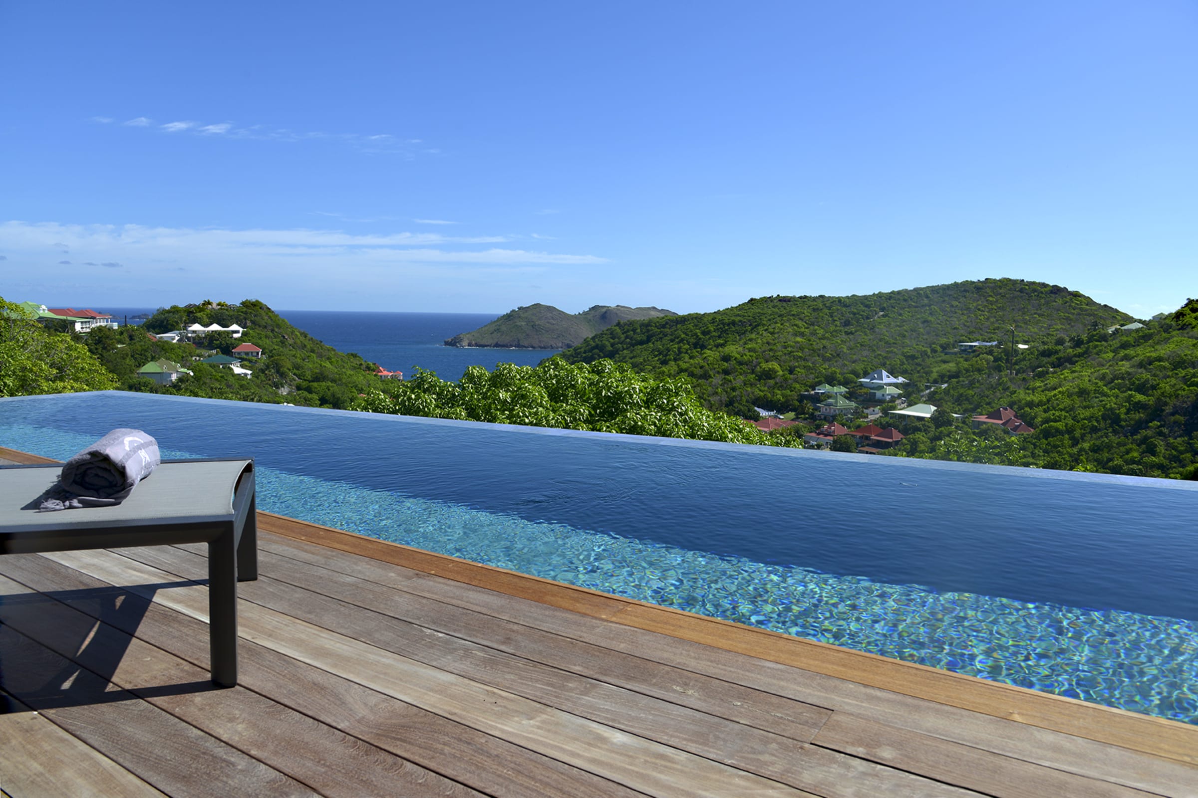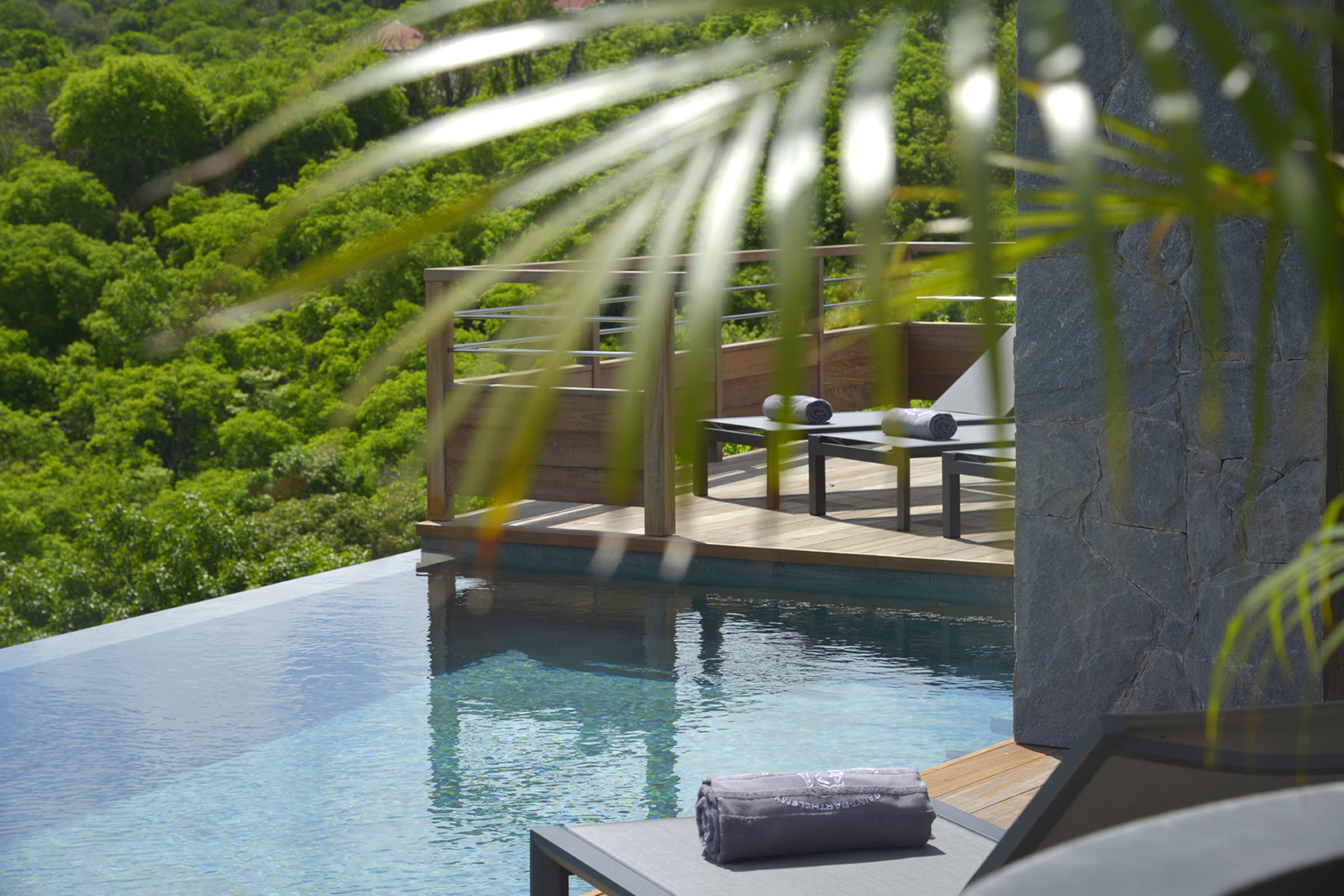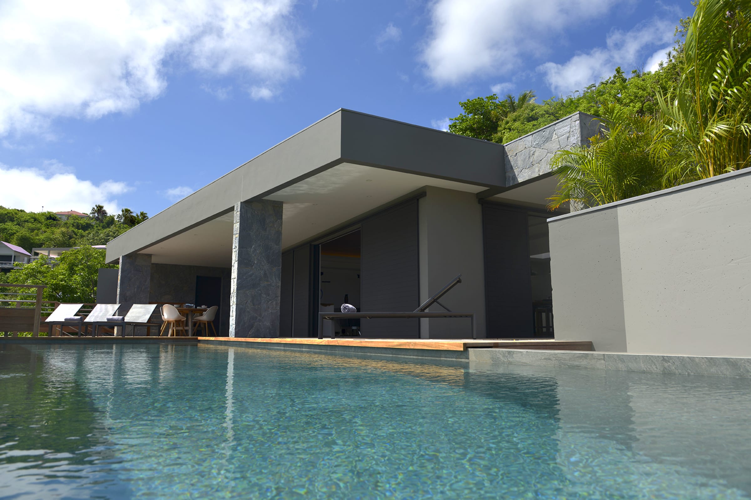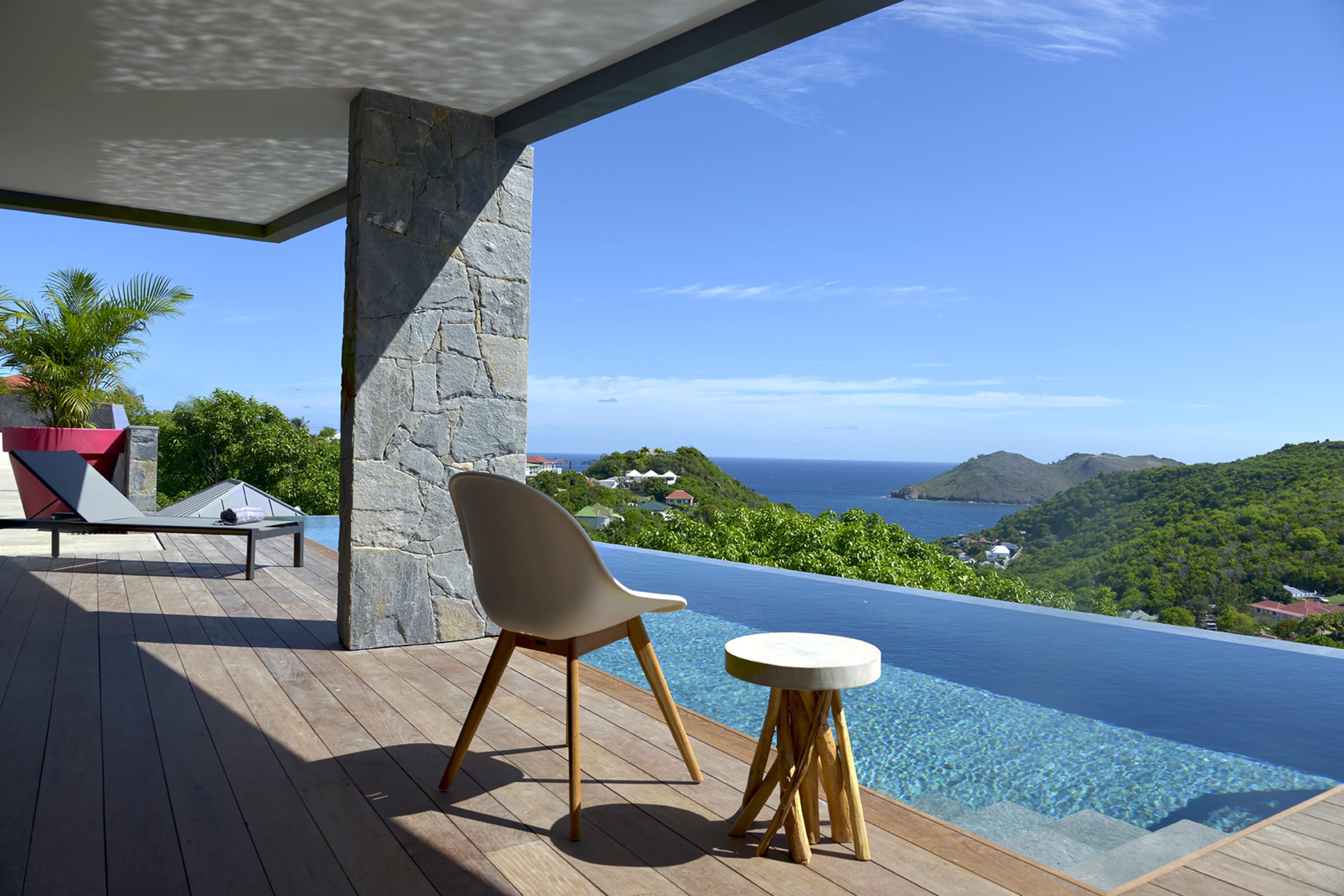 The spacious wooden deck includes a 15m infinity pool, an outdoor nice little dining area and deckchairs— all facing the sea. The perfect place to relax and unwind in peace. Besides, you will have a direct proximity to the sublime beach of Flamands, enjoying delicious moments in the sun, during a game of beach volleyball or snorkeling to observe the seabed.